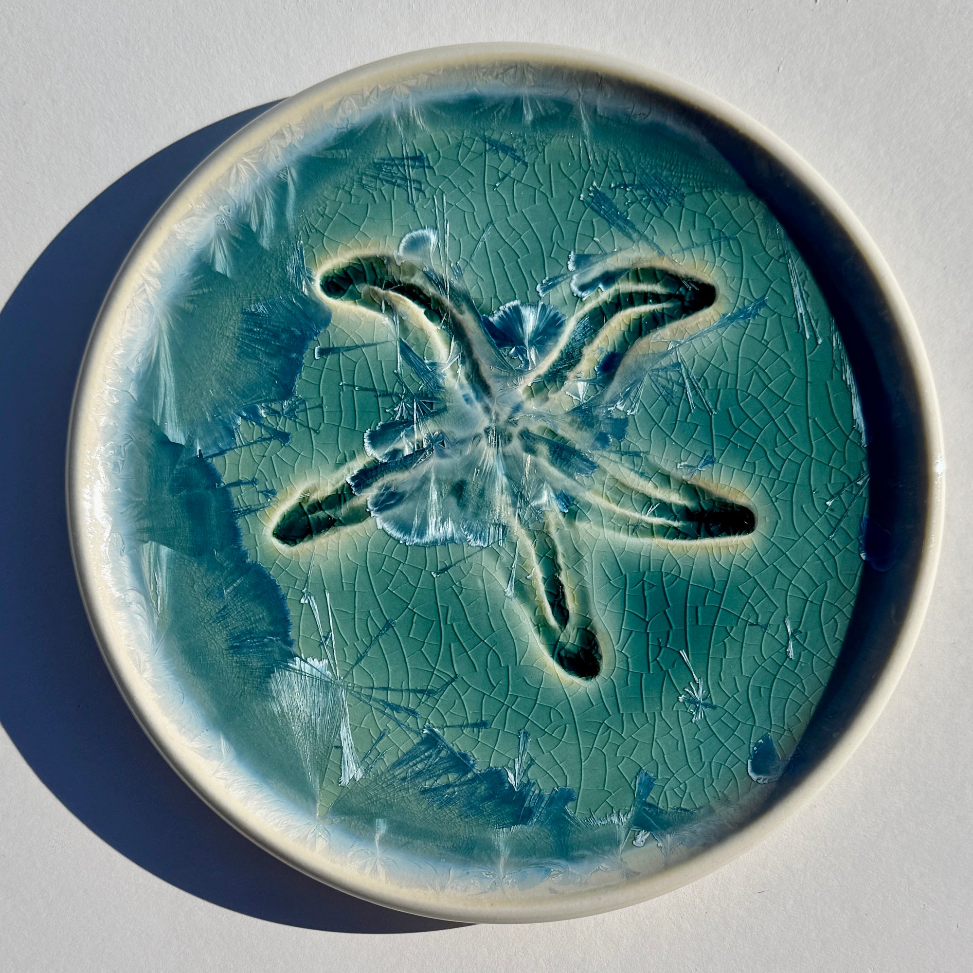 Turquoise crystalline plate with starfish impressed in the porcelain clay.
