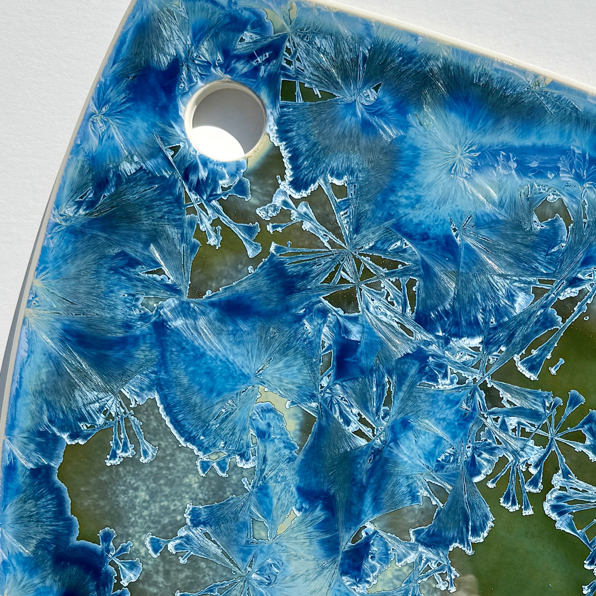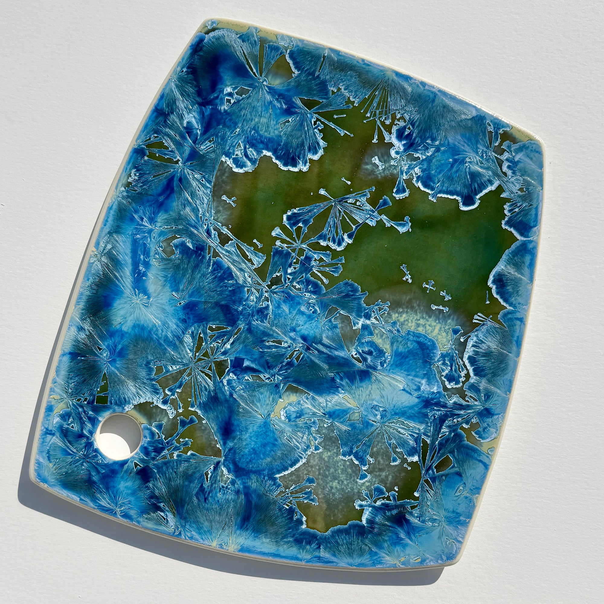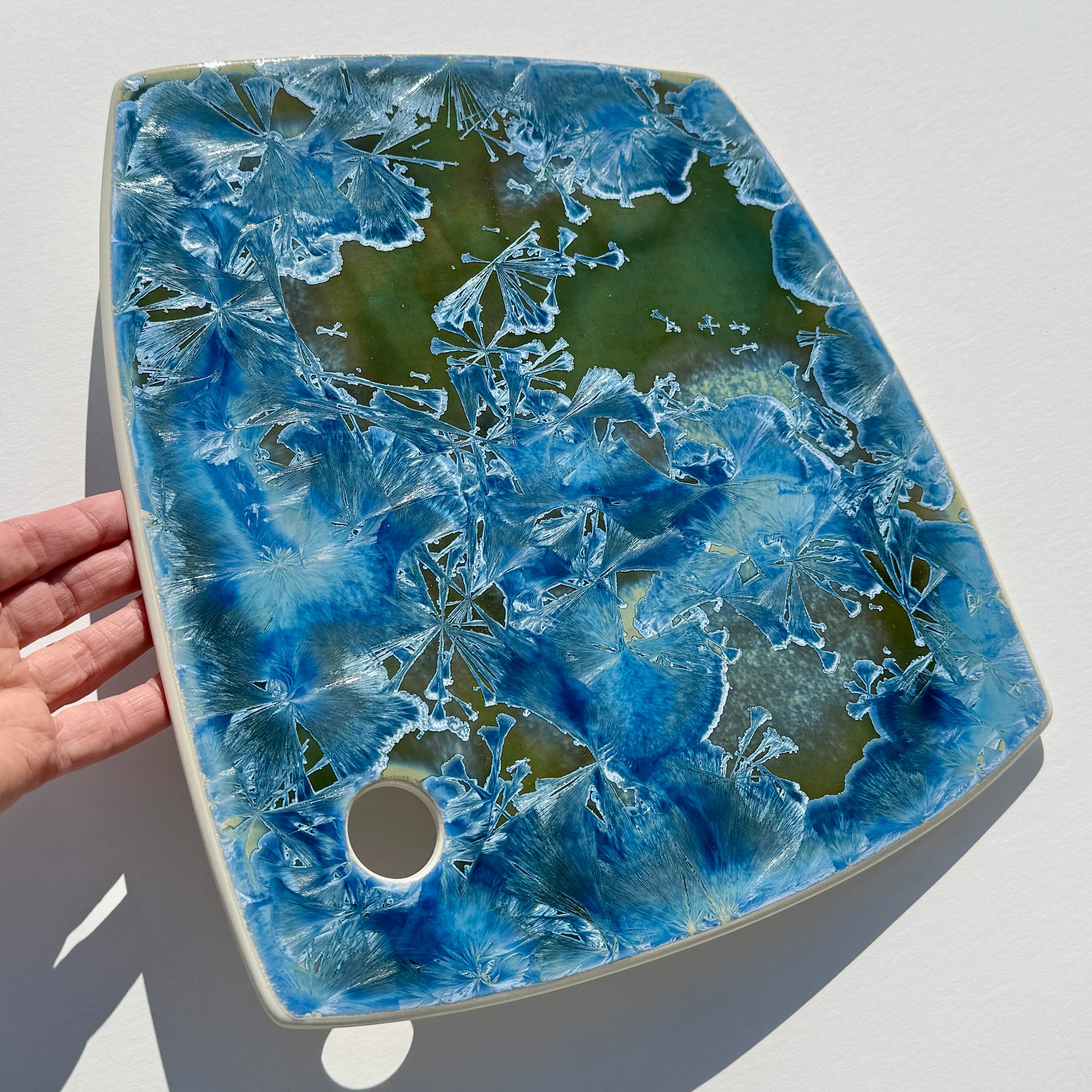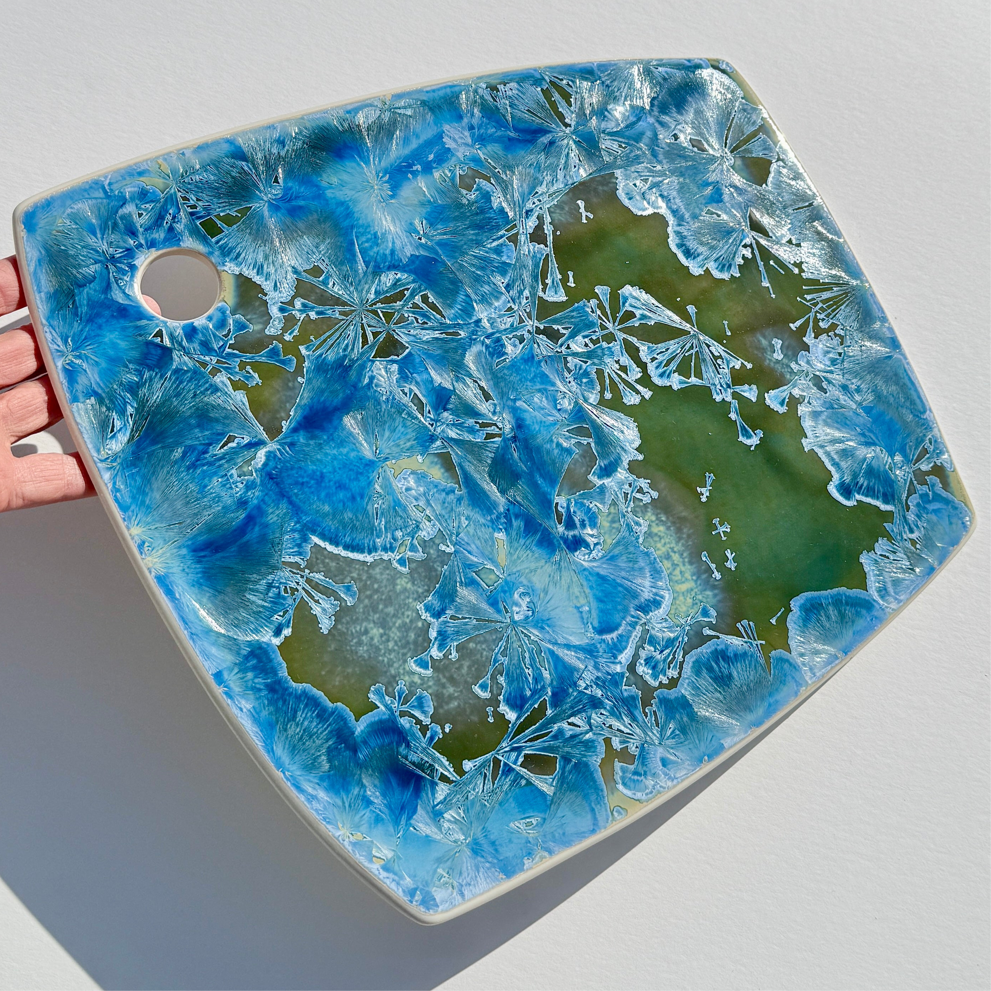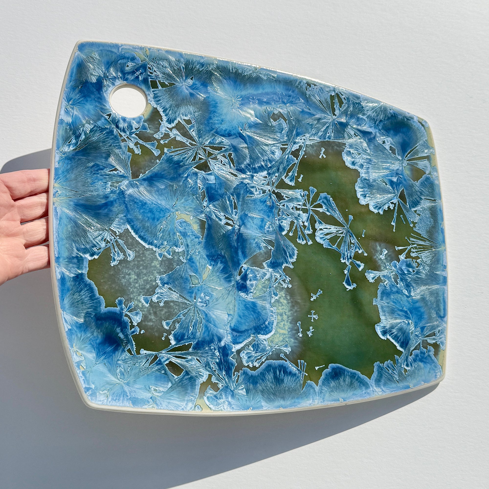 Large, crystalline glazed, turquoise charcuterie platter measuring approximately 34 by 29 centimetres.