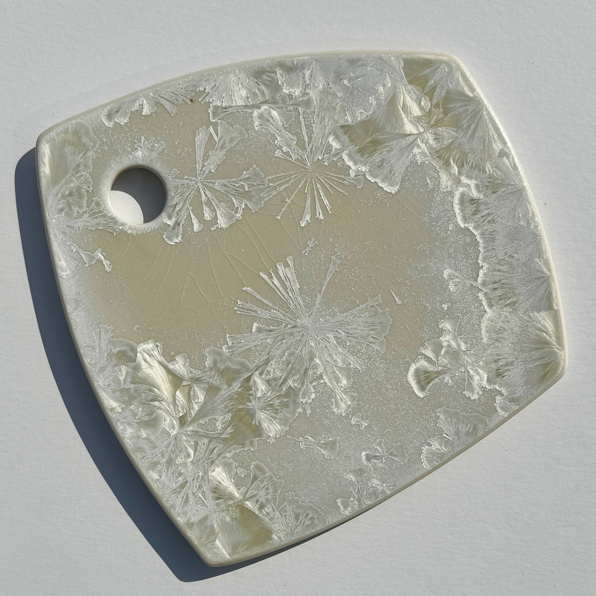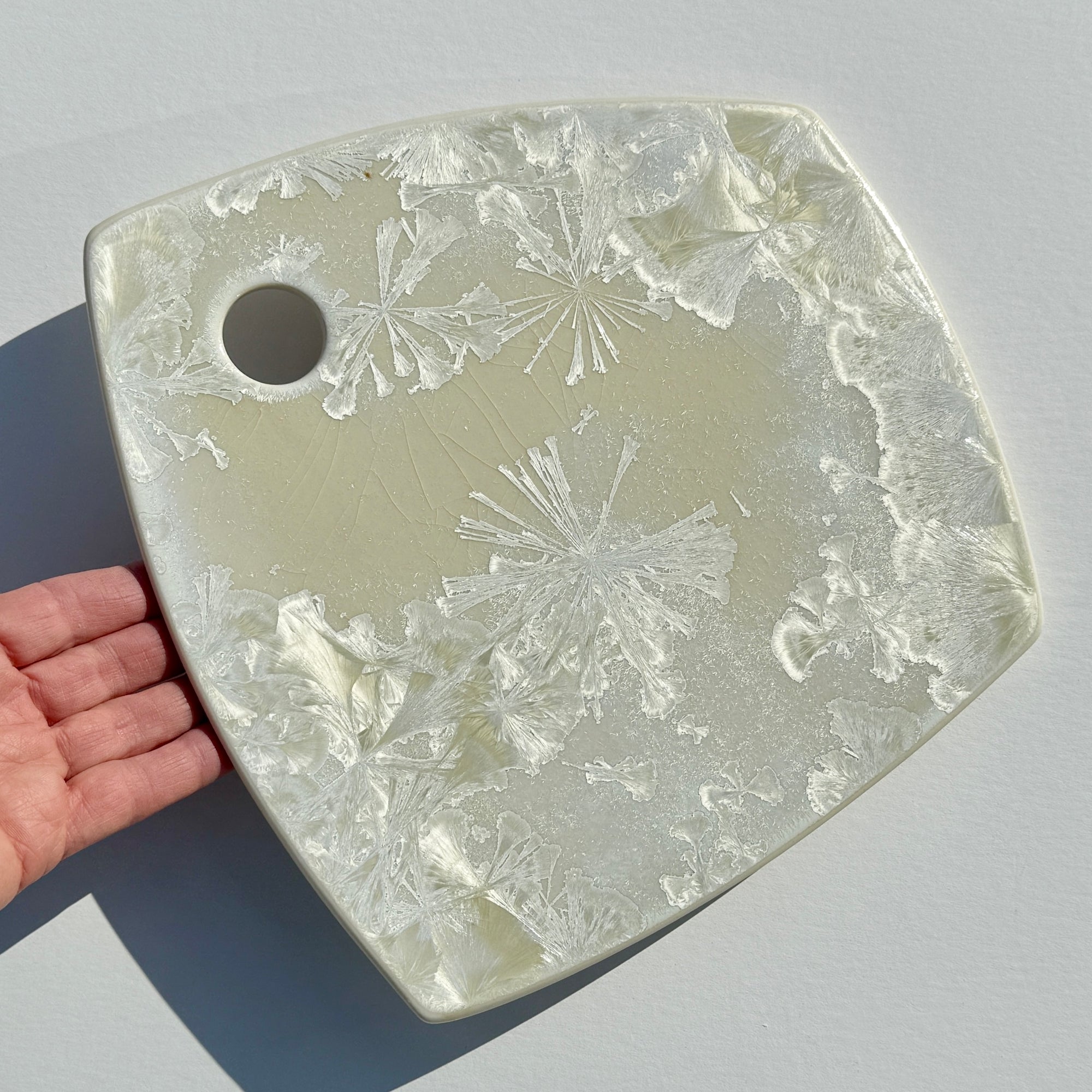 This crystalline glazed white charcuterie platter measures approximately 25 by 24 centimetres.