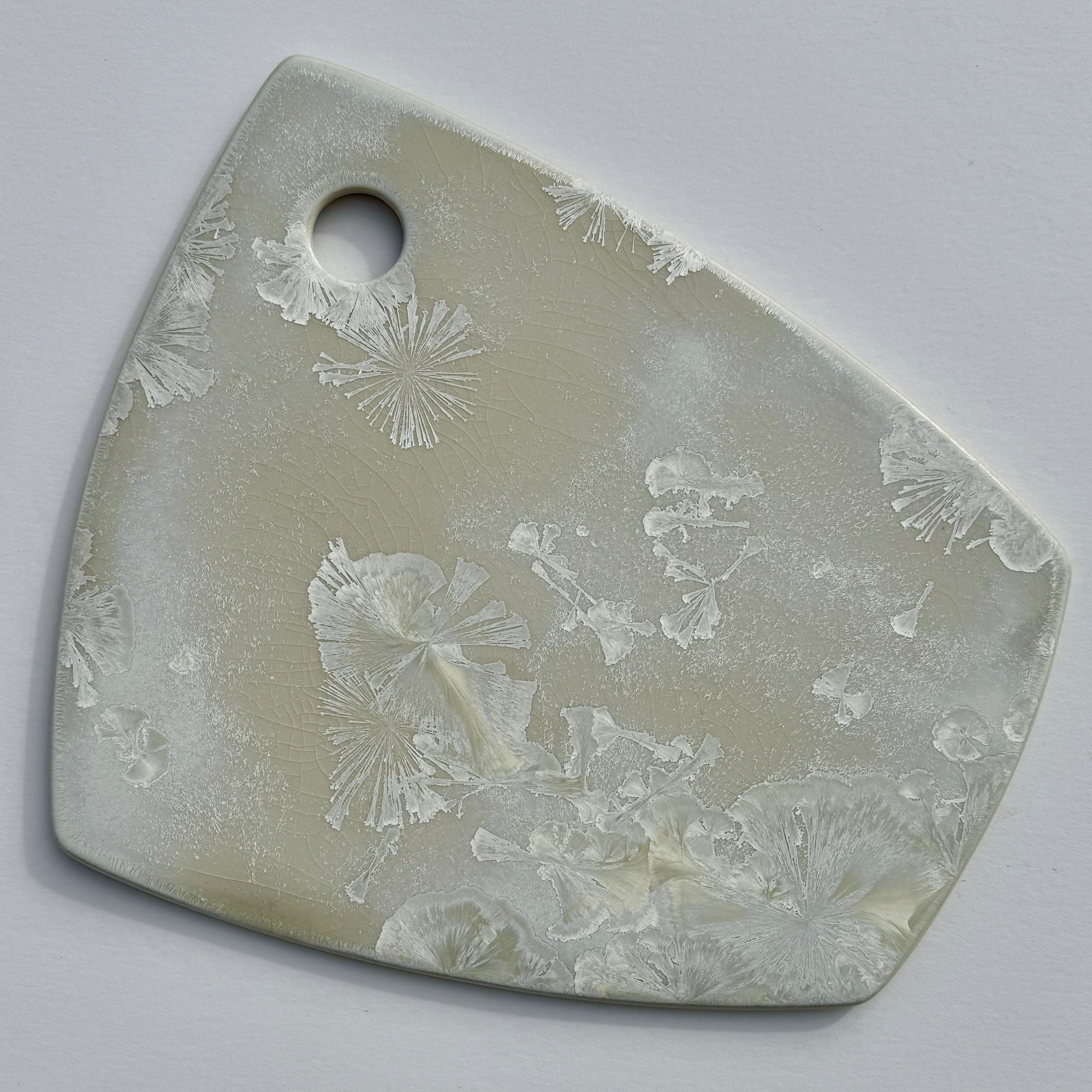 This crystalline glazed white charcuterie platter measures approximately 31 by 25 centimetres.
