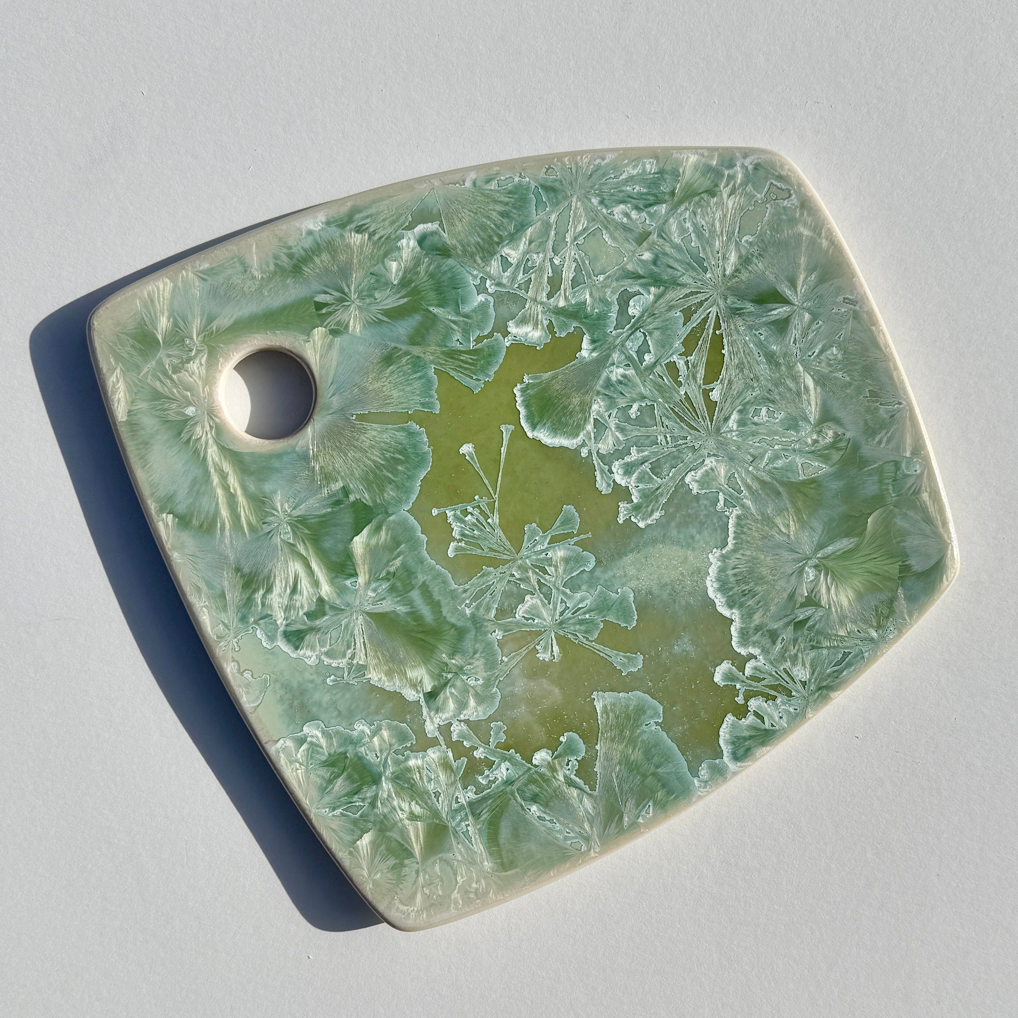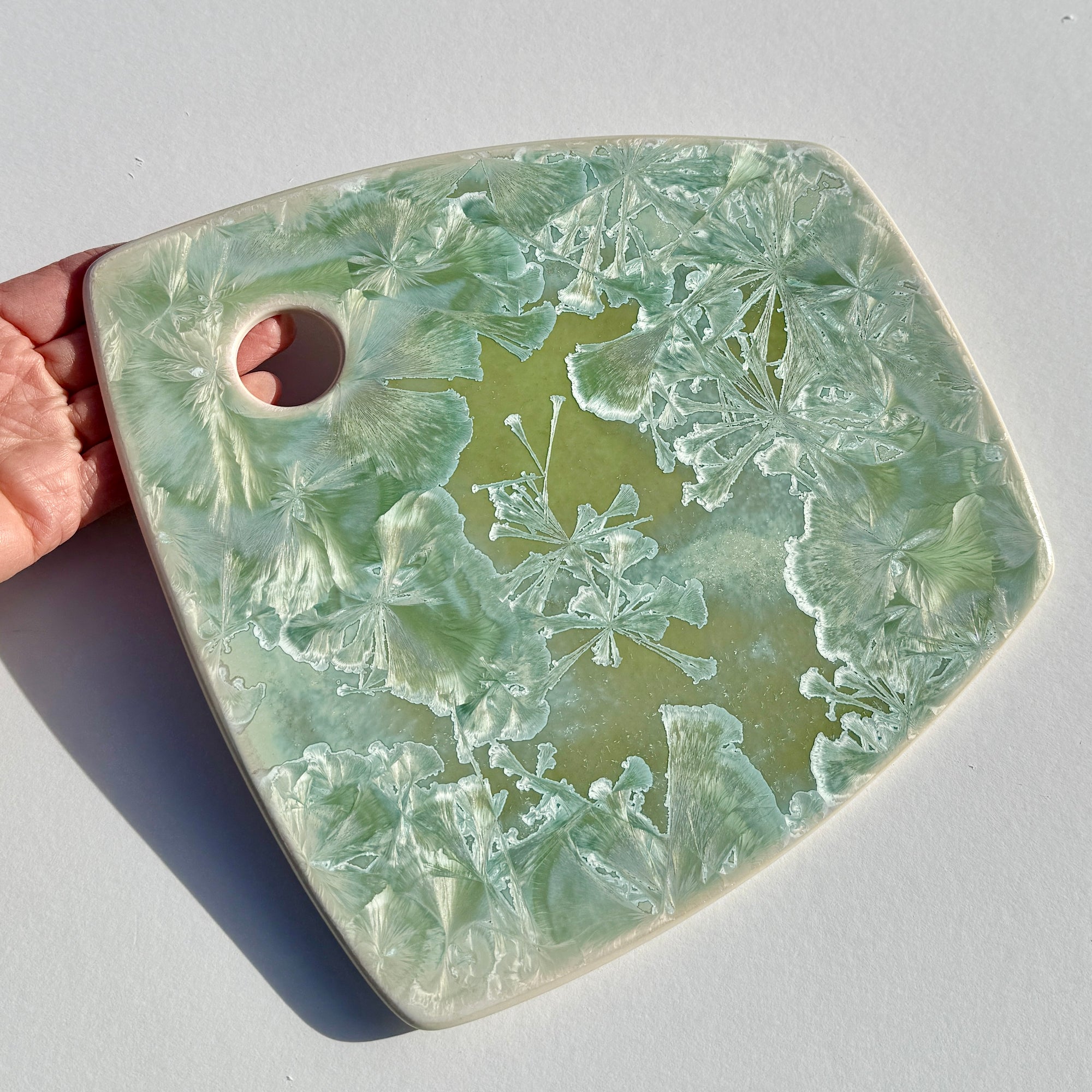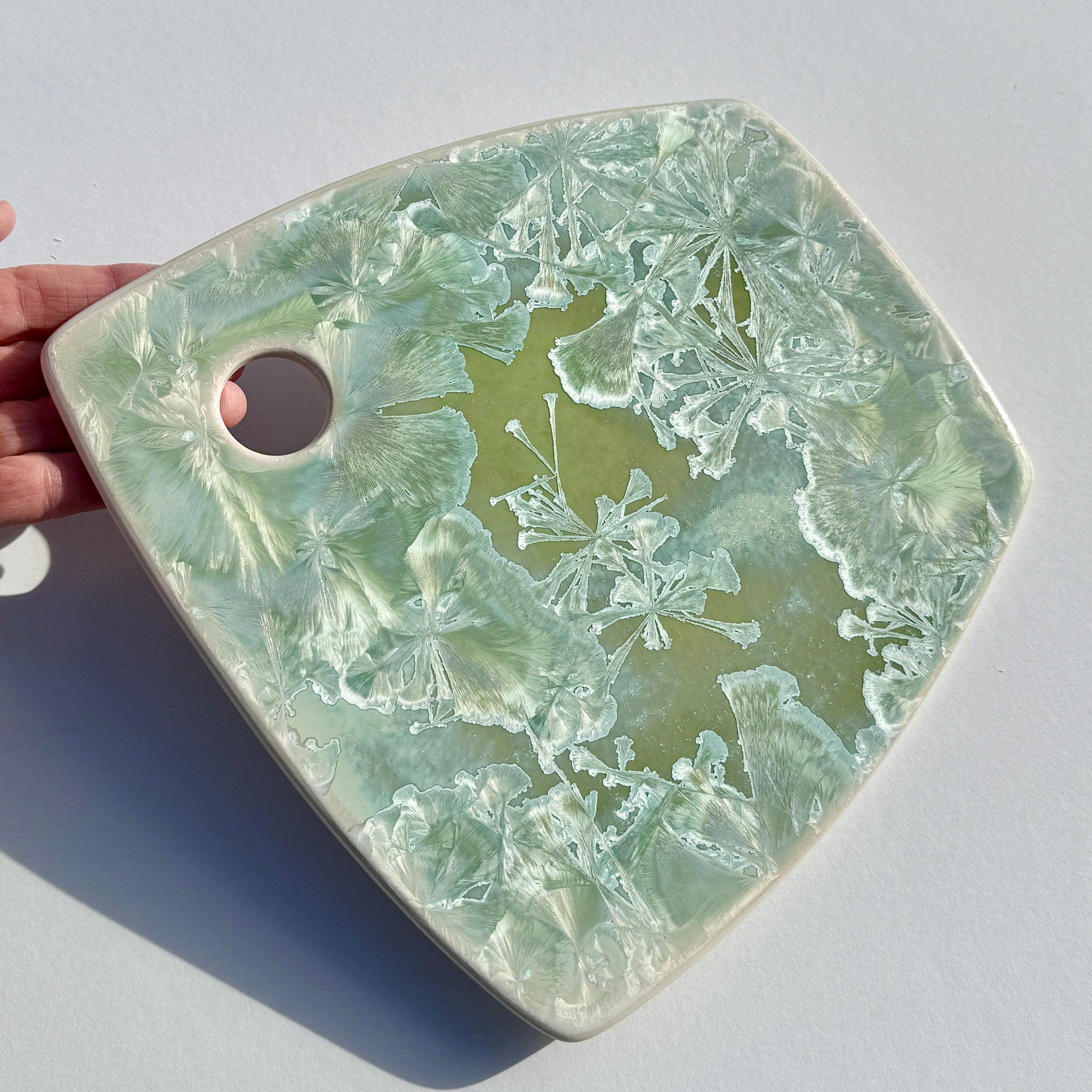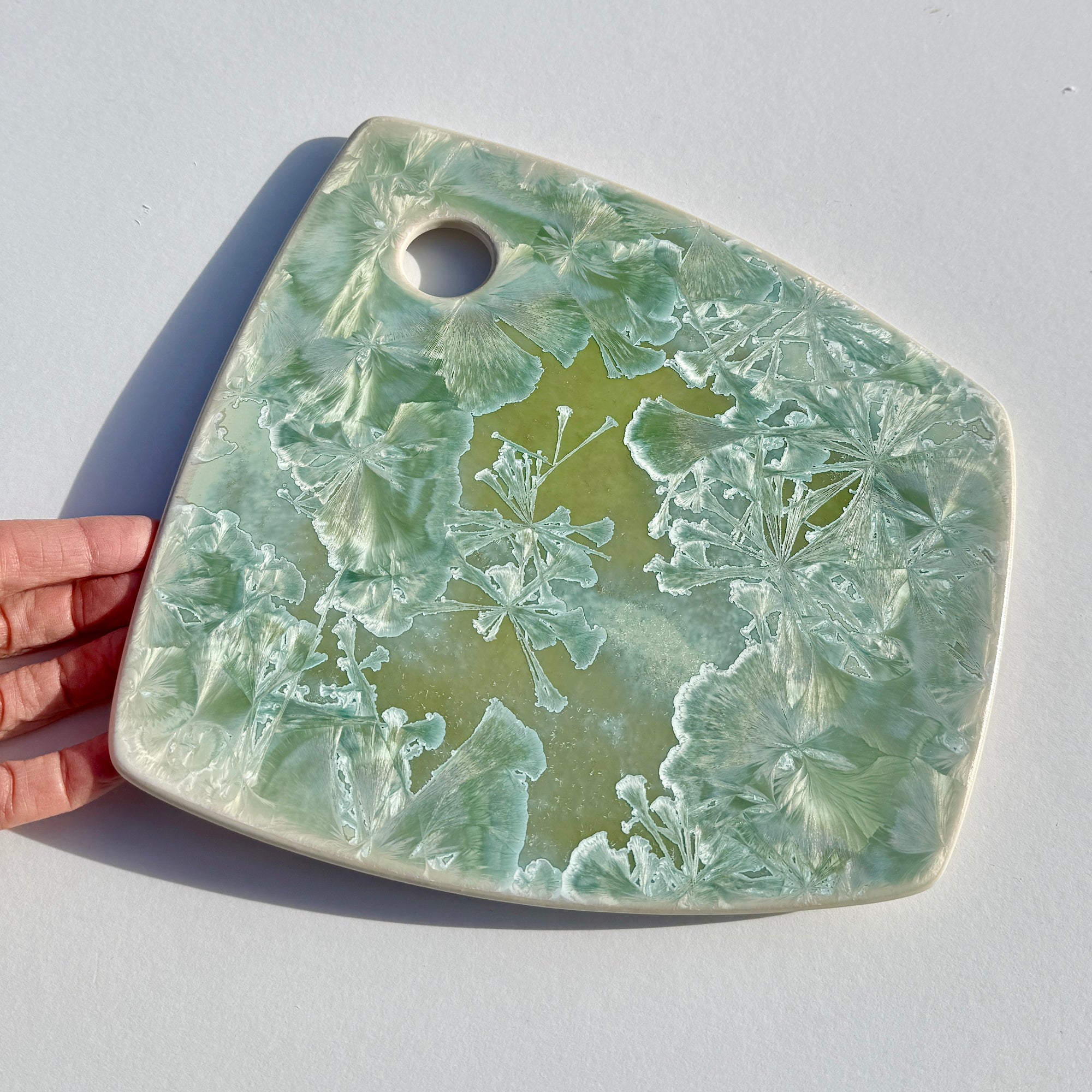 This crystalline glazed, green charcuterie platter measures approximately 24 by 22 centimetres.