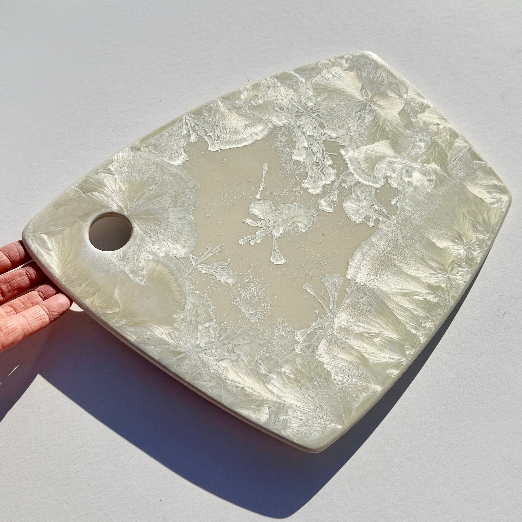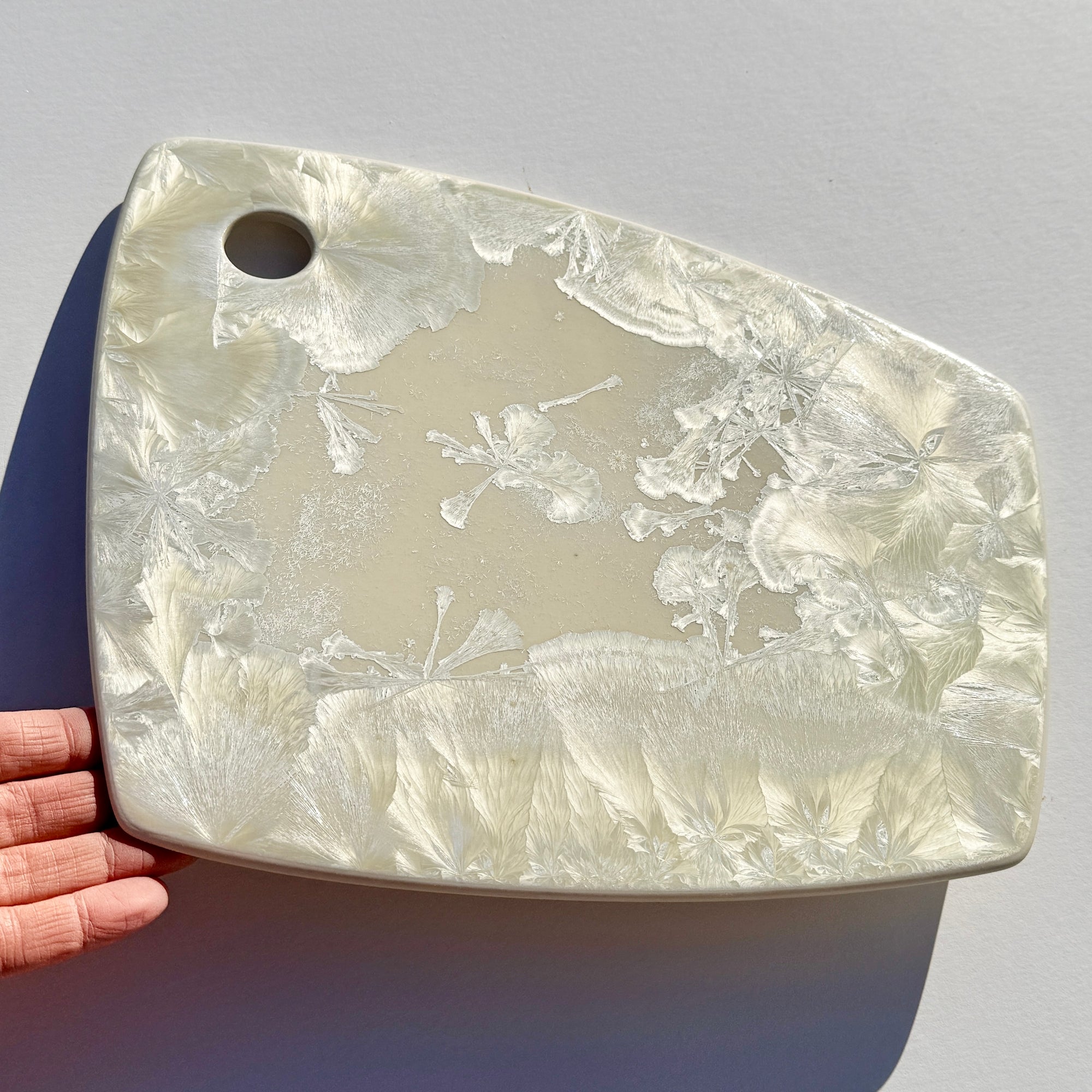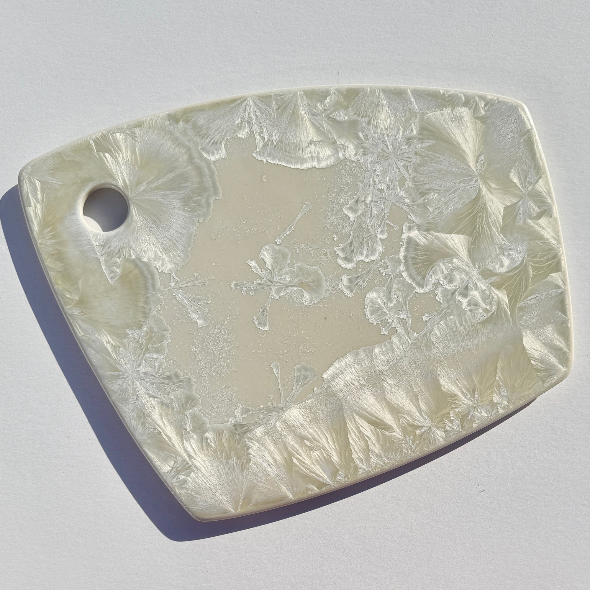 This crystalline glazed white charcuterie platter measures approximately 31 by 25 centimetres.