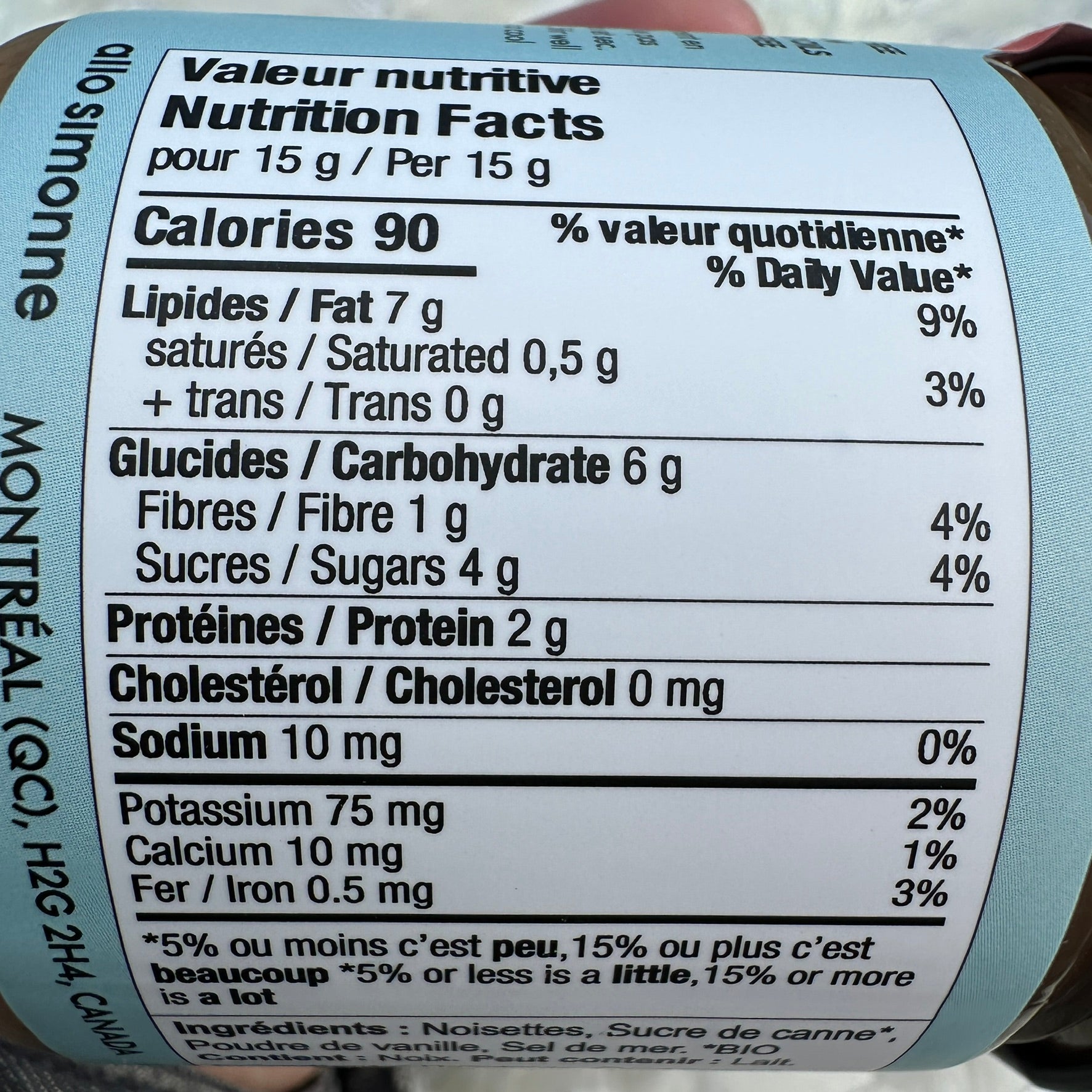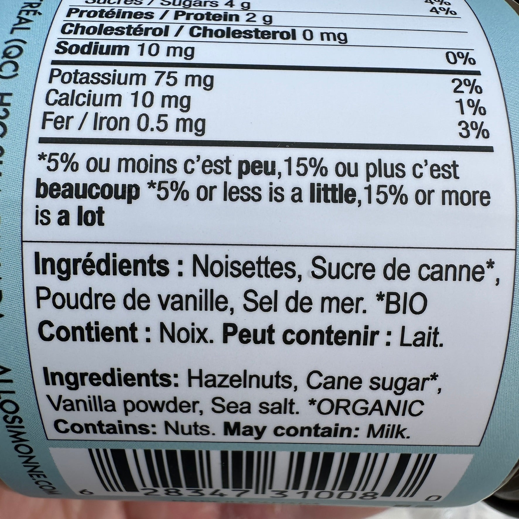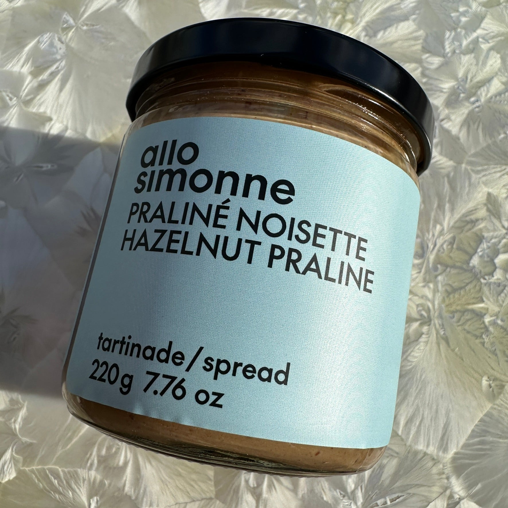 No chocolate, just hazelnut praline! This spread is made with only hazelnuts, caramelized sugar, vanilla, and sea salt. This is a thick, sauce-like spread with delicious little crunchy pieces of praline for texture.