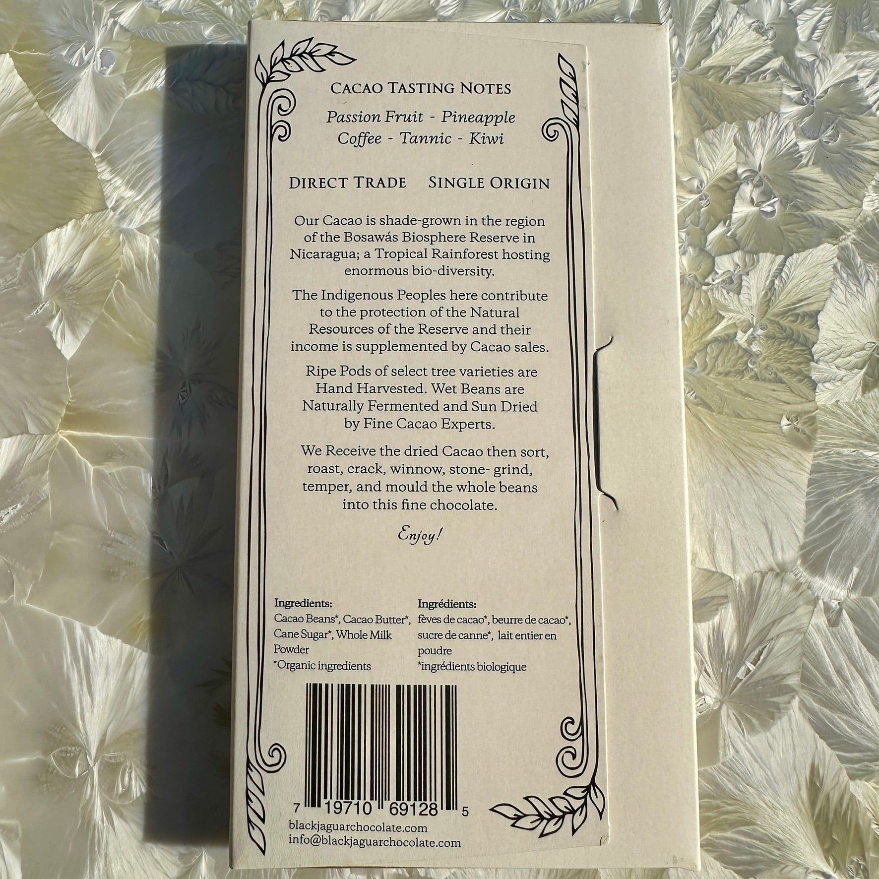 We then follow the traditional practices of gently toasting, winnowing, and stone-grinding the beans; preserving the complex fruity and floral flavours.