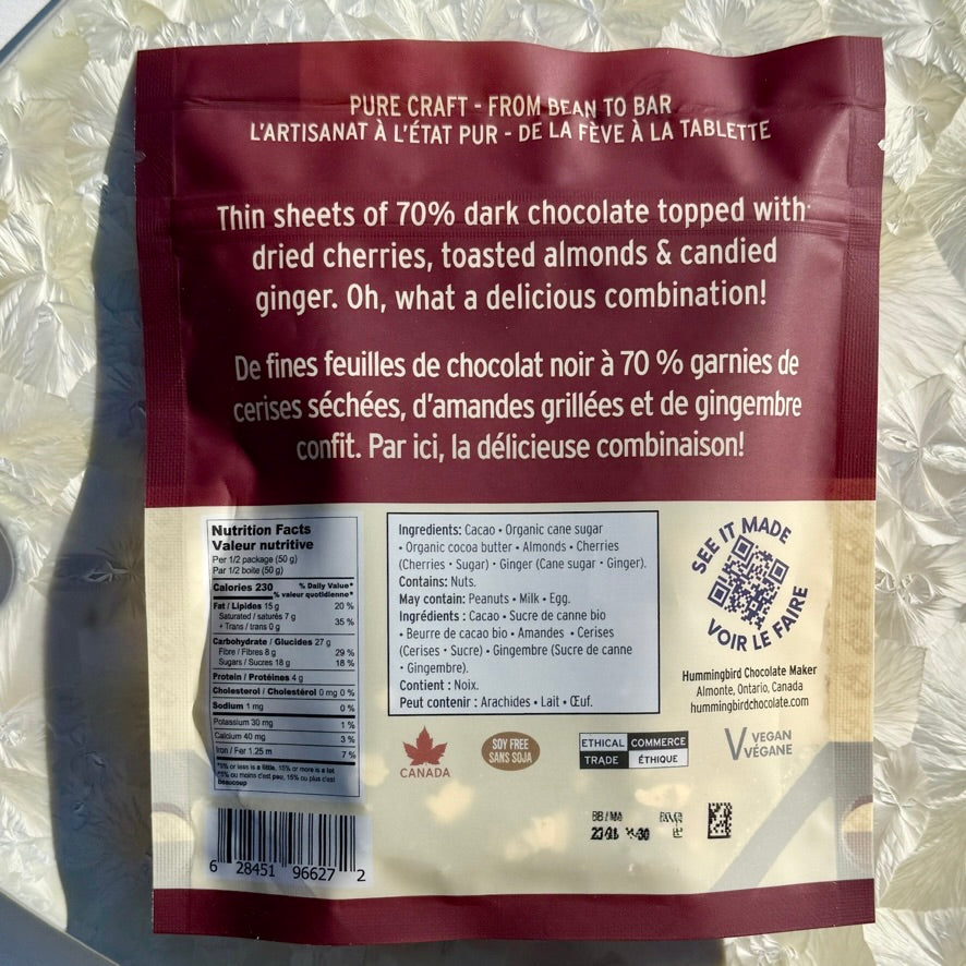 Bark with a little bite! Dried cherries, candied ginger and freshly toasted almonds top our 70% single origin dark chocolate. A festive favourite!
