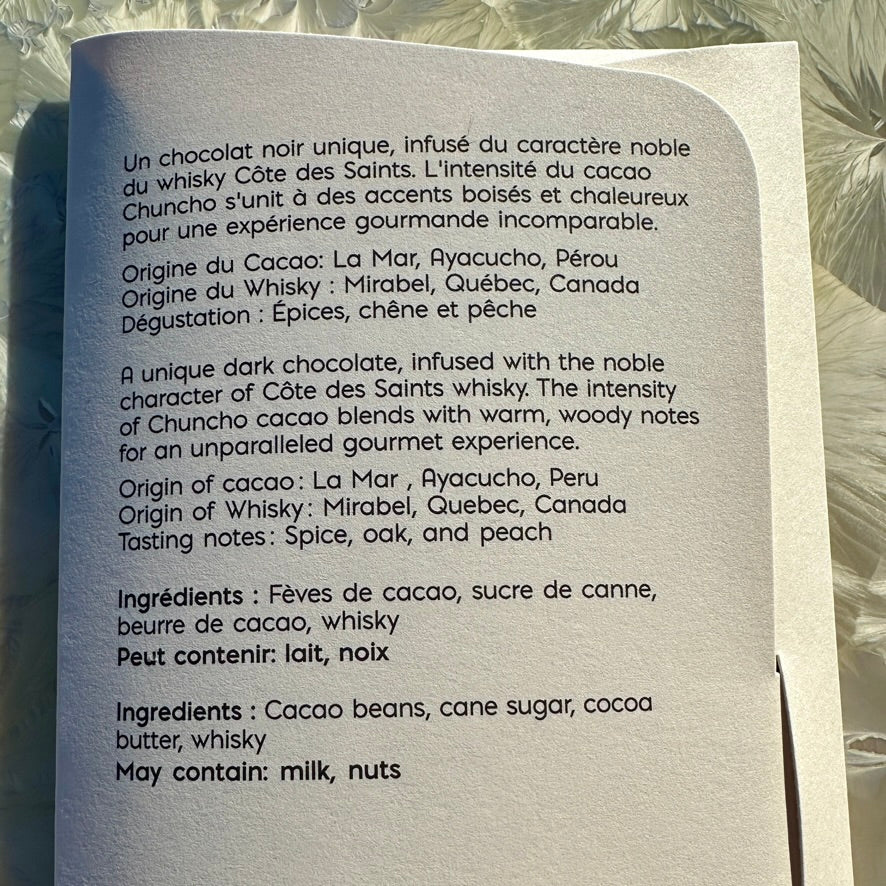 75% Chuncho dark chocolate infused with single malt whisky from Côte-des-Saints.