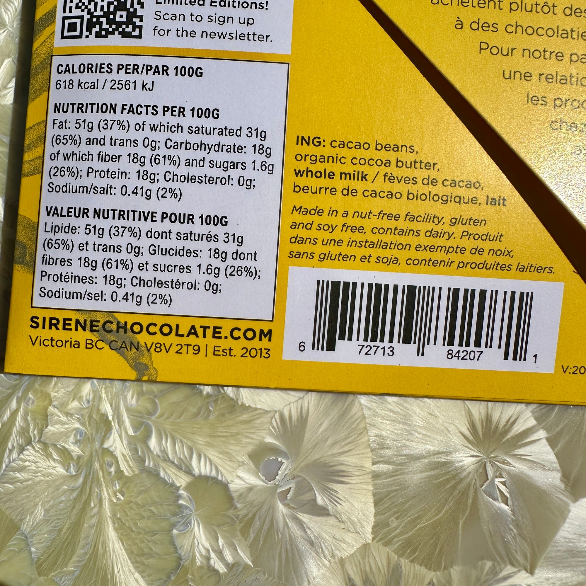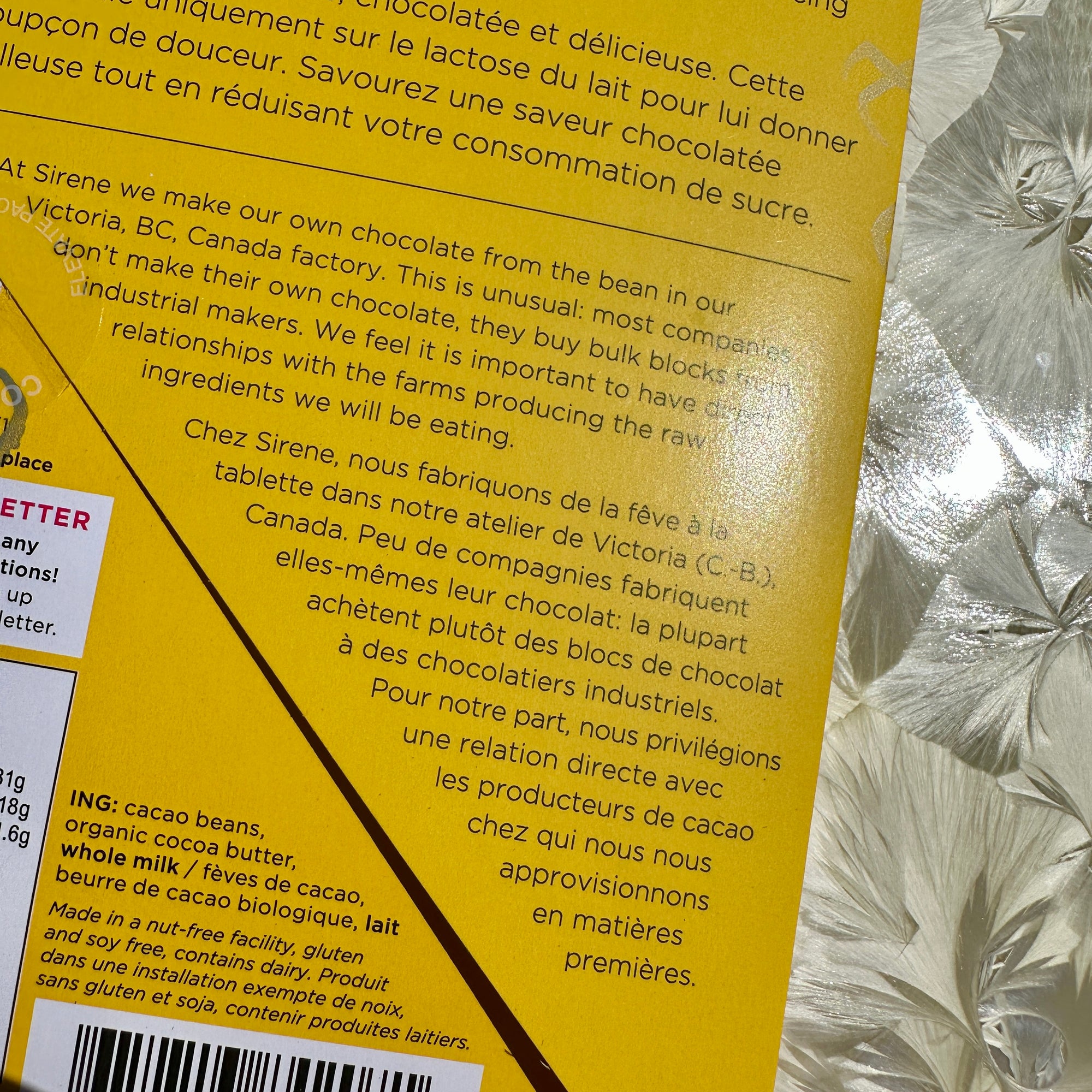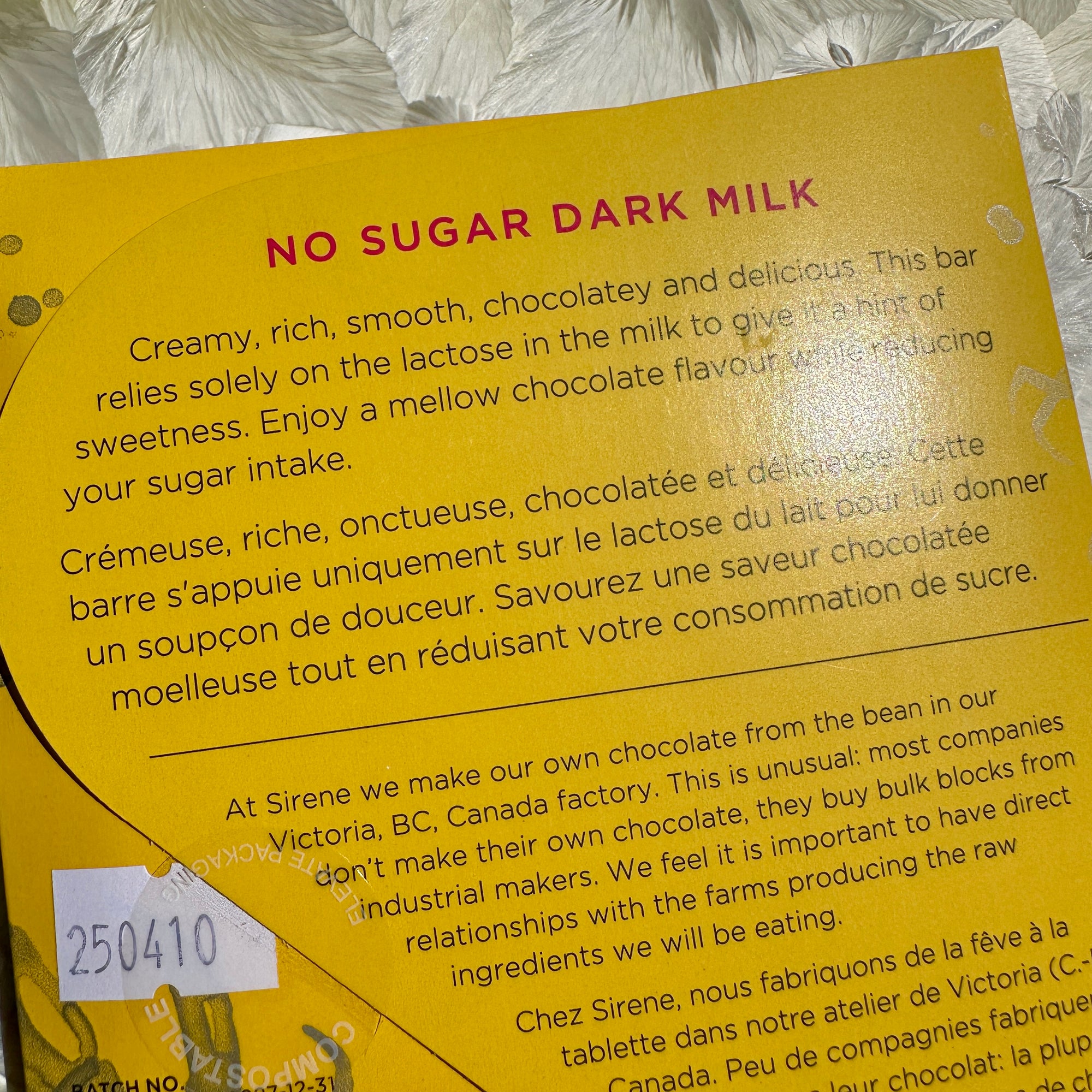Creamy, rich, smooth, chocolatey and delicious, with a hint of natural sweetness coming from the lactose in the milk. This bar is made as a 65% dark - so the only ingredients are 65% cocoa beans and 35% milk.