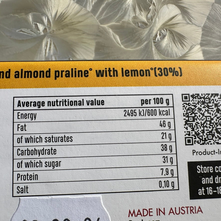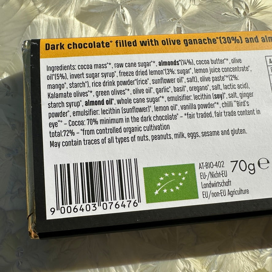 The ultimate tender-melting olive layer made from green olives, olive oil and chocolate. The olive flavour is quite subtle, but it’s the incredibly smooth melt that’s surprising. Sitting on top is a layer of almond praline with refreshing, crispy bits of lemon, and the whole thing is coated in dark chocolate, and entirely vegan.