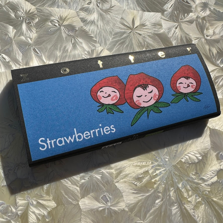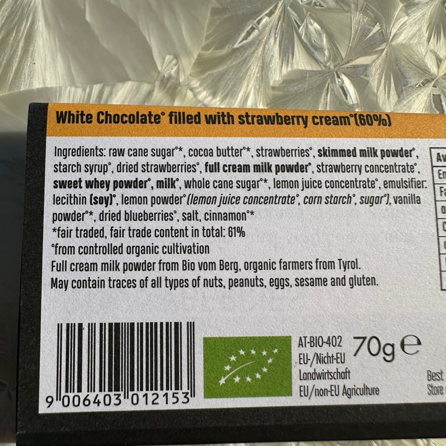 For berry fans big and small: a sweet white chocolate filled with a sublime, fragrant strawberry mousse made from a fruity mix of strawberries, strawberry couverture, blueberry couverture, pure cocoa butter and a happily tangy dash of lemon. Strawberry fields forever …