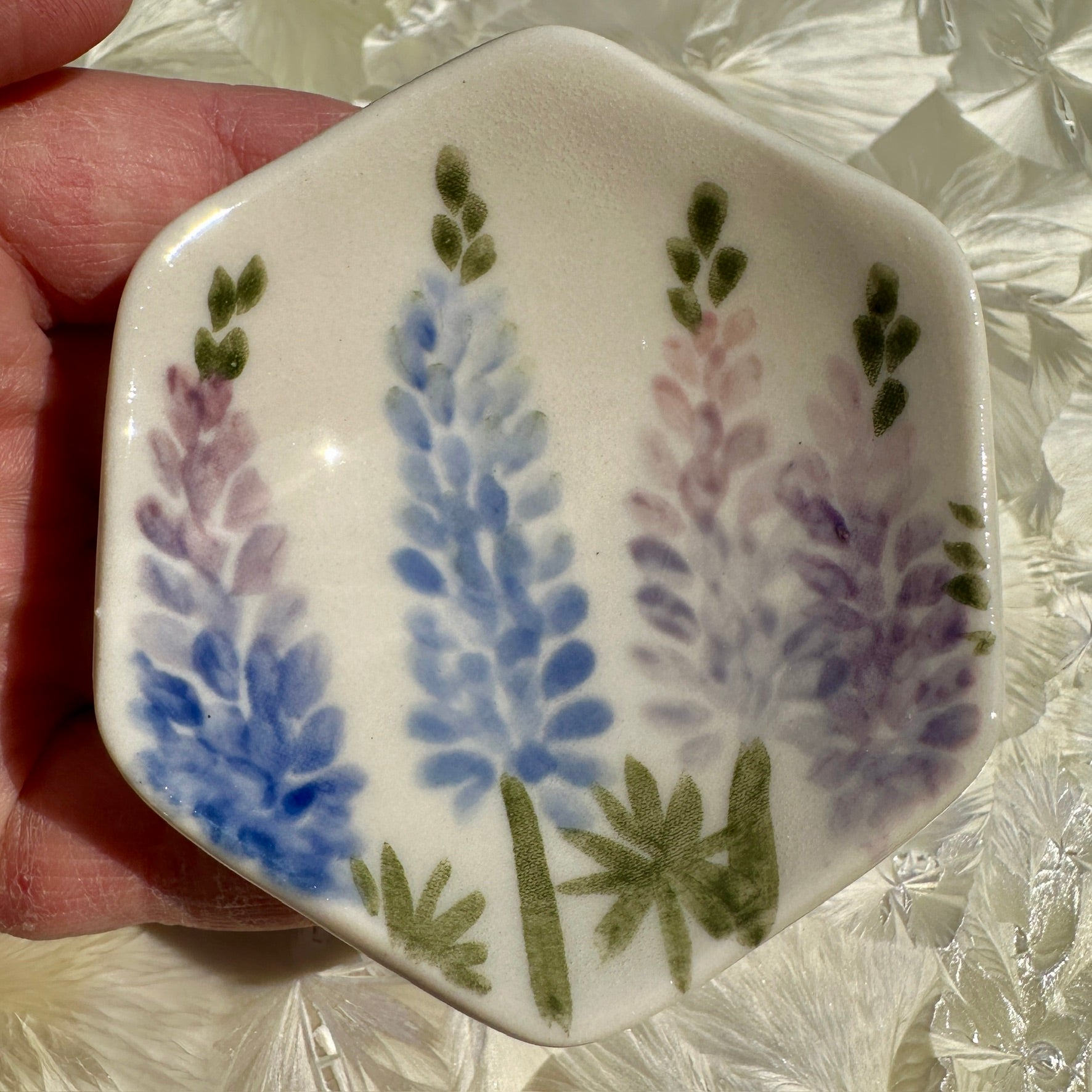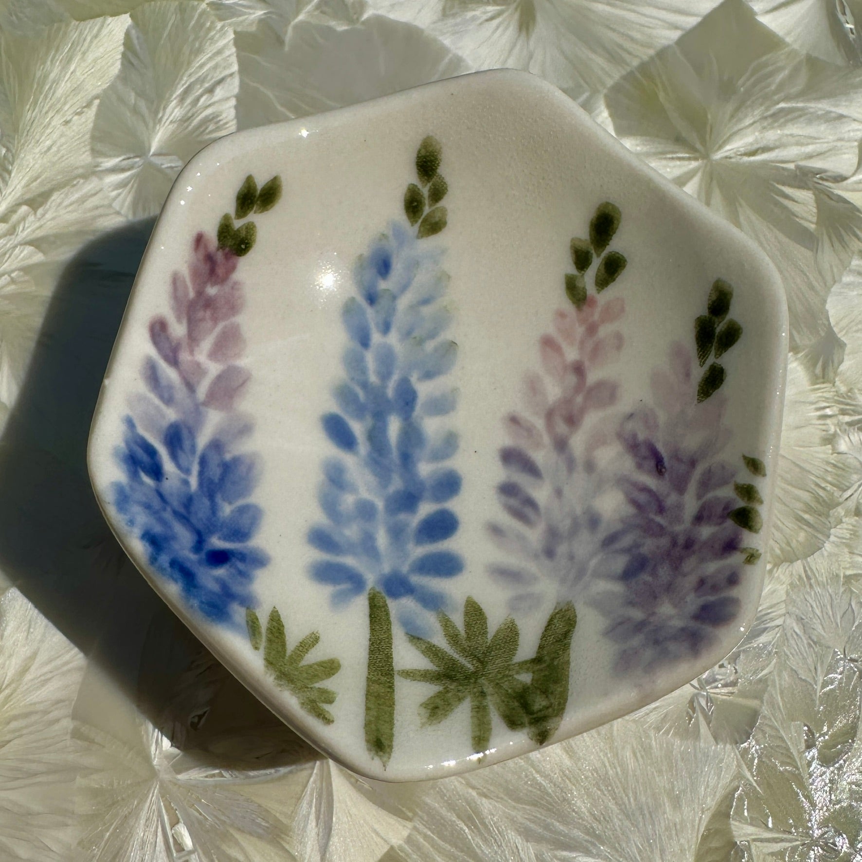 This hexagon-shaped dish features porcelain clay and hand-painted underglaze flowers.