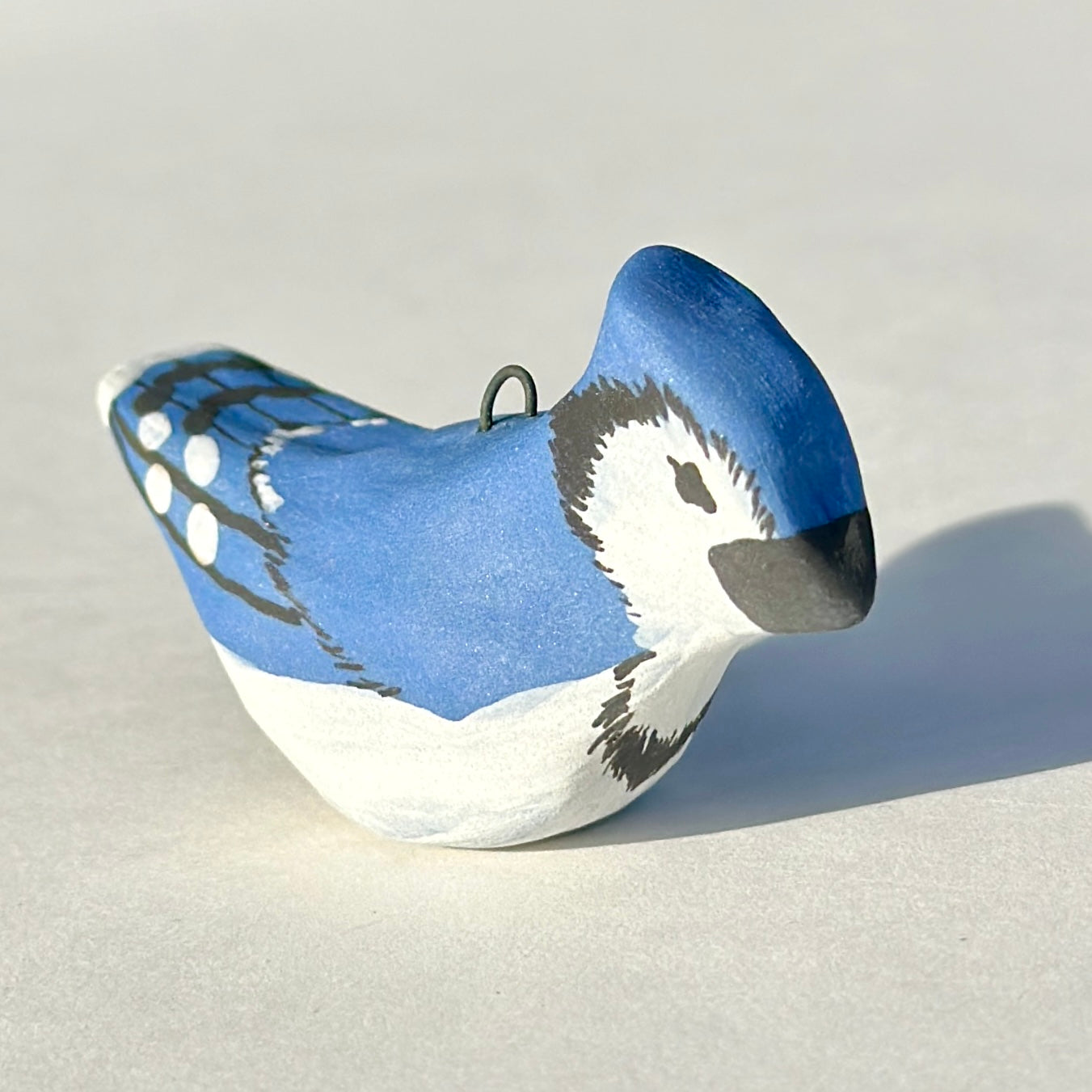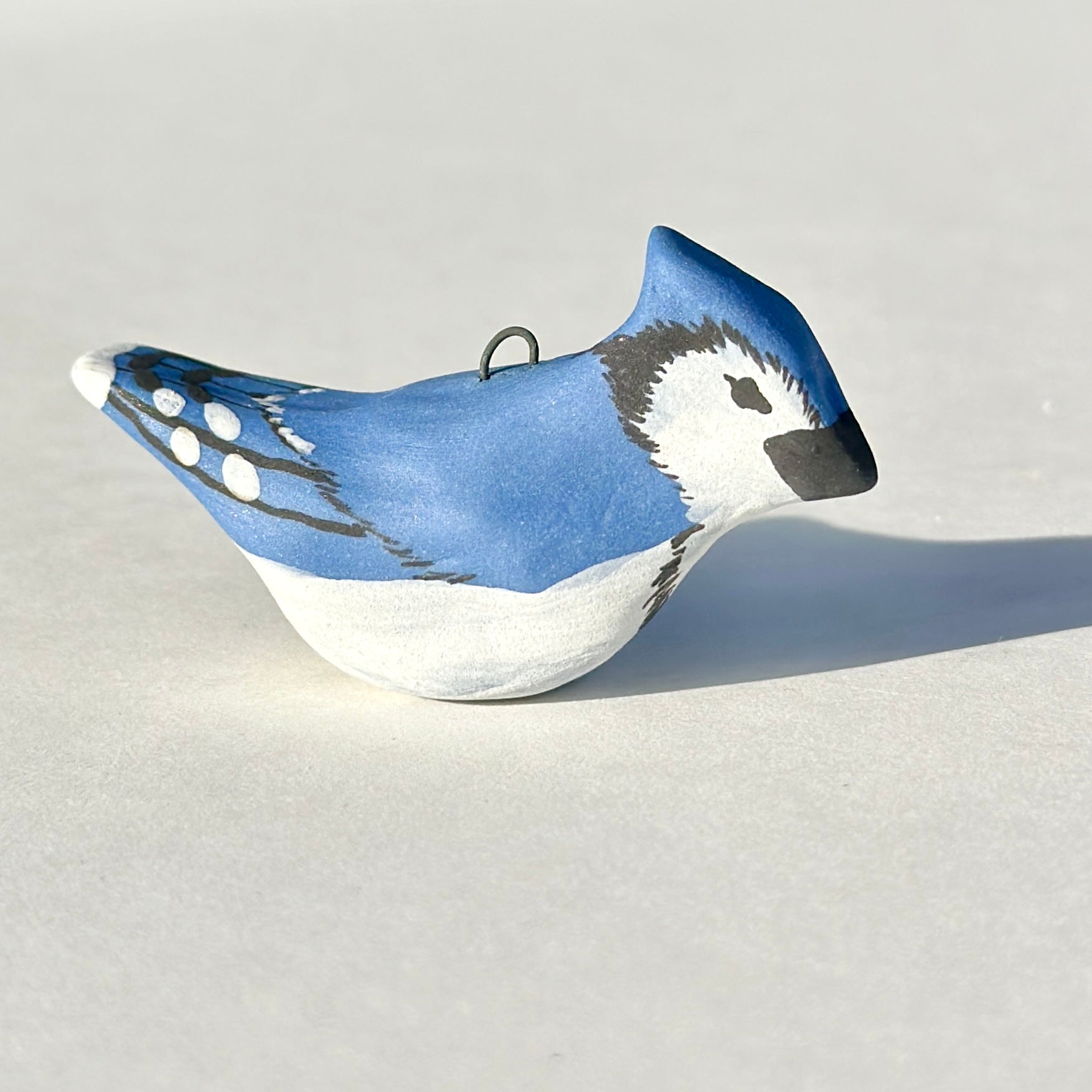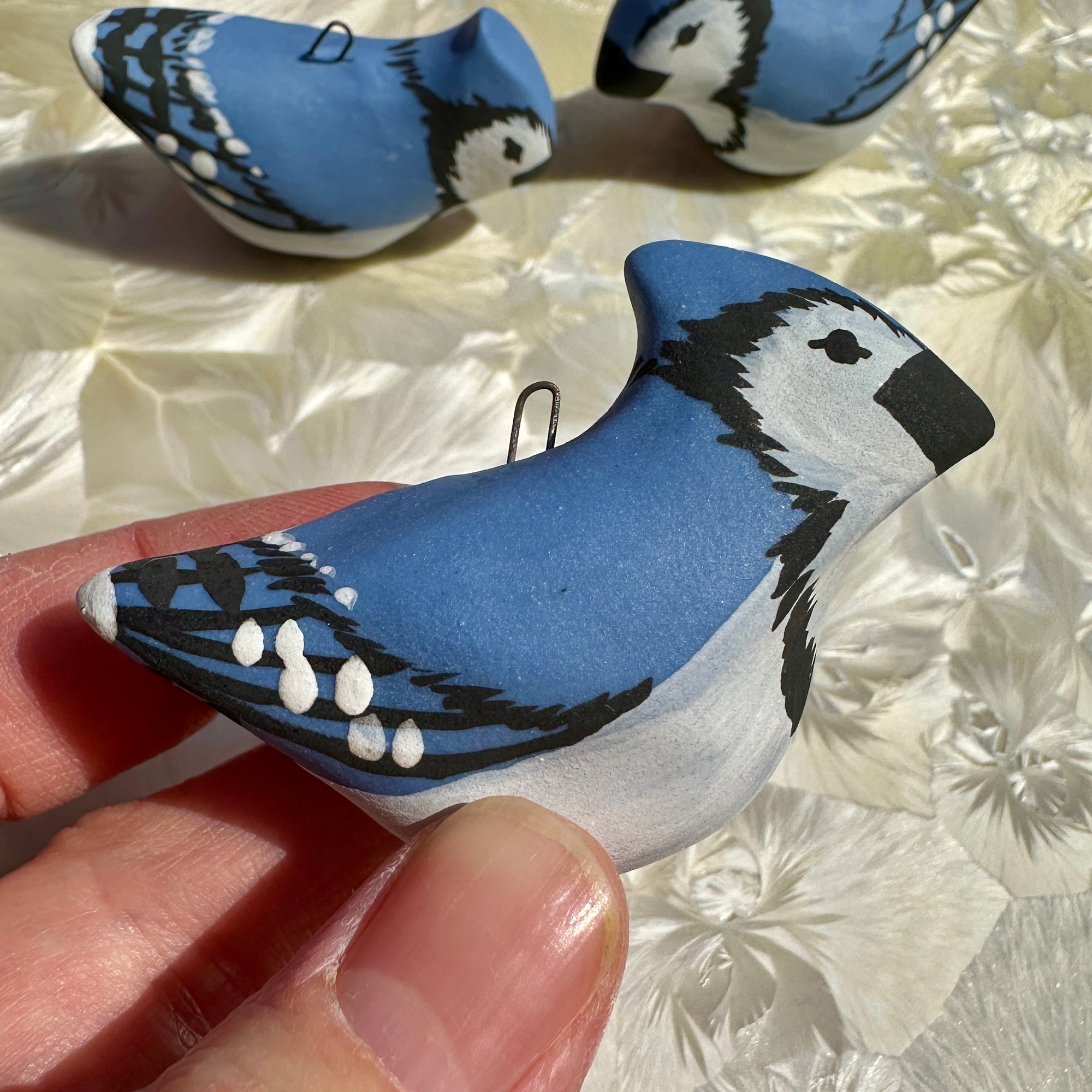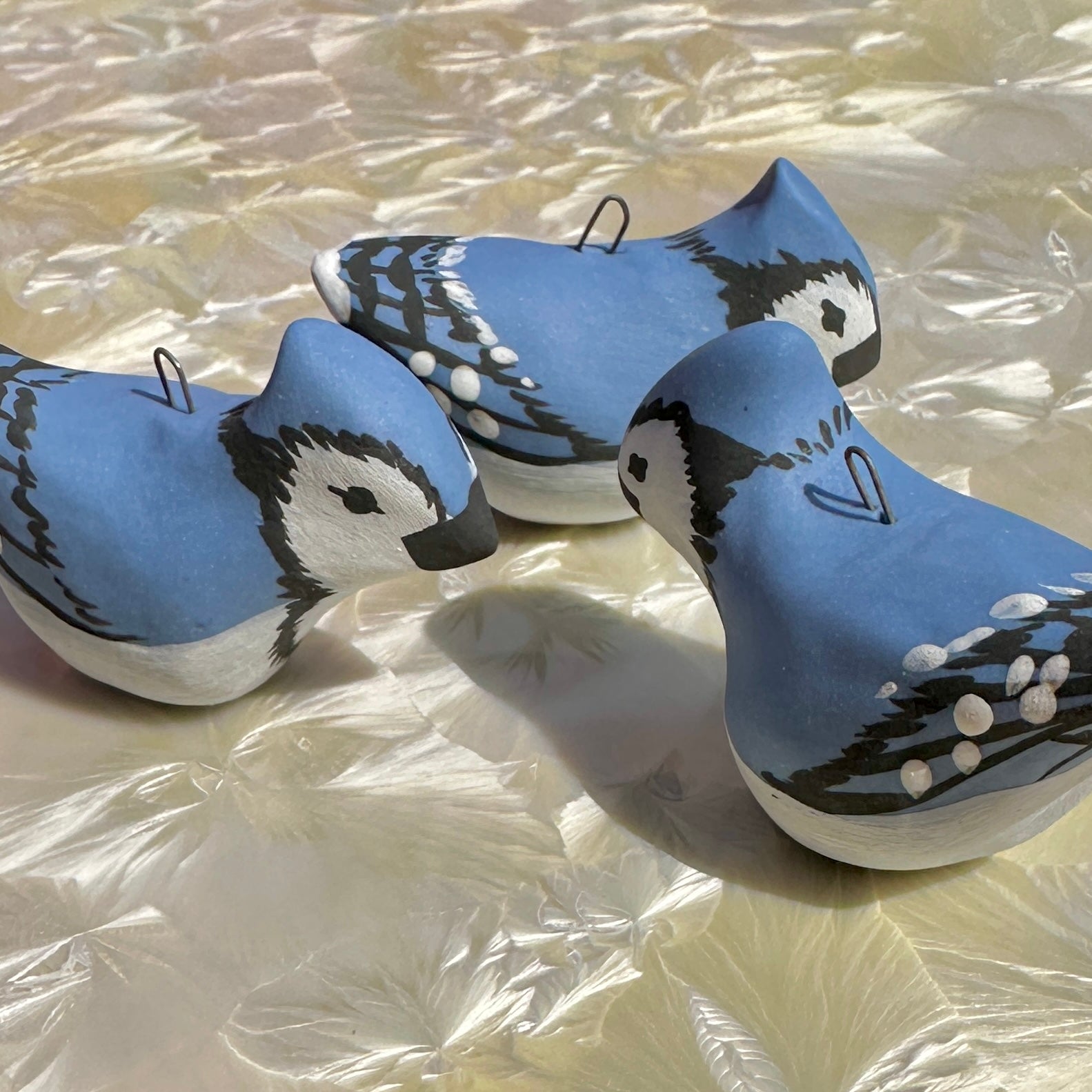 These little birds are made with blue-stained porcelain and decorated with underglaze paints by Alexis' daughter Danica.