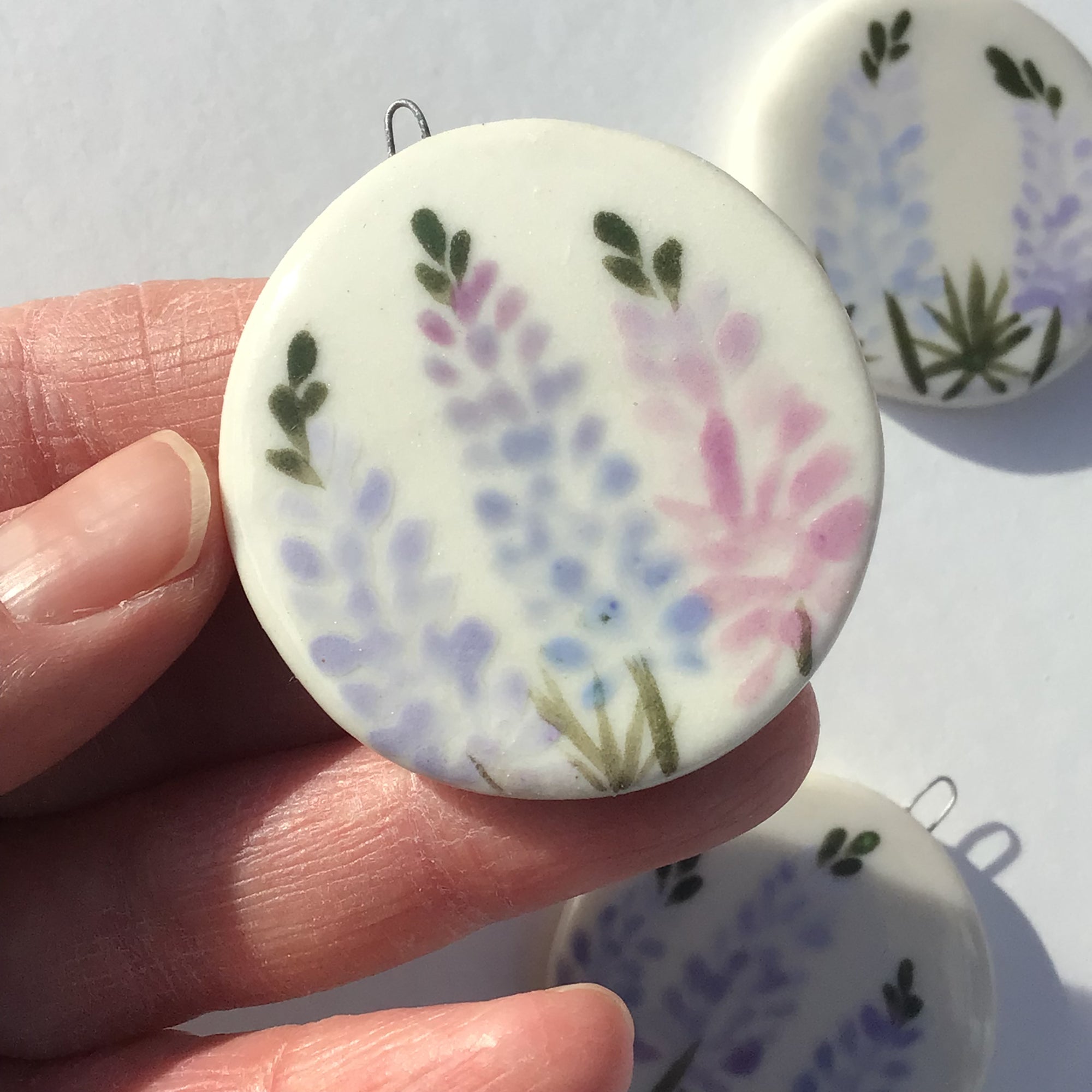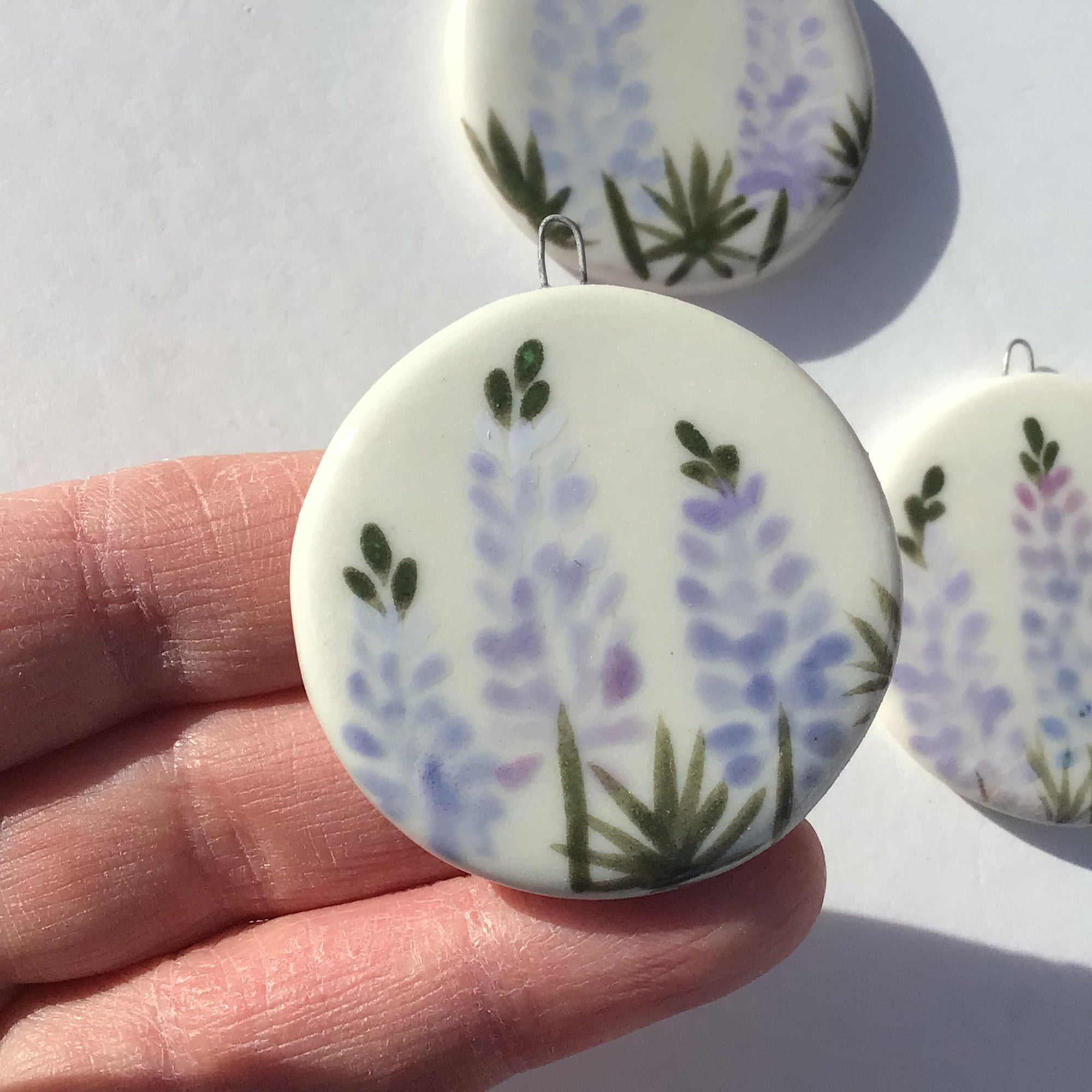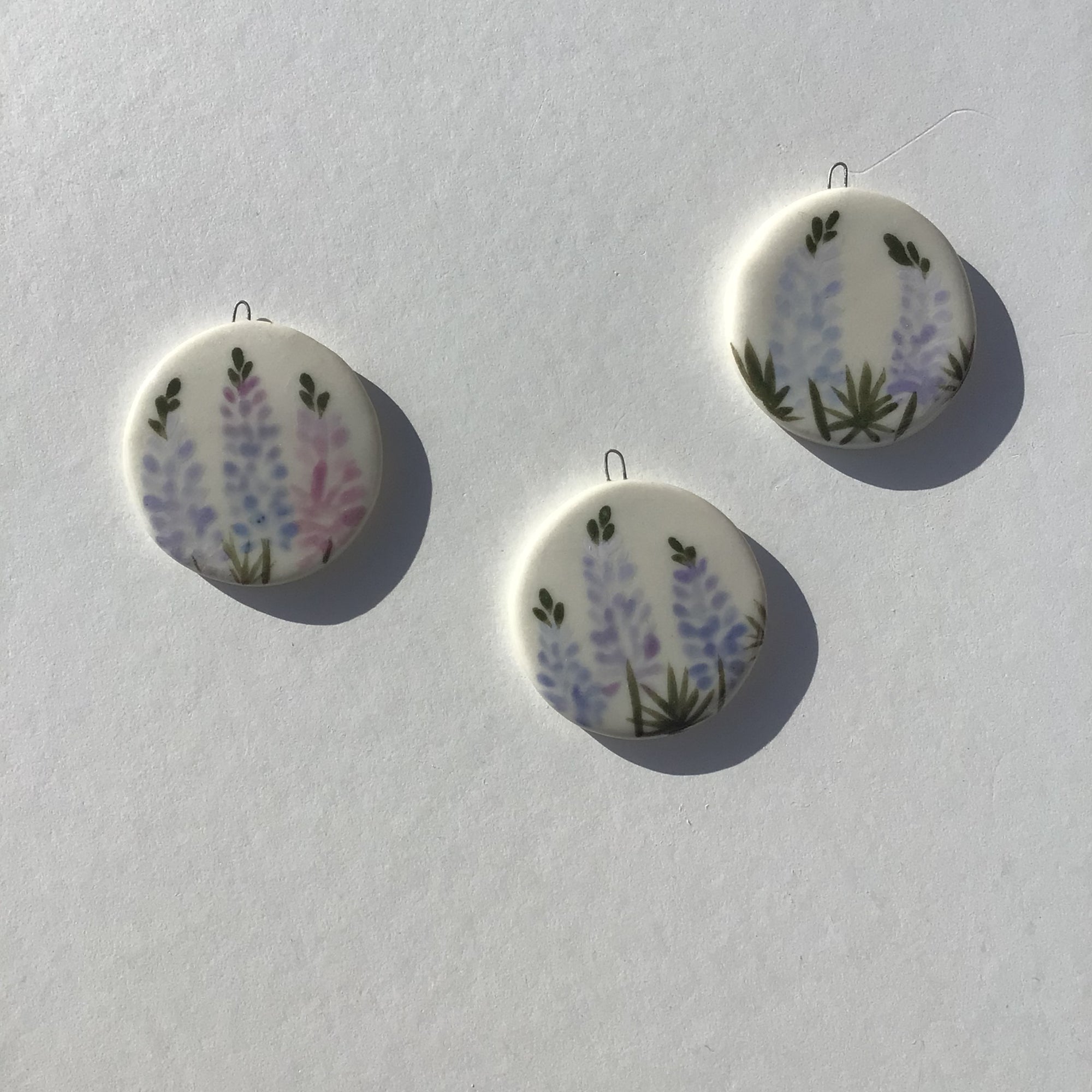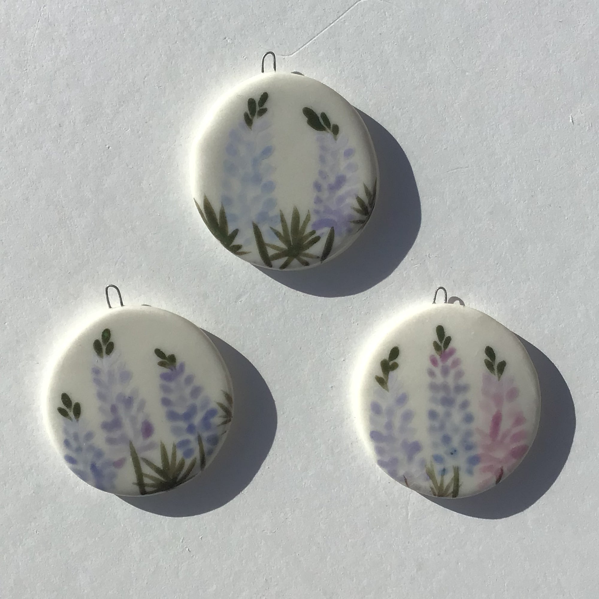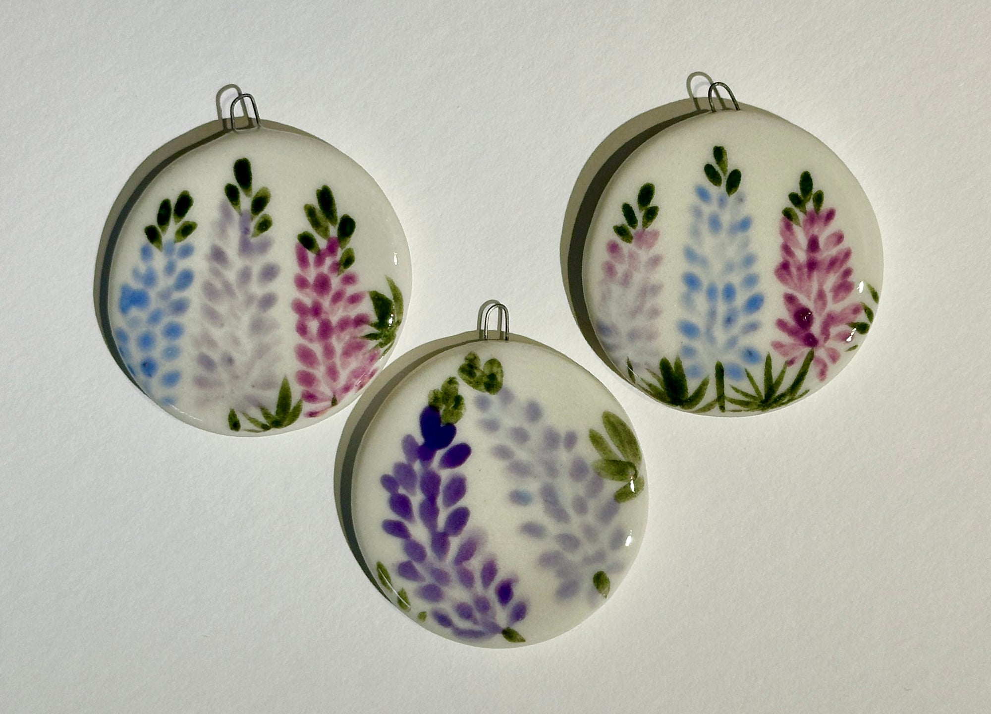 This listing is for one ornament similar to the attached photos. These ornaments feature 2 or 3 lupines in a variety of combinations of blue and purple.
