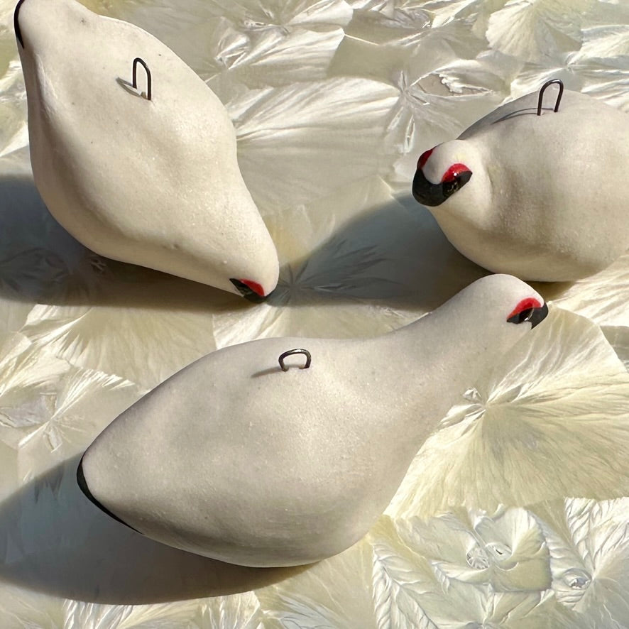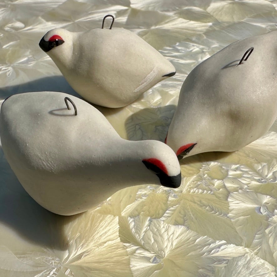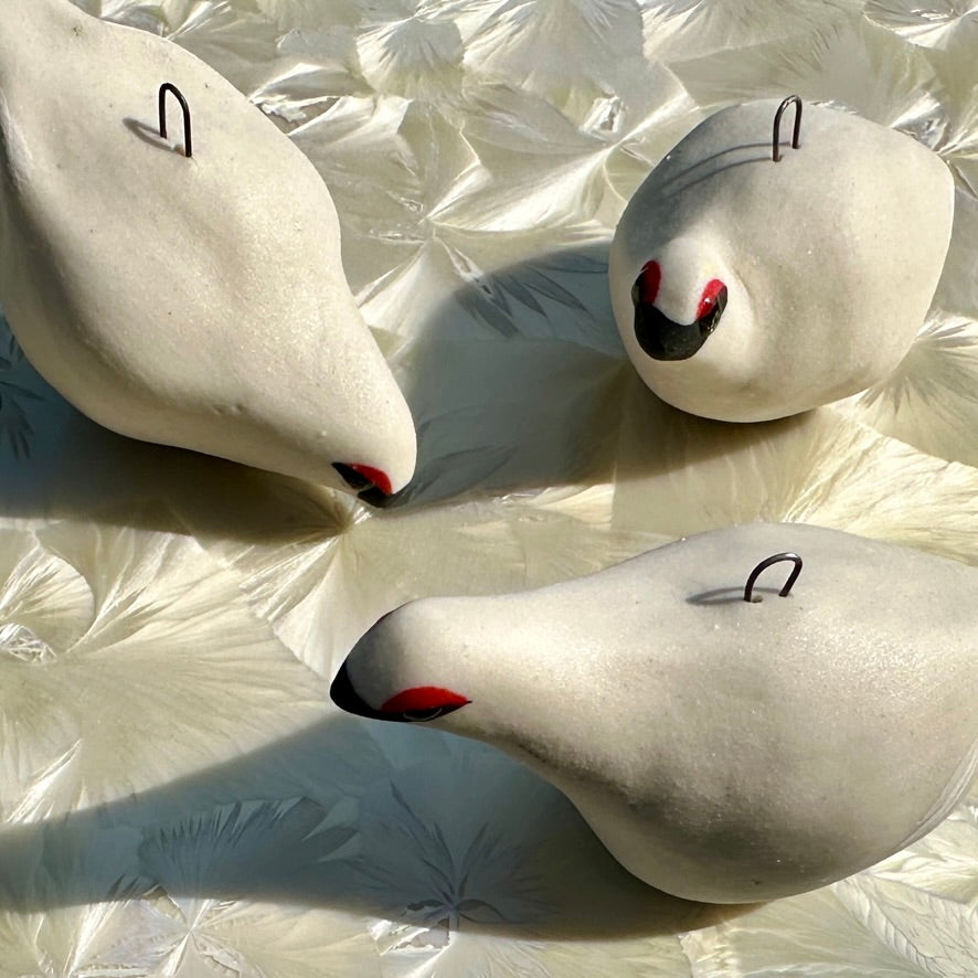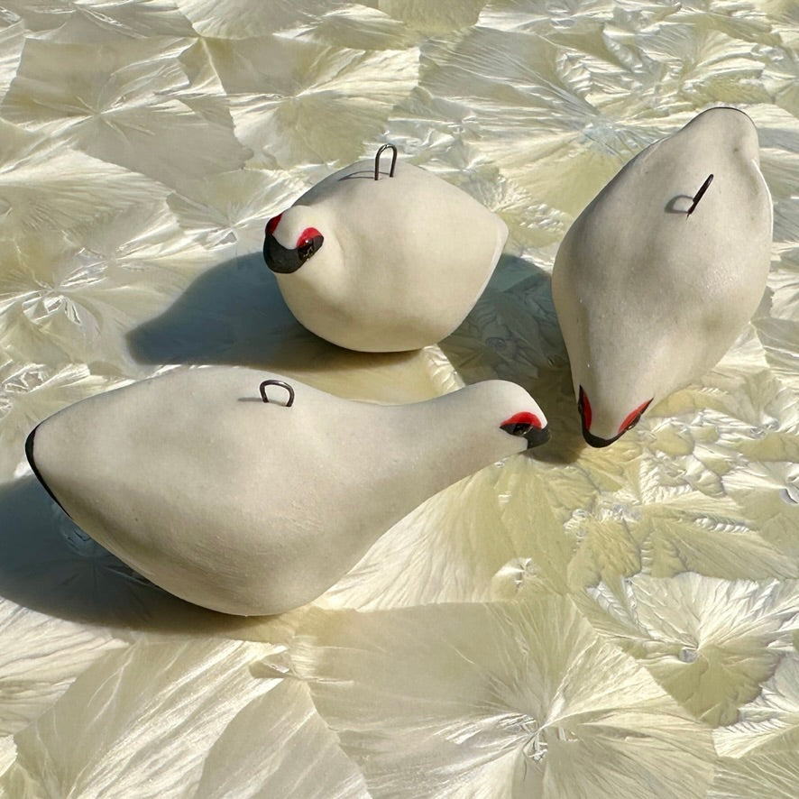 These little white birds are decorated with underglaze paints by Alexis' daughter Danica.
