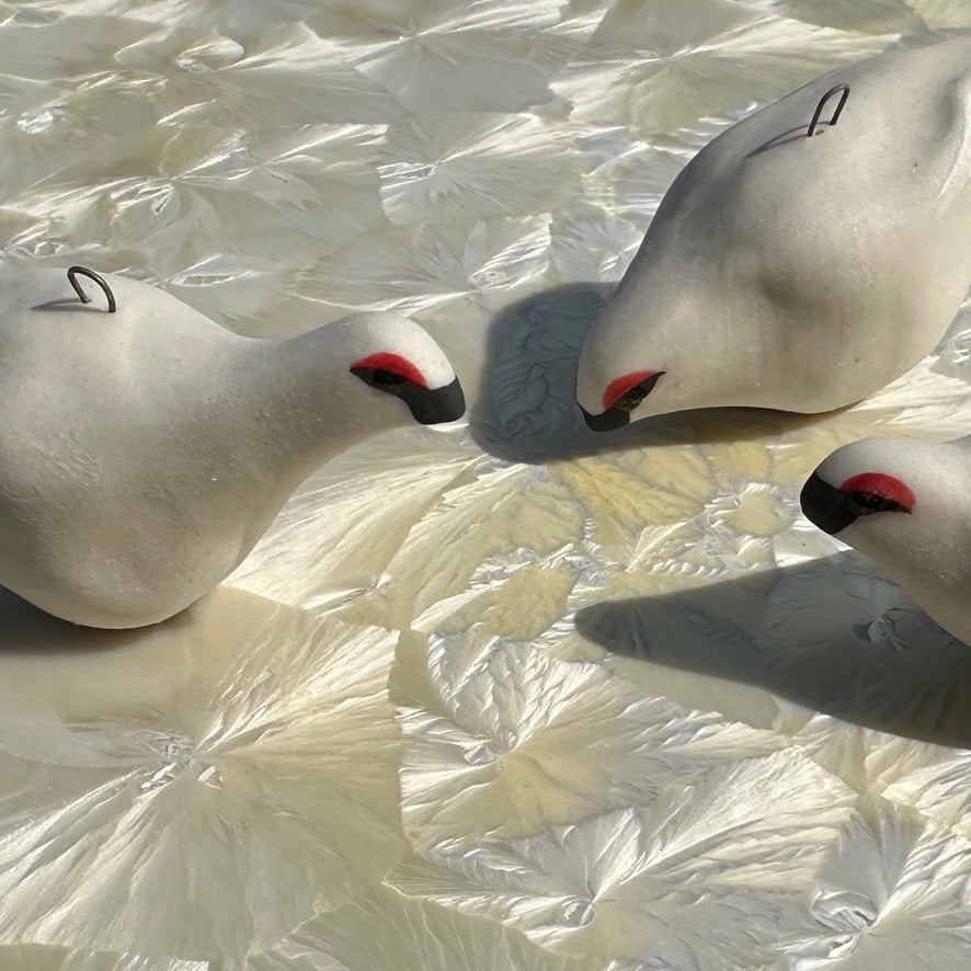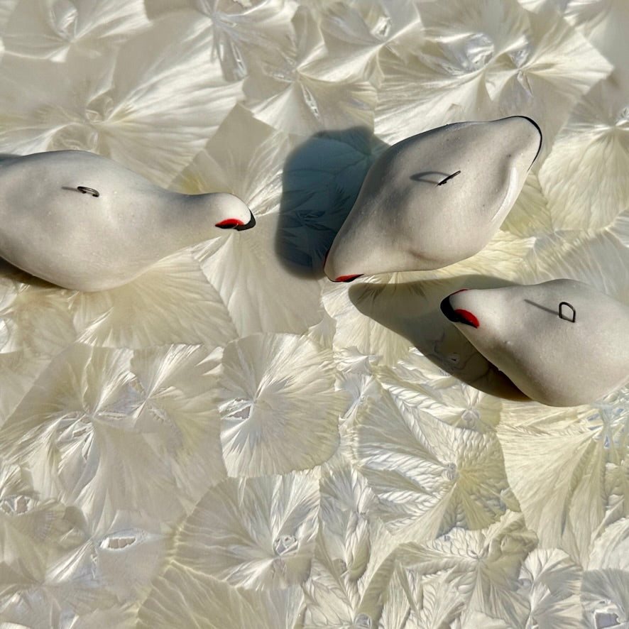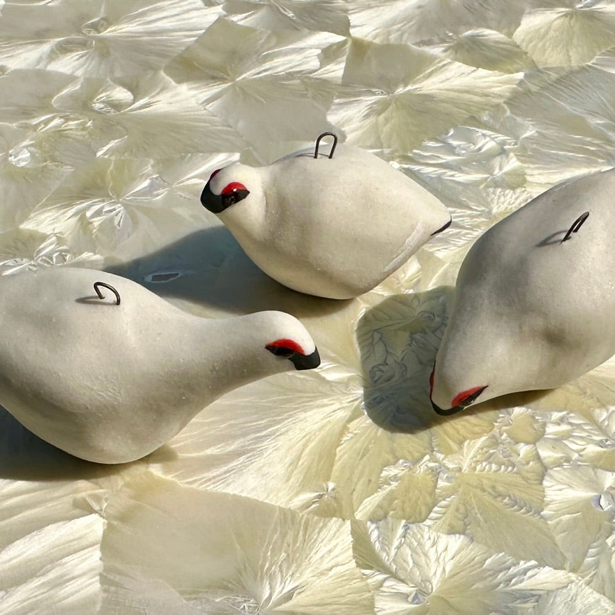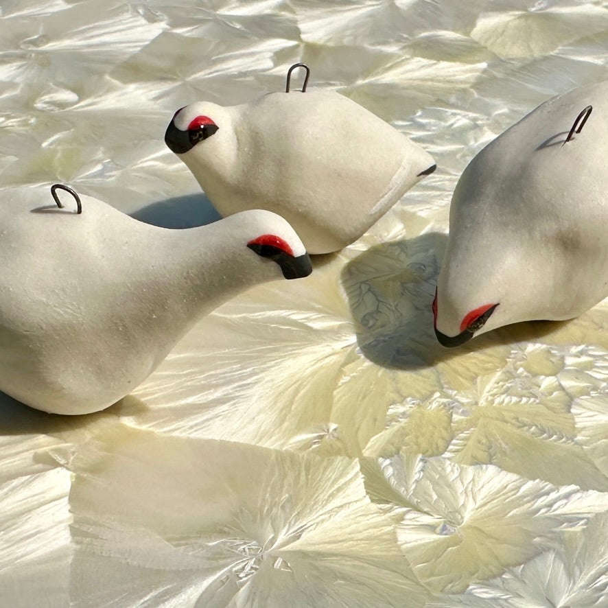 These little white birds are decorated with underglaze paints by Alexis' daughter Danica.