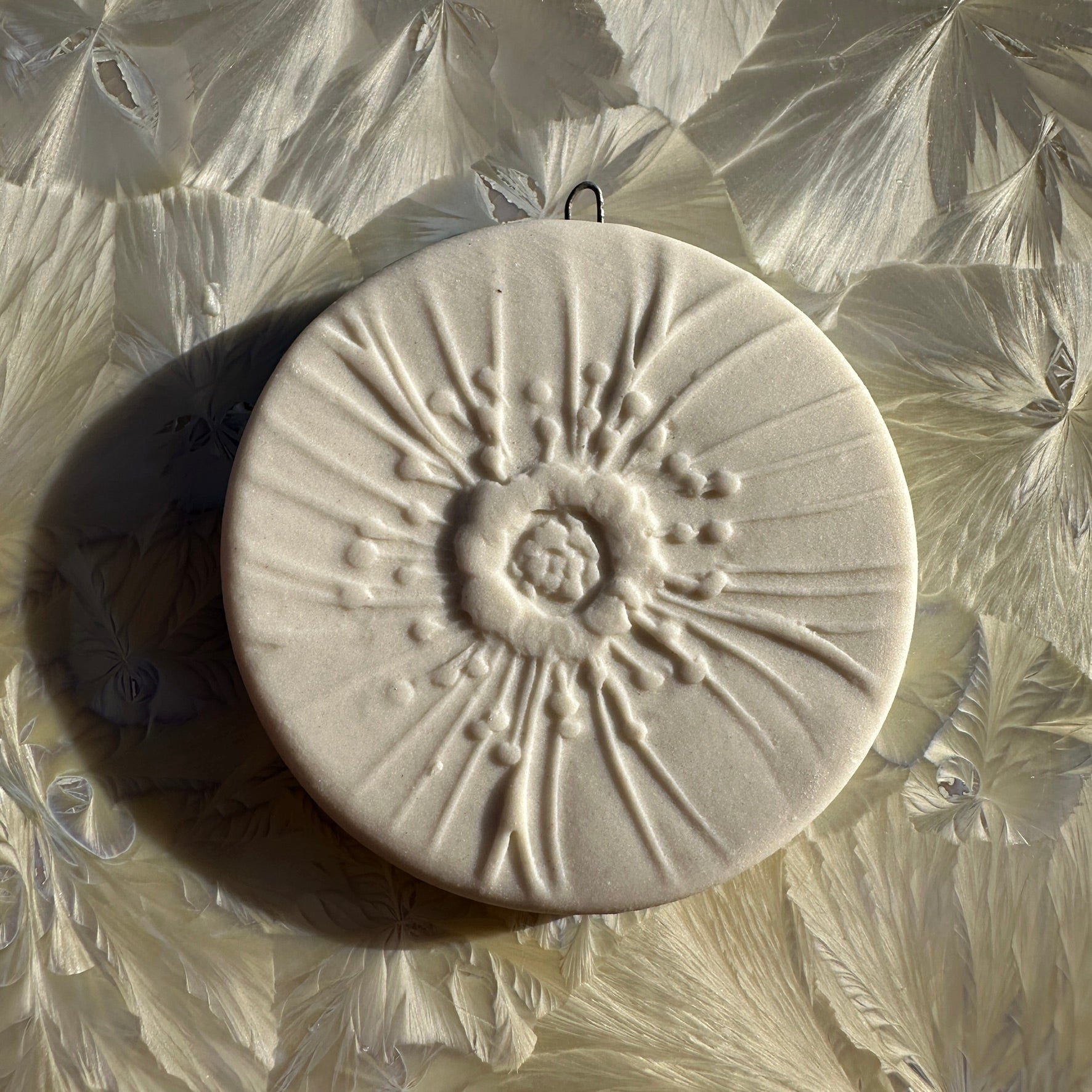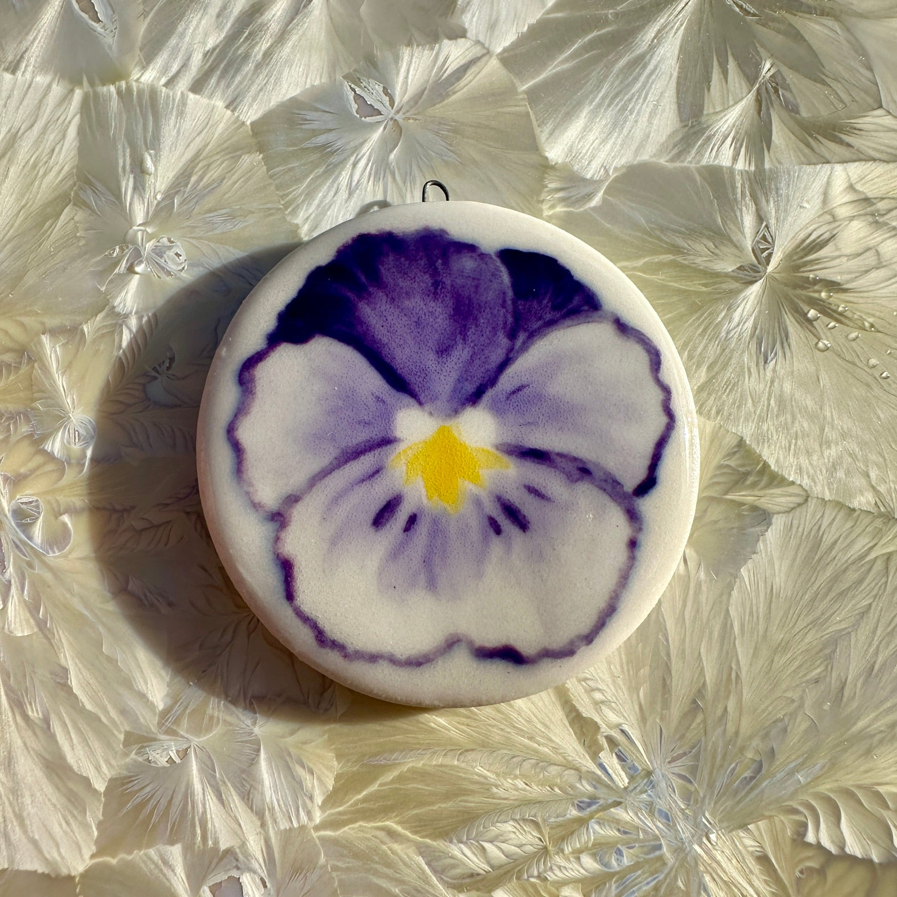 Little round ornament with underglaze painting of a pansy!About 5 centimetres in diameter.