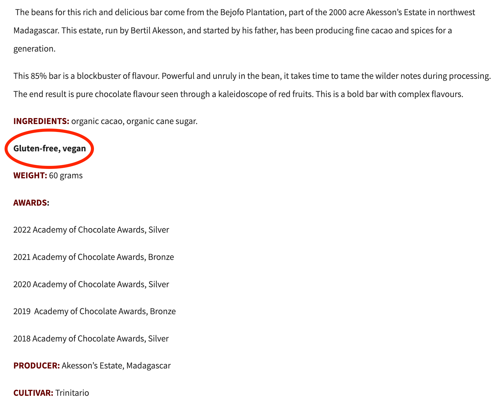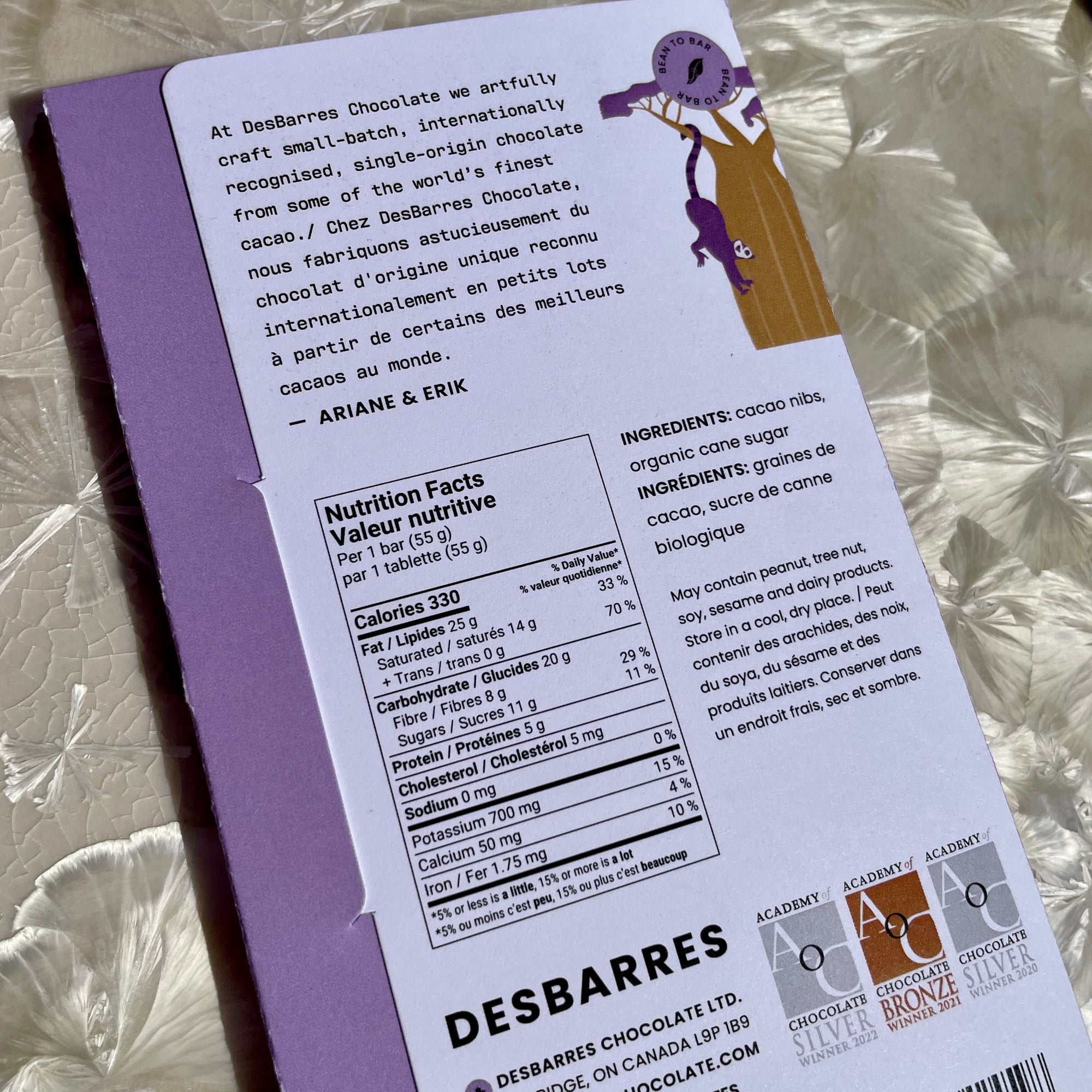 This 60 gram bar is an Academy of Chocolate Gold (2019) and Silver (2018) winner.