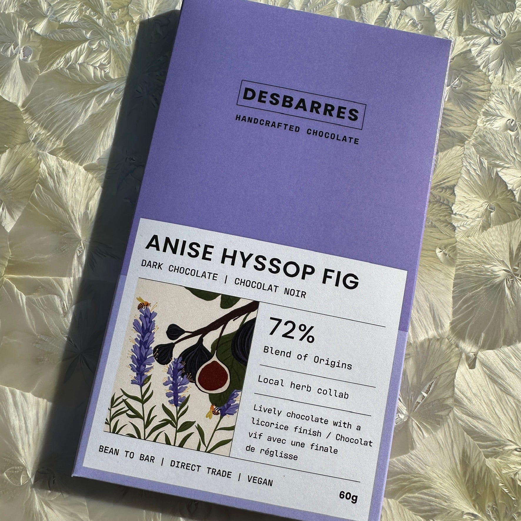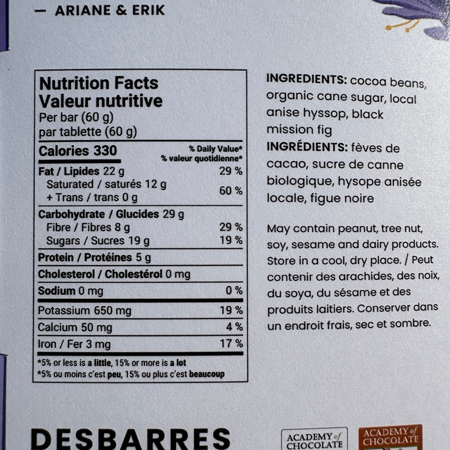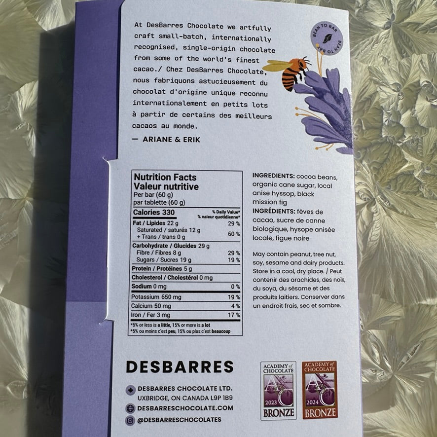 This bar uses a flavourful herb called Anise Hyssop to deliver a sweet licorice flavour to the chocolate. A Guatemalan cacao is used as the base and black mission figs are added at the pour to complement the earthy, rich flavours of the anise. This bar is a bit of a revelation. A must try for those of you who are licorice chocolate sceptics. An early taster of this bar took one try and hid it away for personal snacking only.