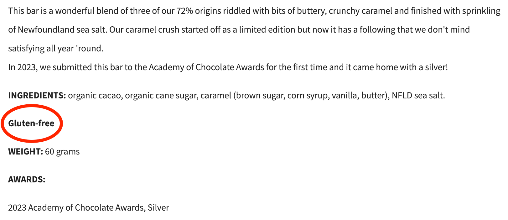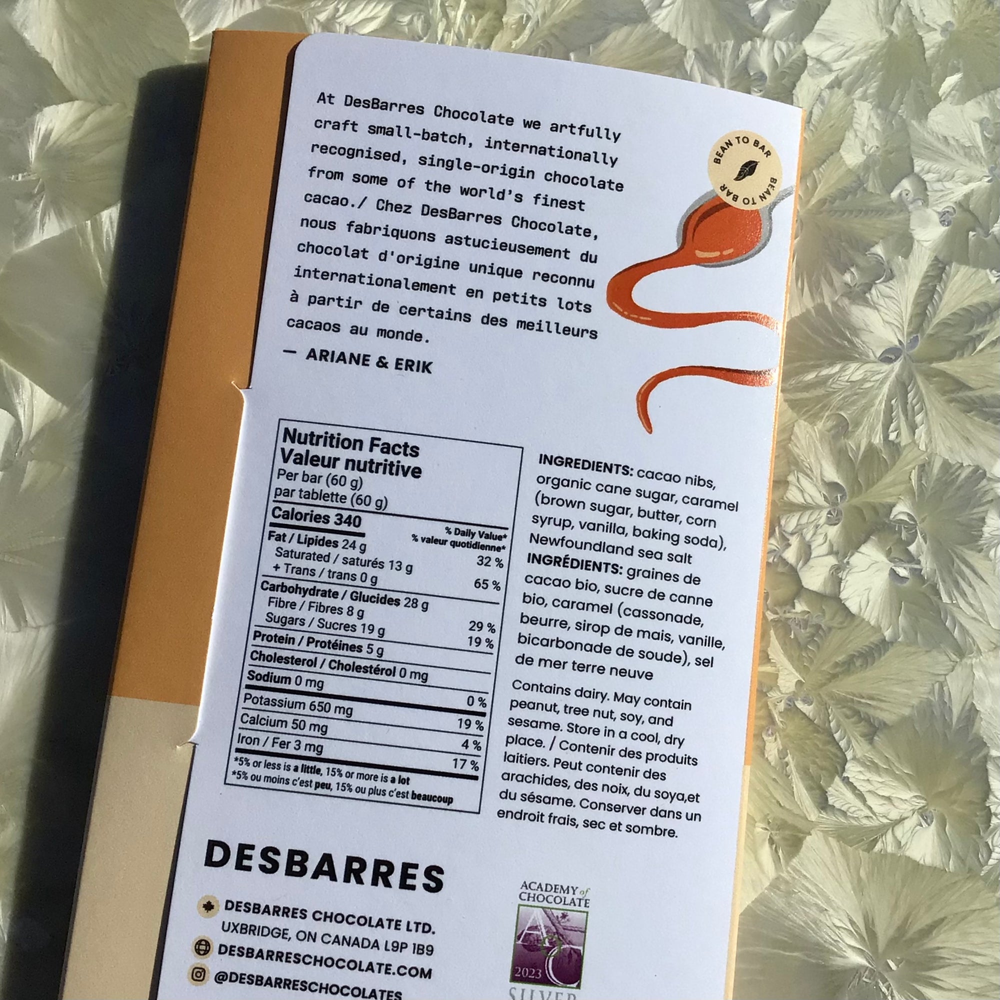 This bar is a wonderful blend of three of Desbarres 72% origins riddled with bits of buttery, crunchy caramel and finished with sprinkling of Newfoundland sea salt.