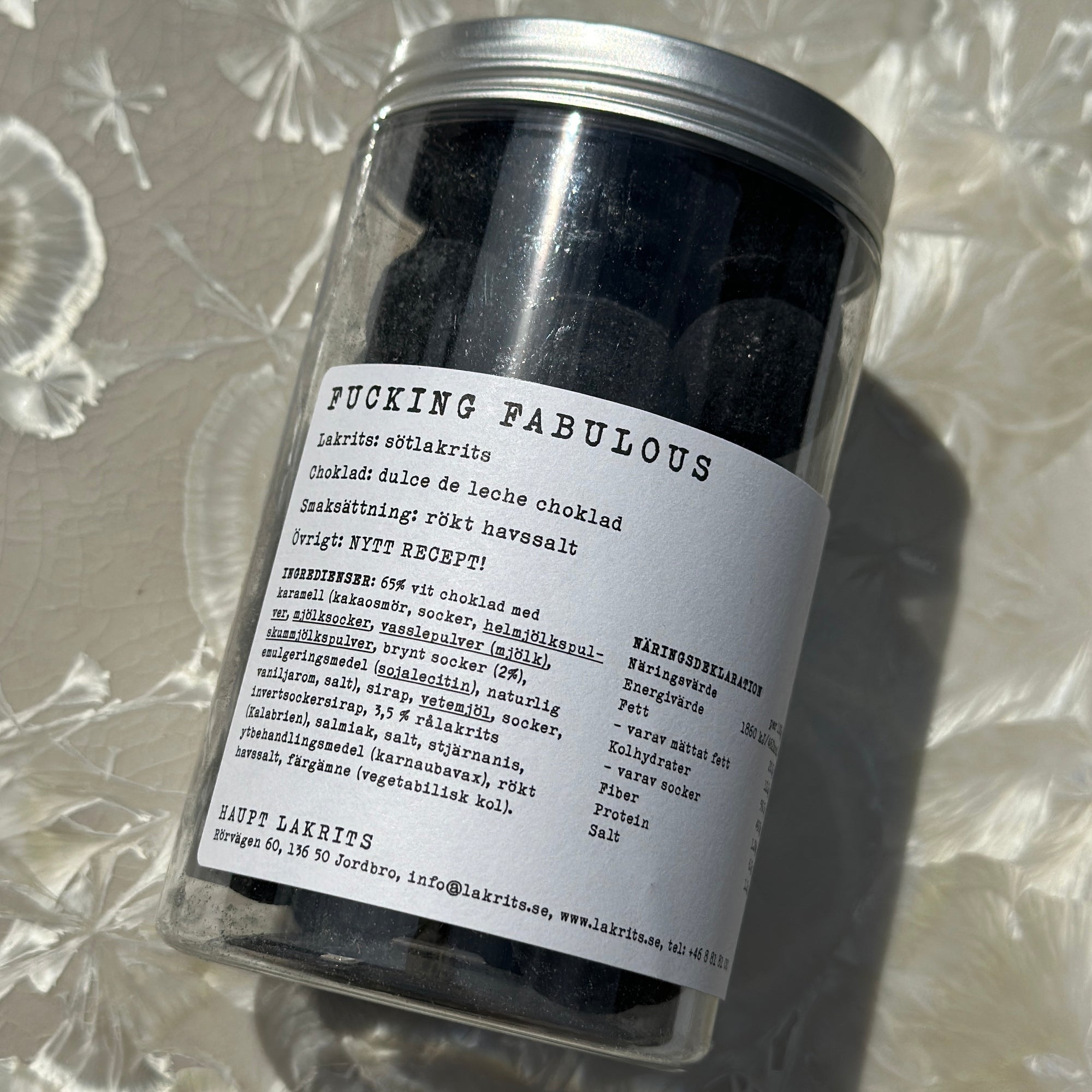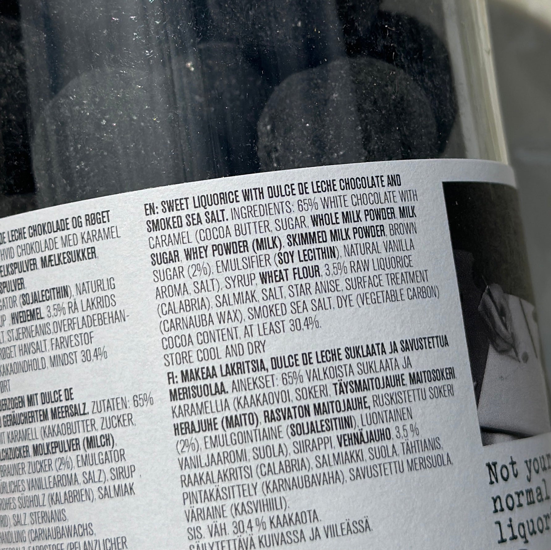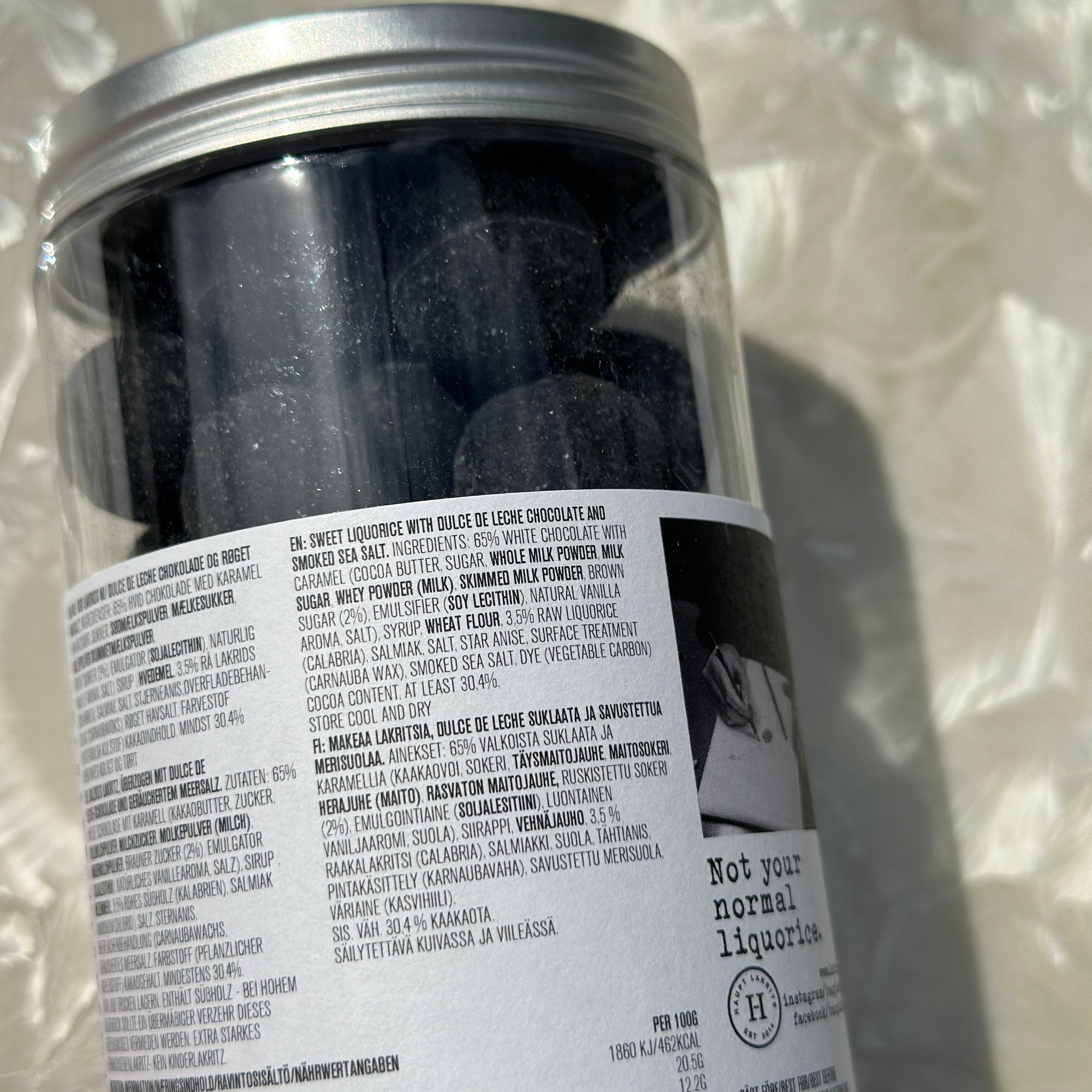 Sweet liquorice with dulce de leche chocolate and smoked sea salt250g jar.