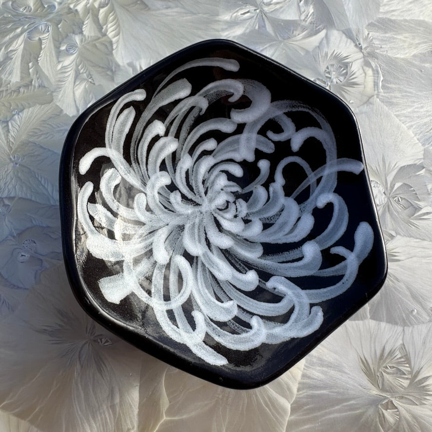 This hexagon-shaped dish features an underglaze chrysanthemum painting by Danica Templeton.