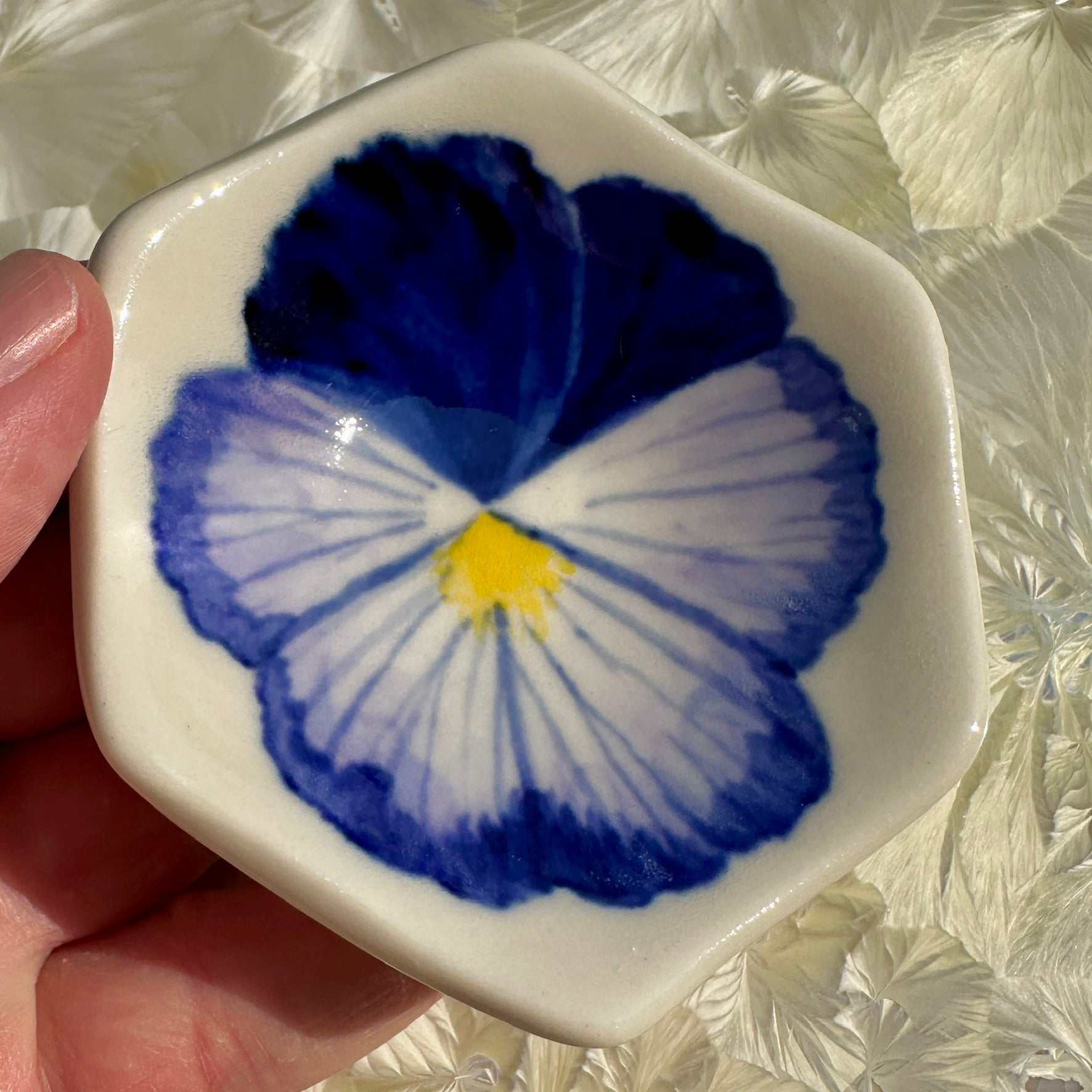 This hexagon-shaped dish features porcelain clay and a hand-painted underglaze pansy flower!