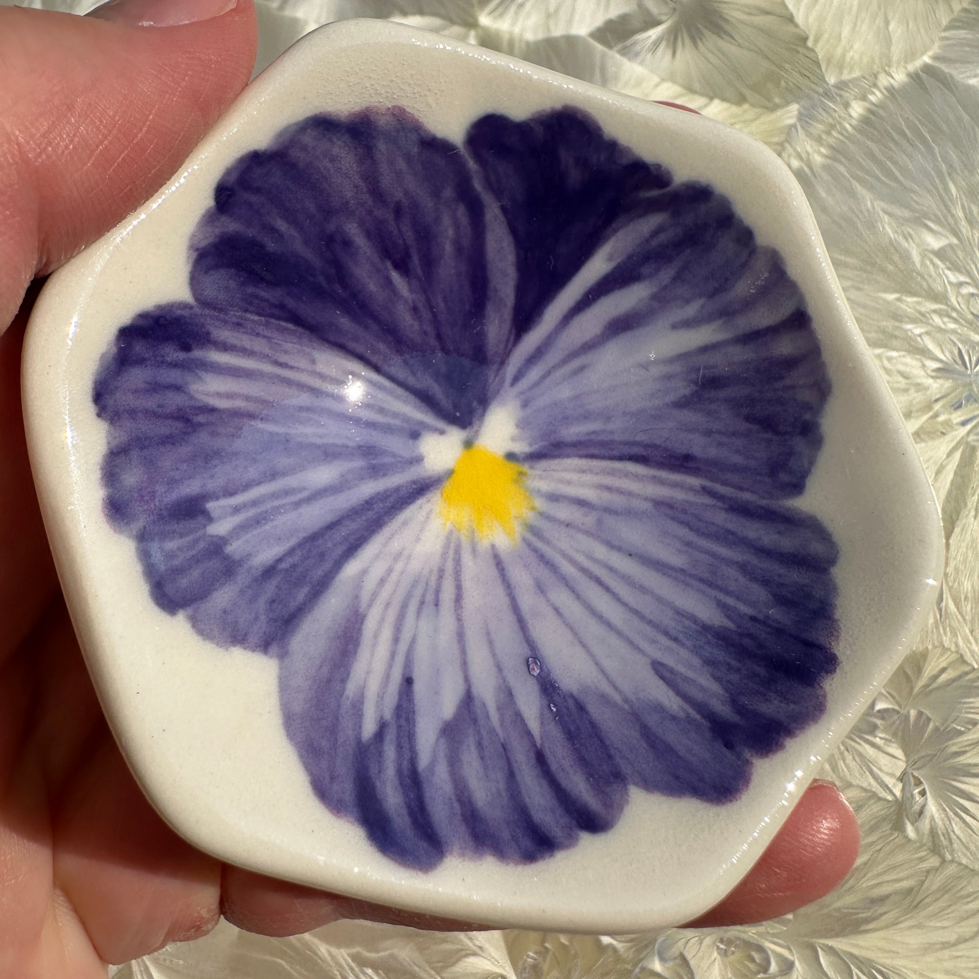 This hexagon-shaped dish features porcelain clay and a hand-painted underglaze pansy flower!