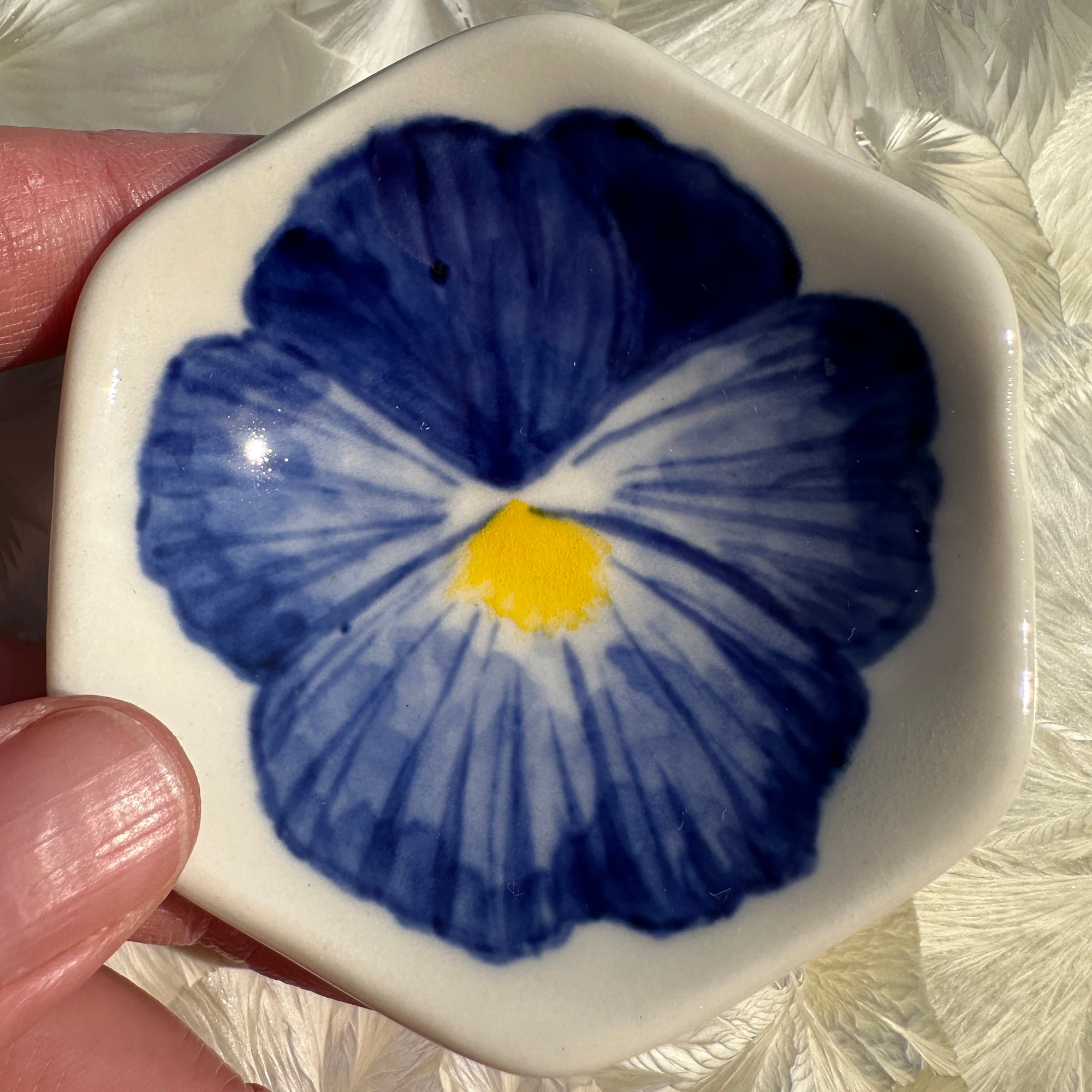 This hexagon-shaped dish features porcelain clay and a hand-painted underglaze pansy flower!