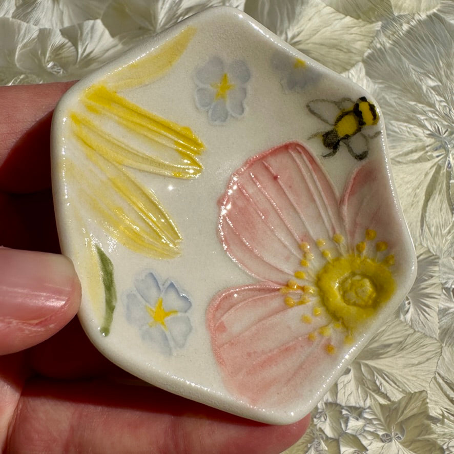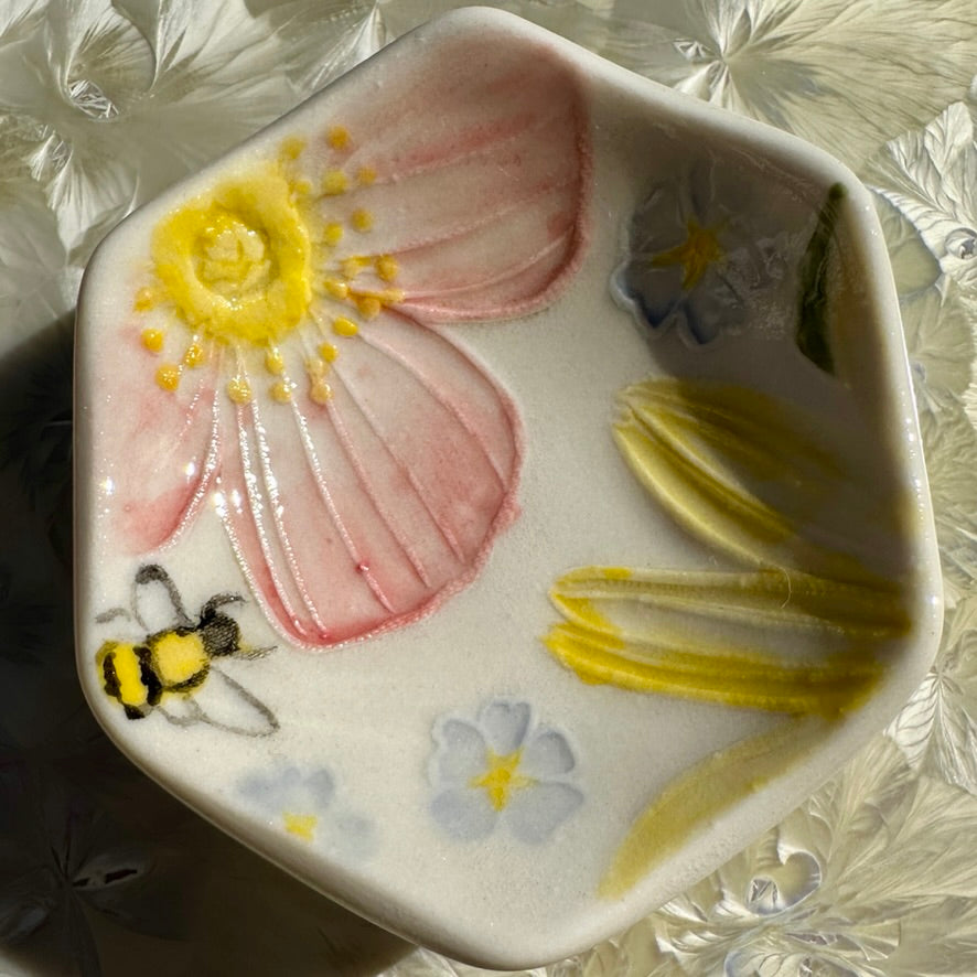 This hexagon-shaped dish features porcelain clay and a 3D flower pattern with hand-painted colours.