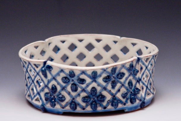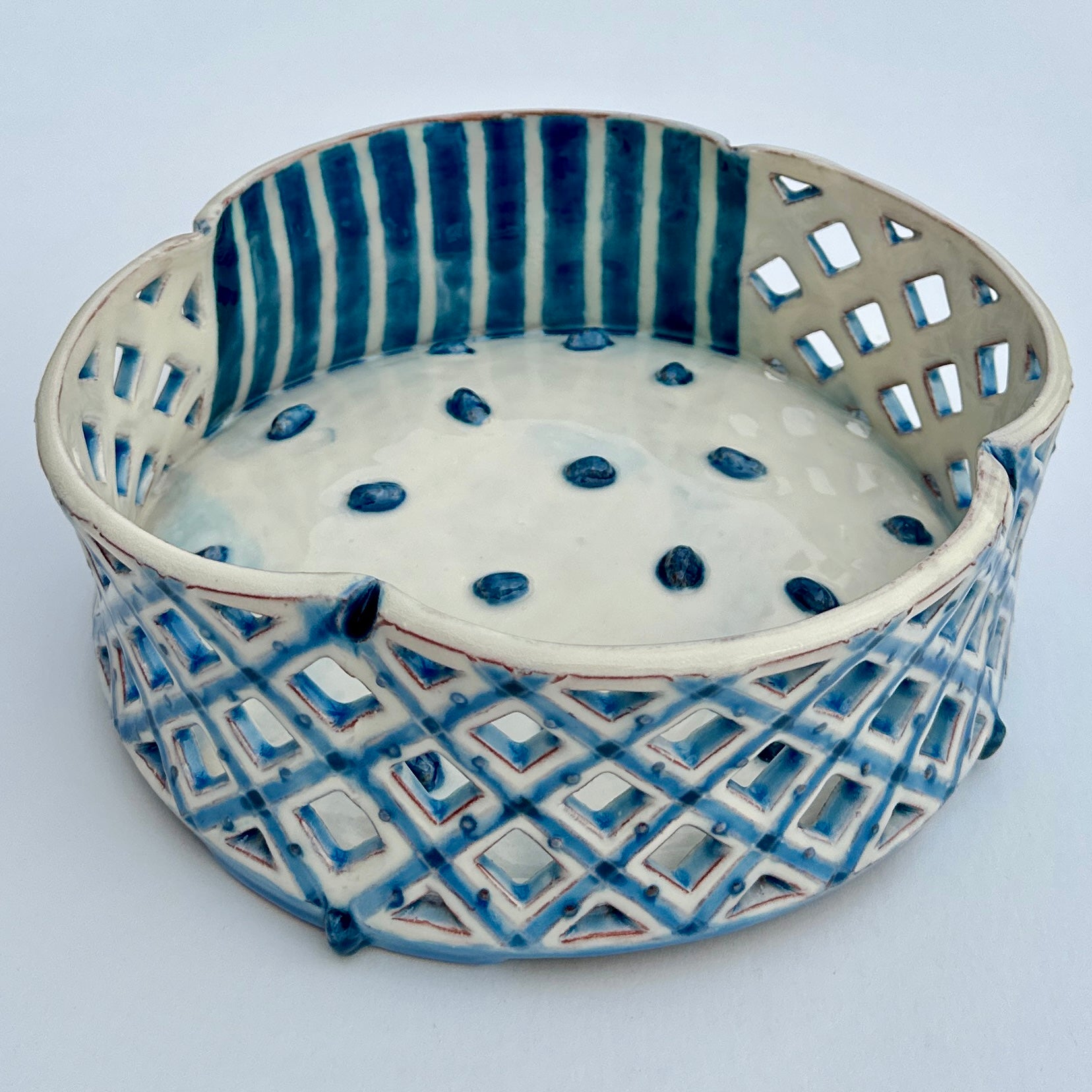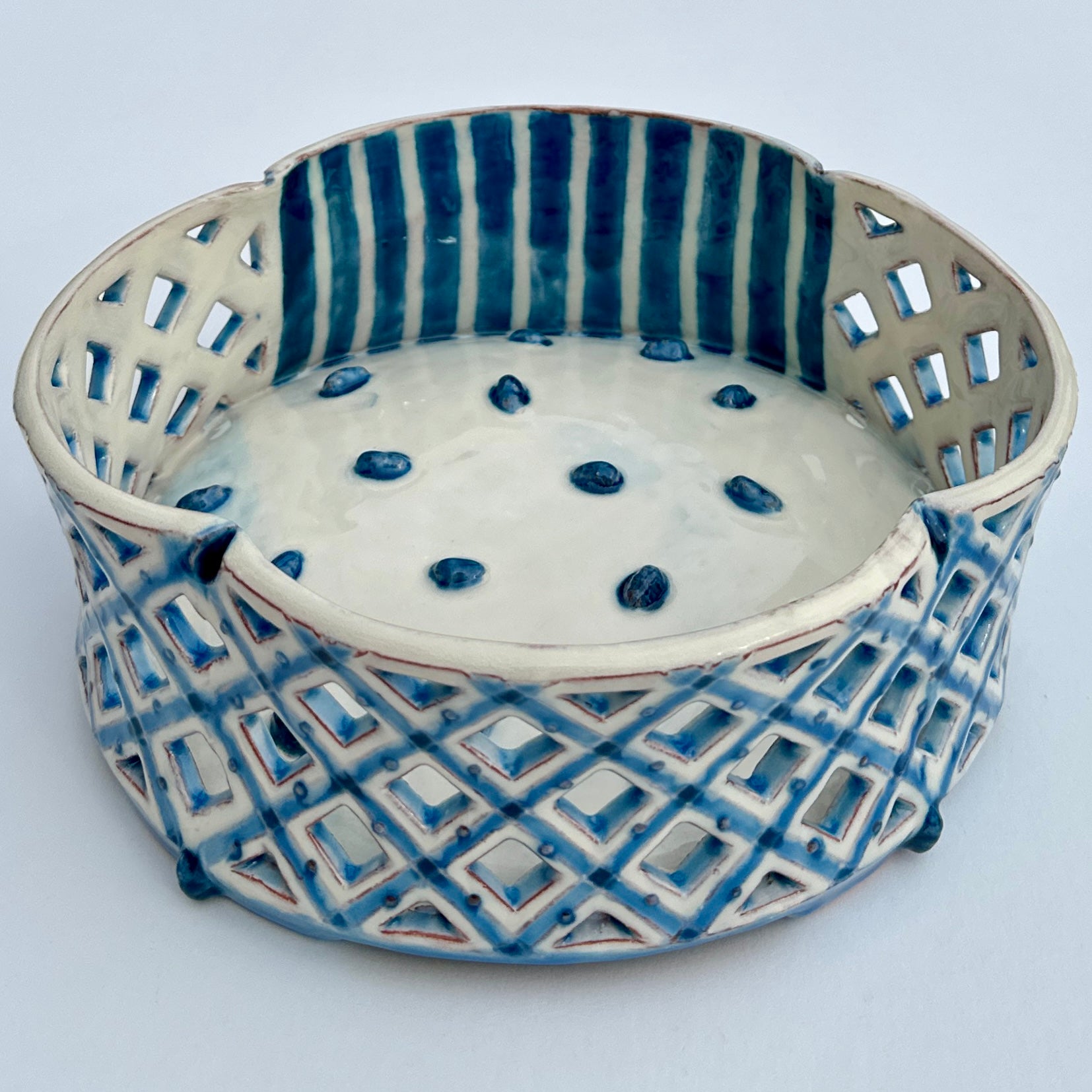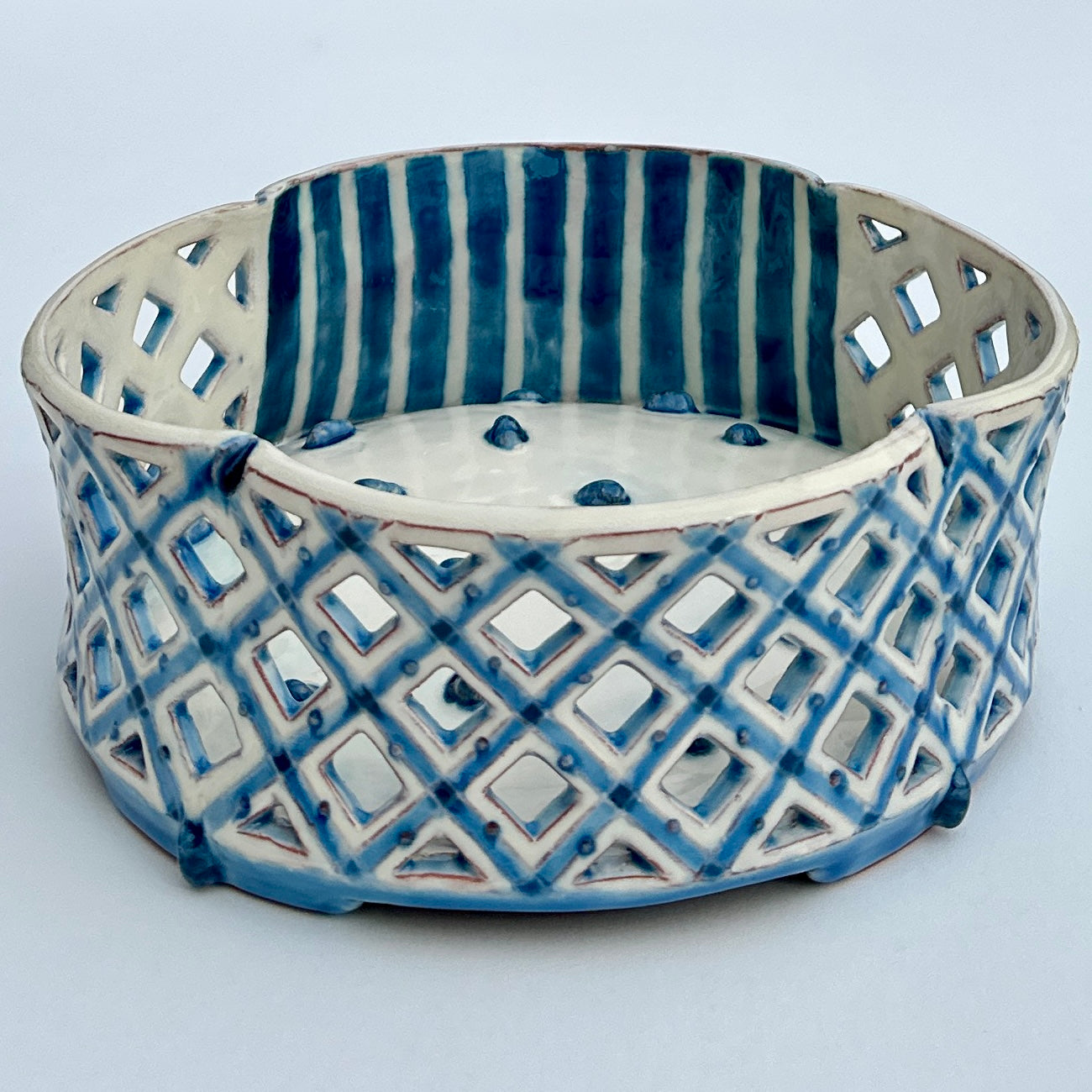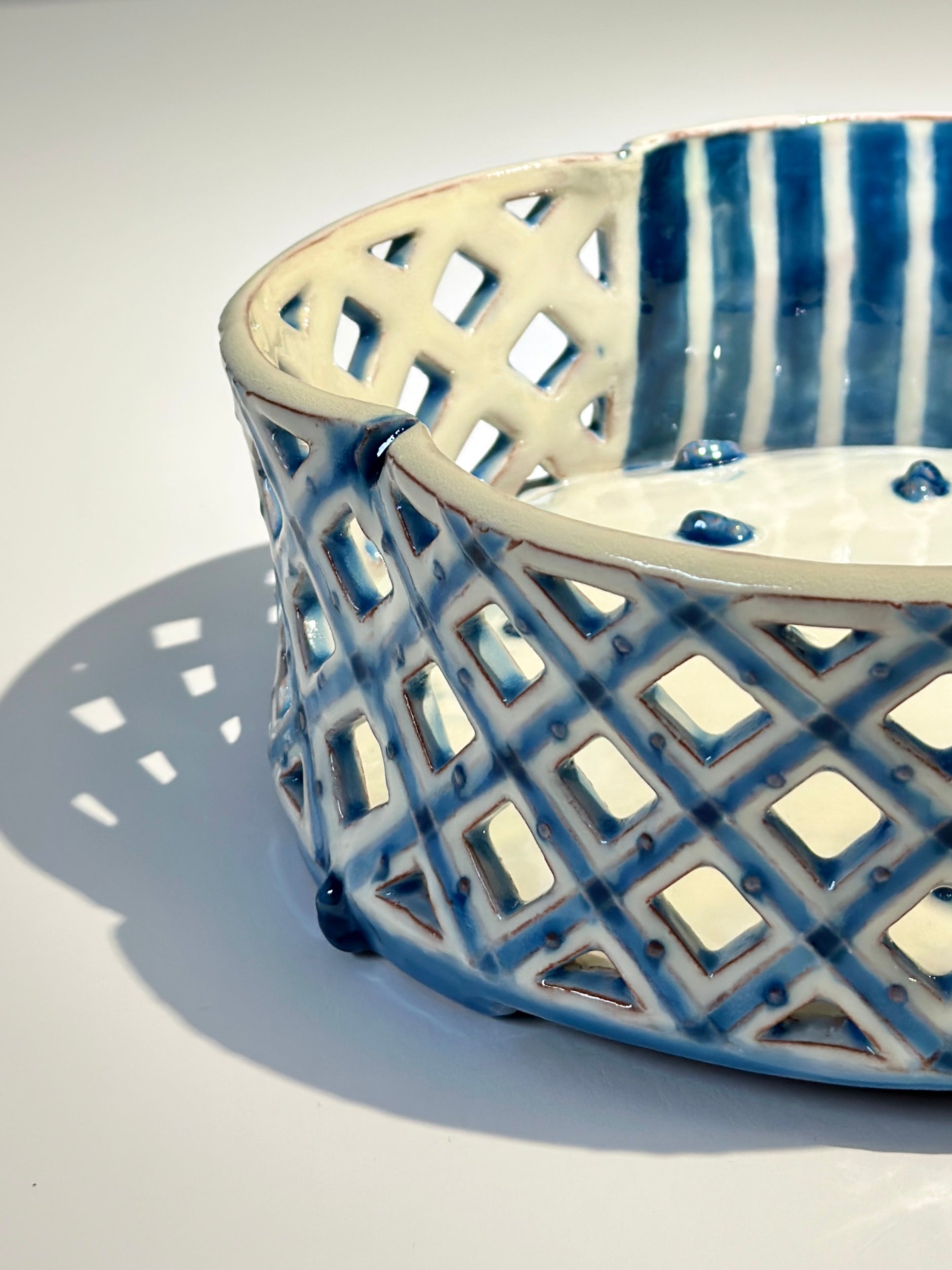 Large blue and white sculptural bowl with basket-like cutouts and dotted texture.