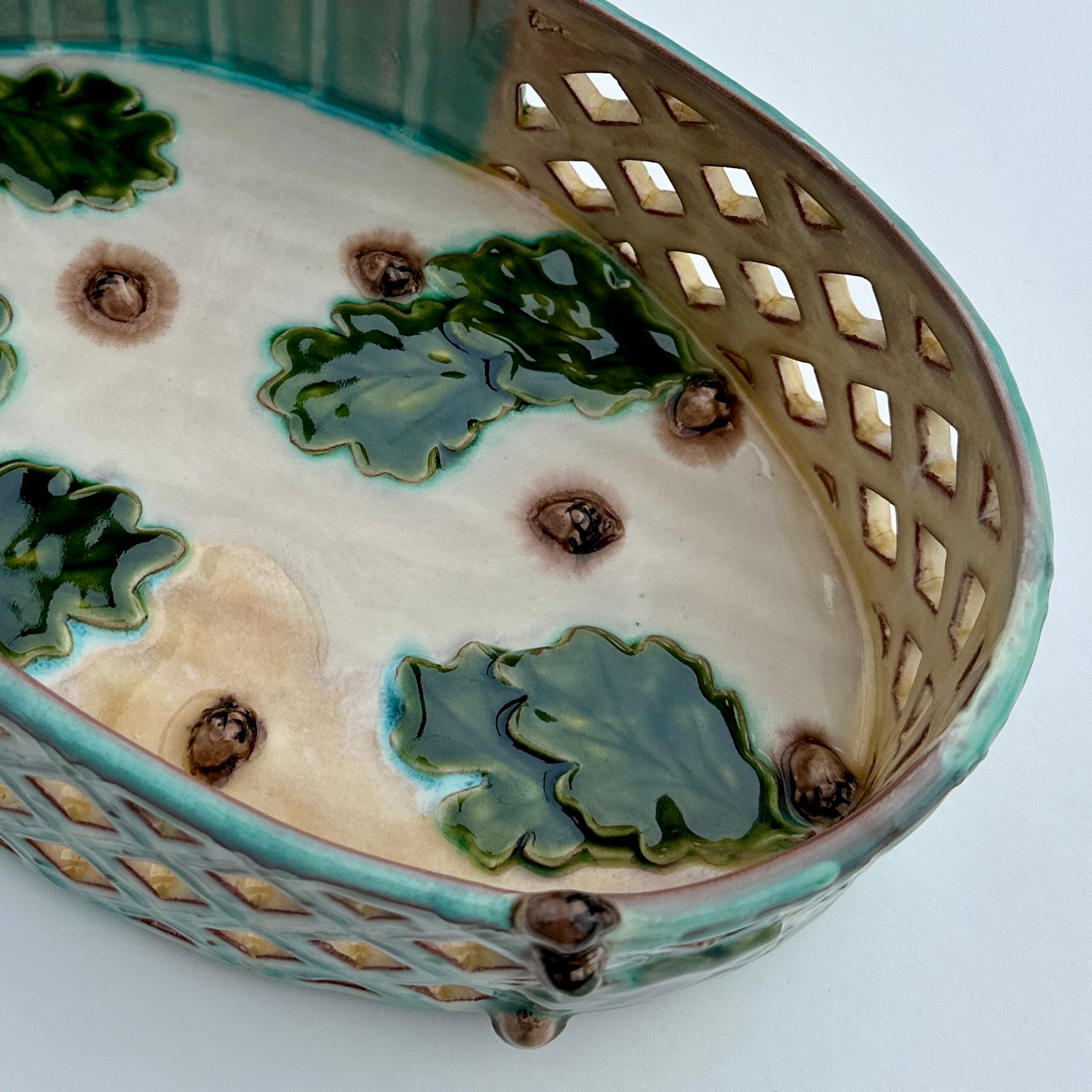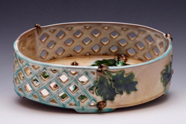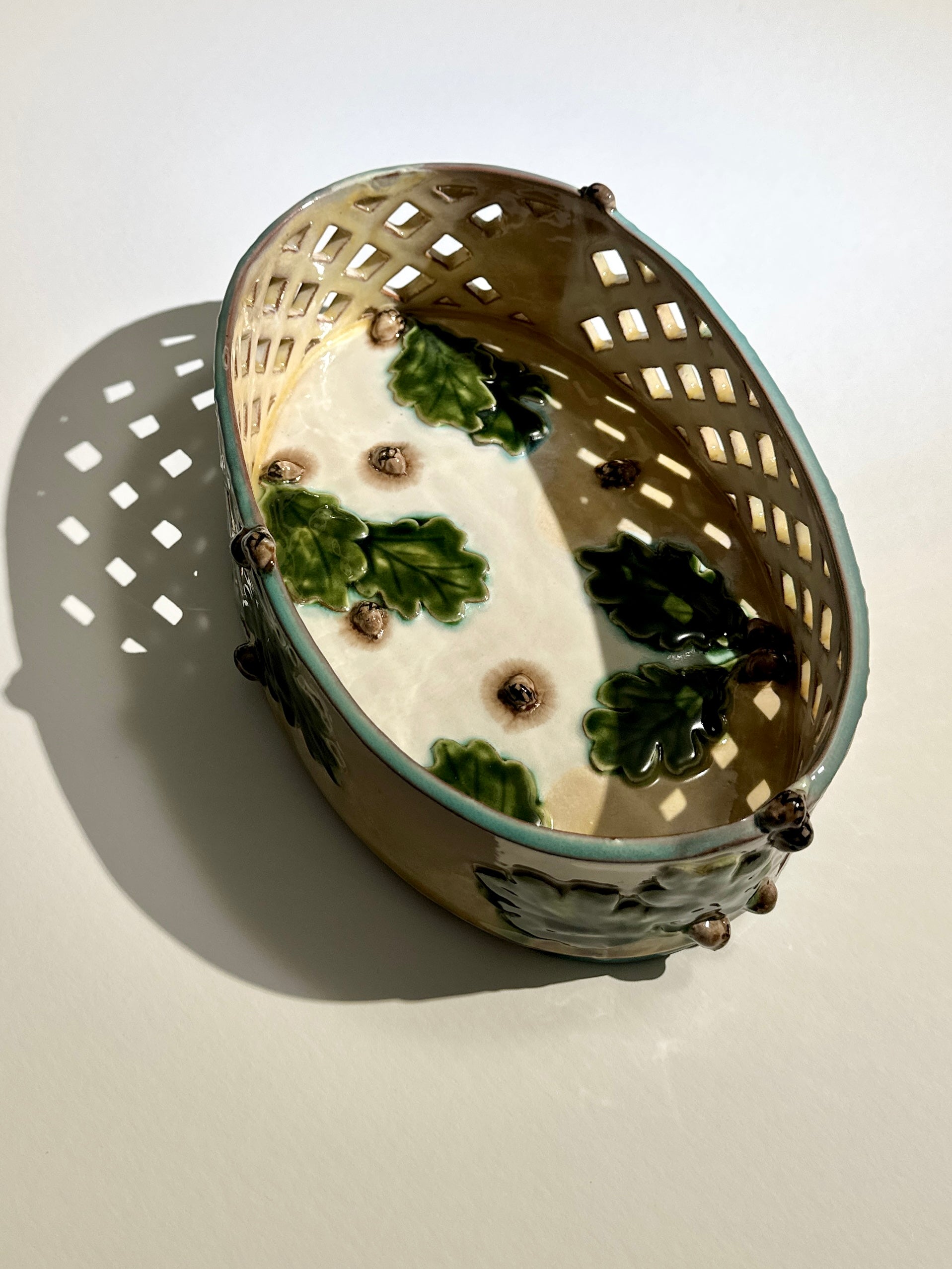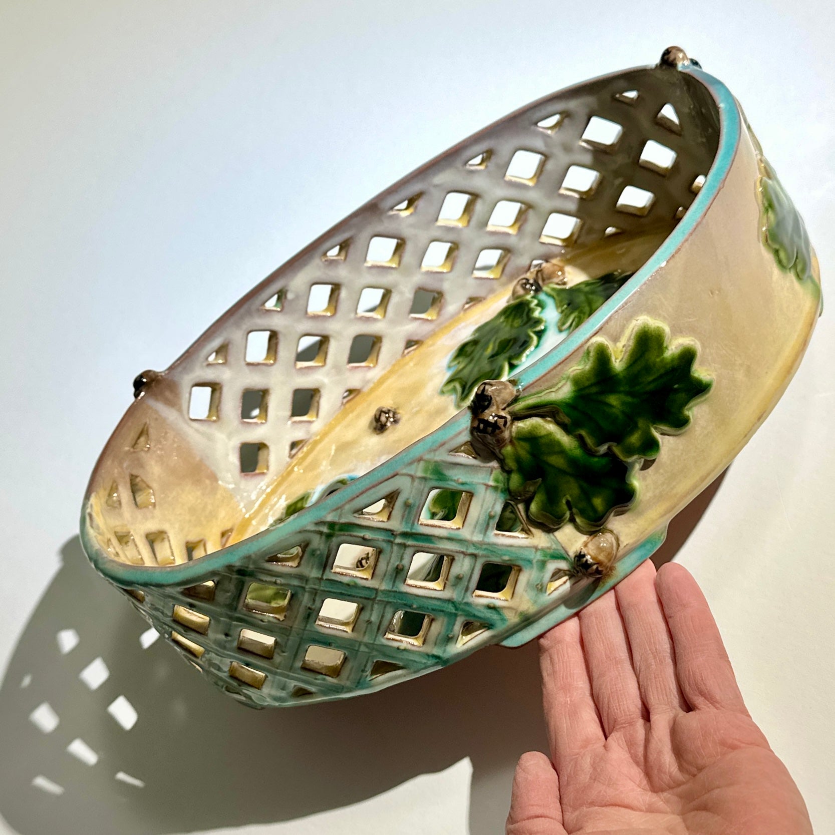 Large sculptural bowl with basket-like cutouts and raised acorn and oak leaf decorations.