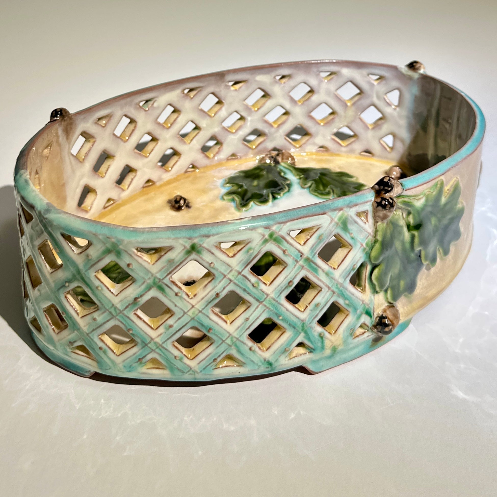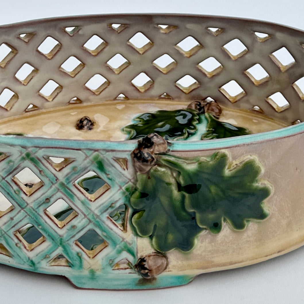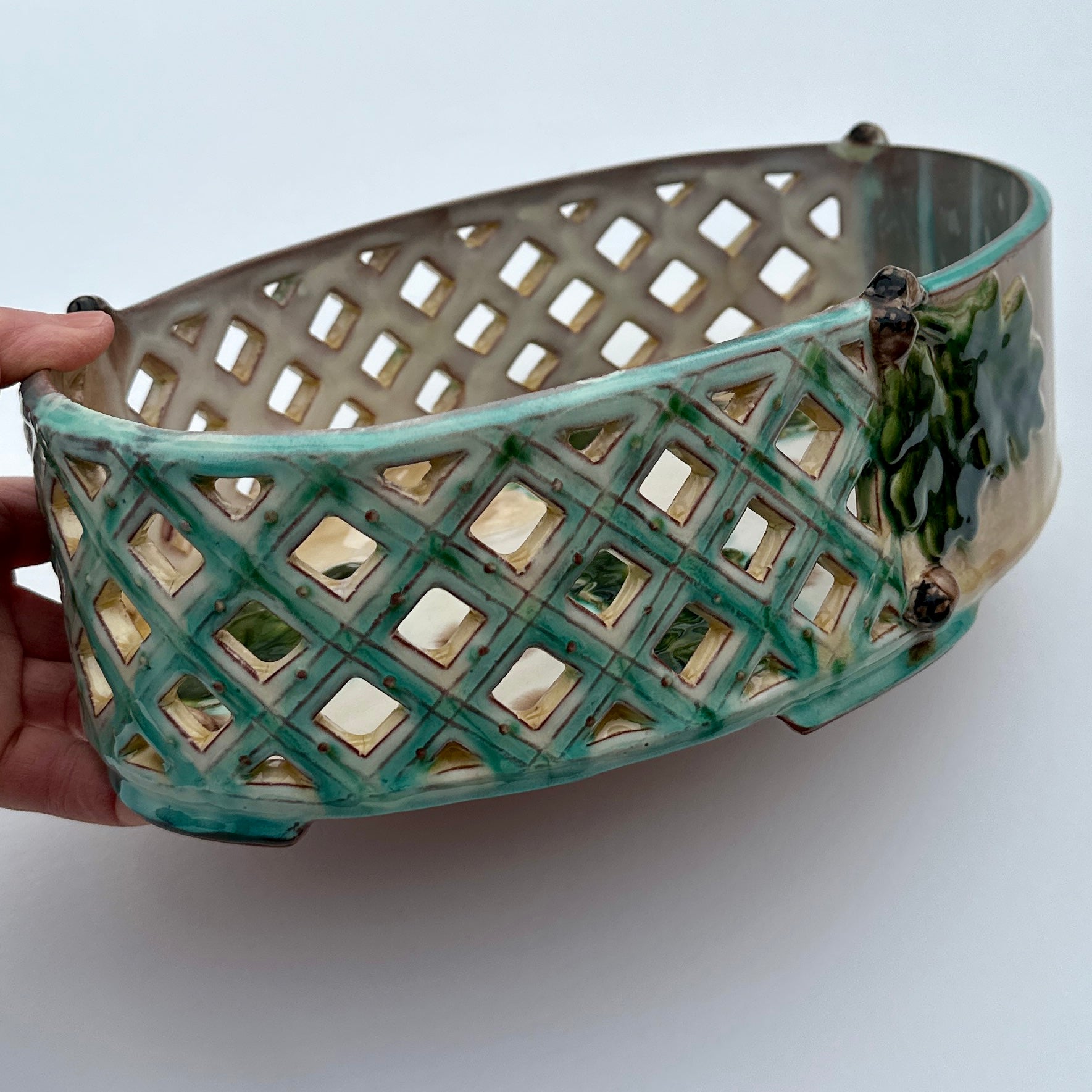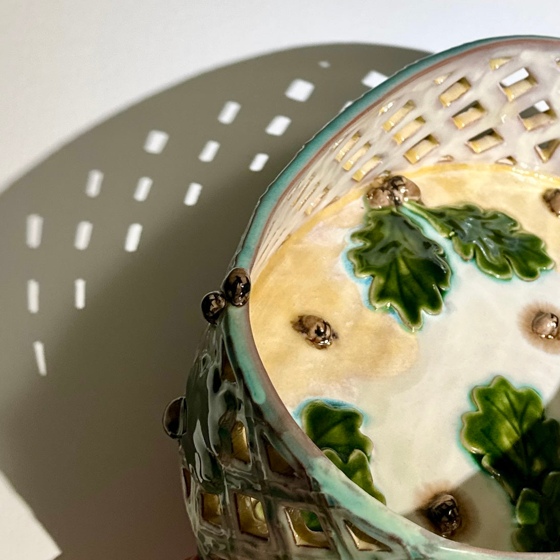 Large sculptural bowl with basket-like cutouts and raised acorn and oak leaf decorations.