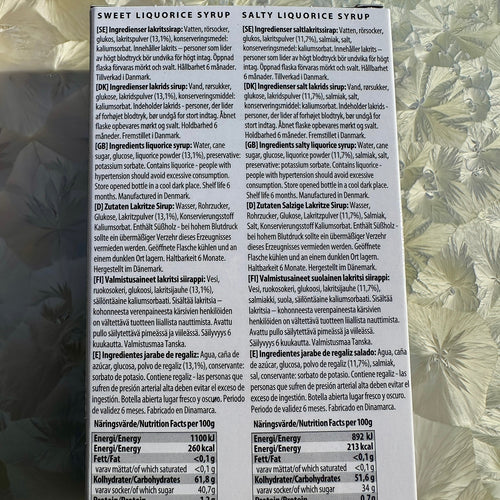 This giftbox contains one bottle of sweet liquorice syrup and one bottle of salty liquorice syrup.