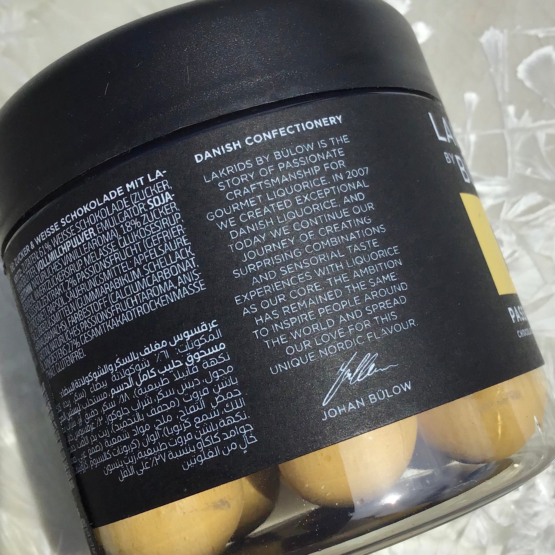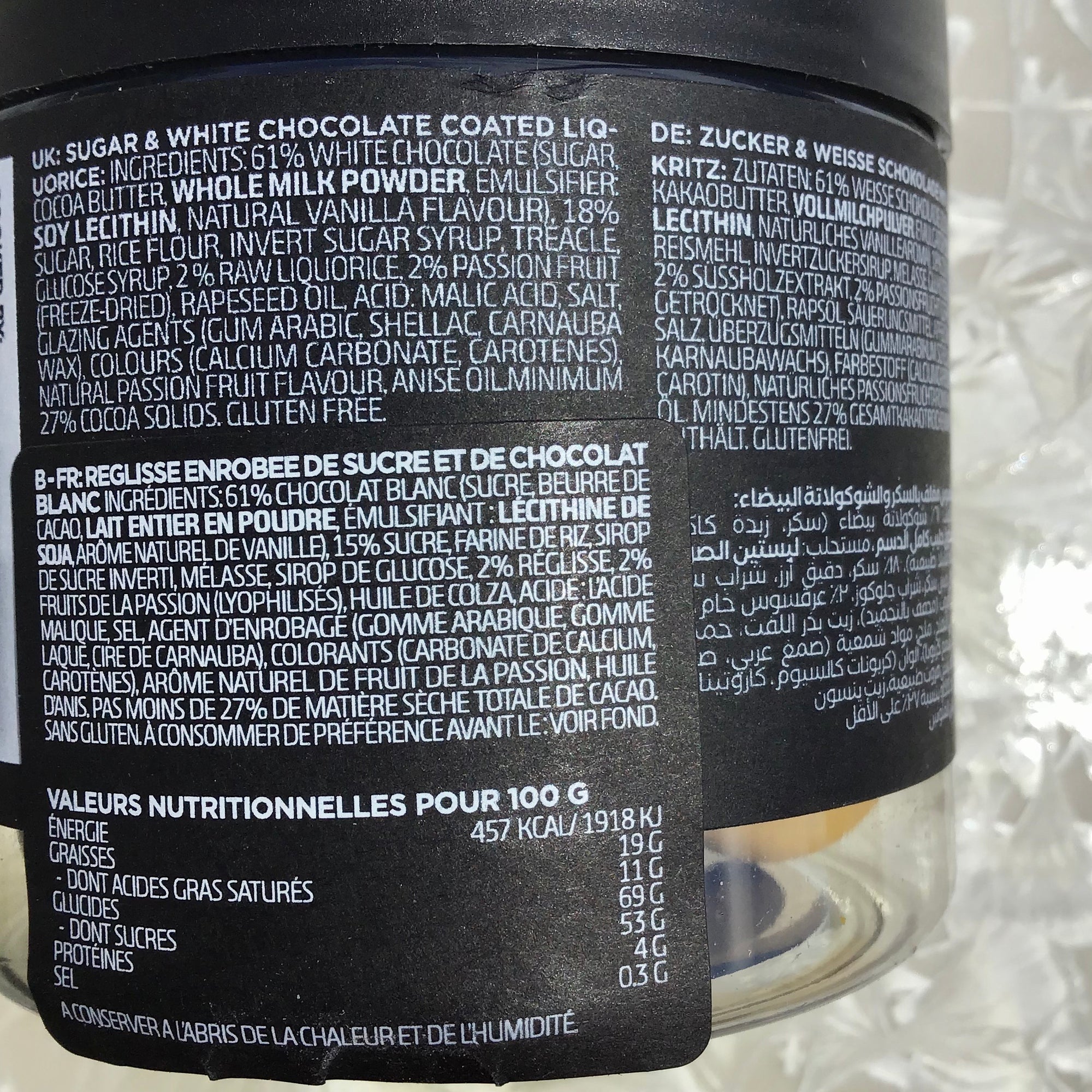 Sweet liquorice coated in exclusive white chocolate and persuasive passion fruit. The acidity of the passion fruit, the sweetness of the chocolate and the ability of the liquorice to unite these flavours gives a perfect bite. Sweet, sour and supreme – enclosed by a delicate, crunchy sugar shell.
