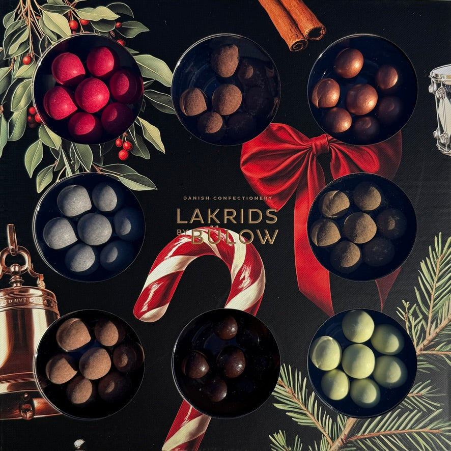 A perfect gift box of 8 different flavours of Lakrids chocolate covered liquorice balls. There are 7-8 pieces of each flavour (350g total).