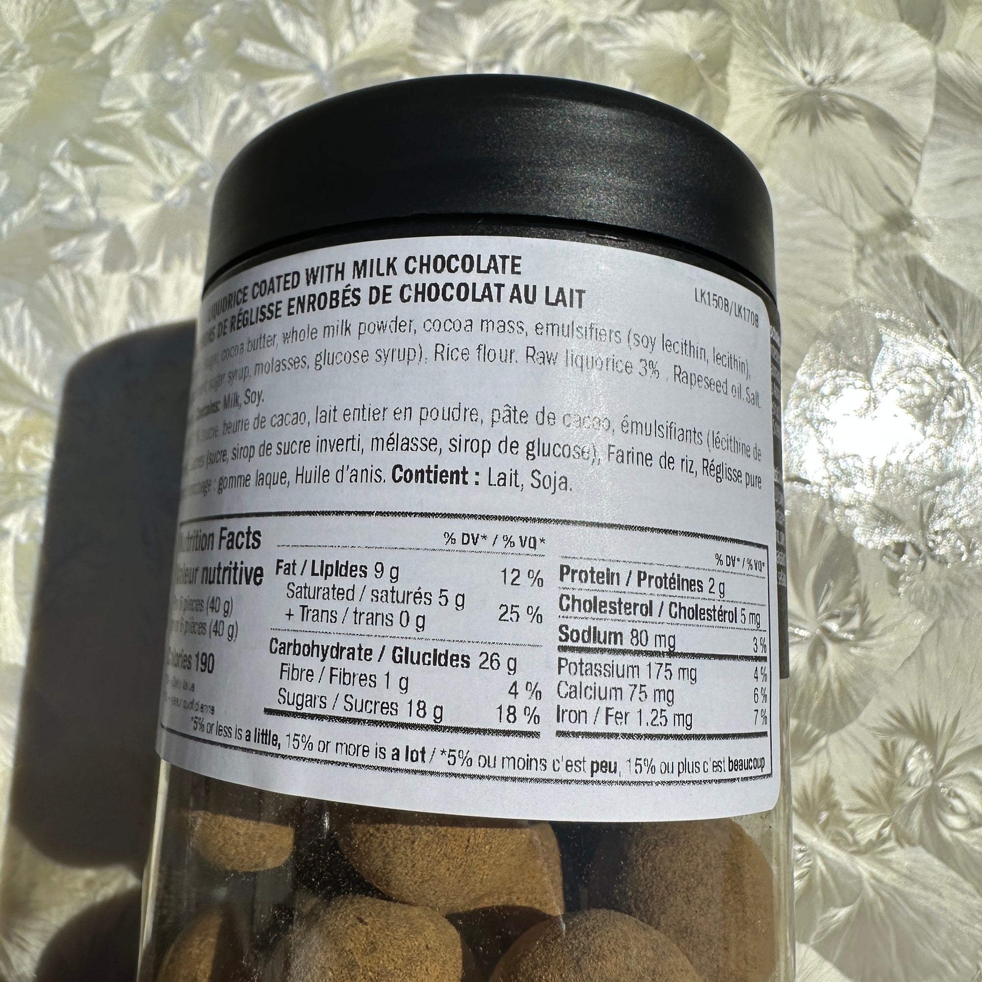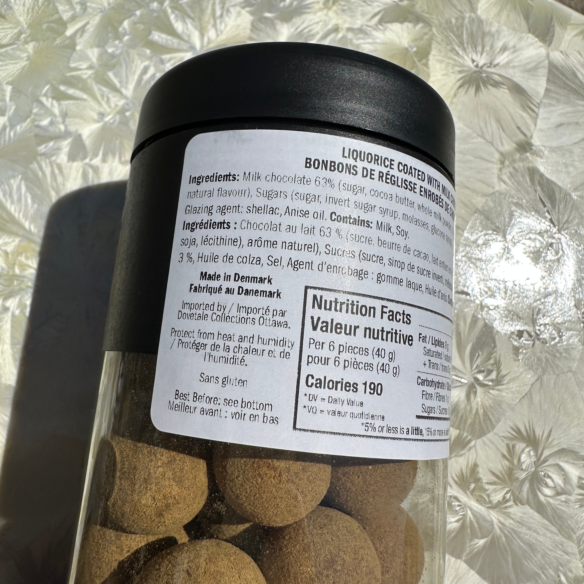 Black liquorice coated in milk chocolate.
