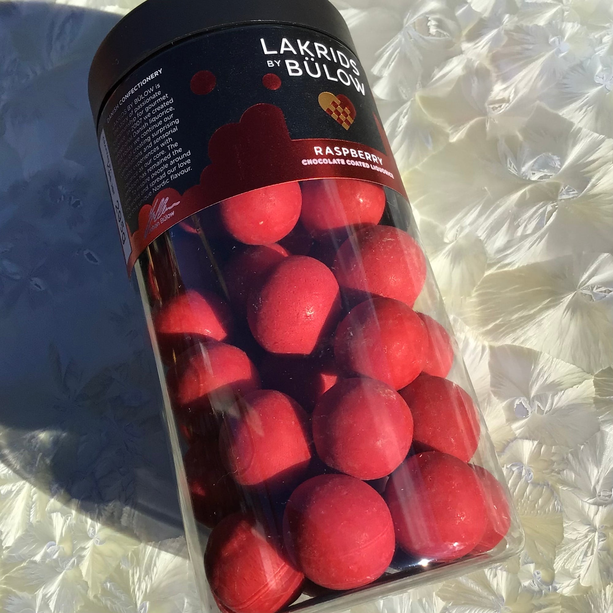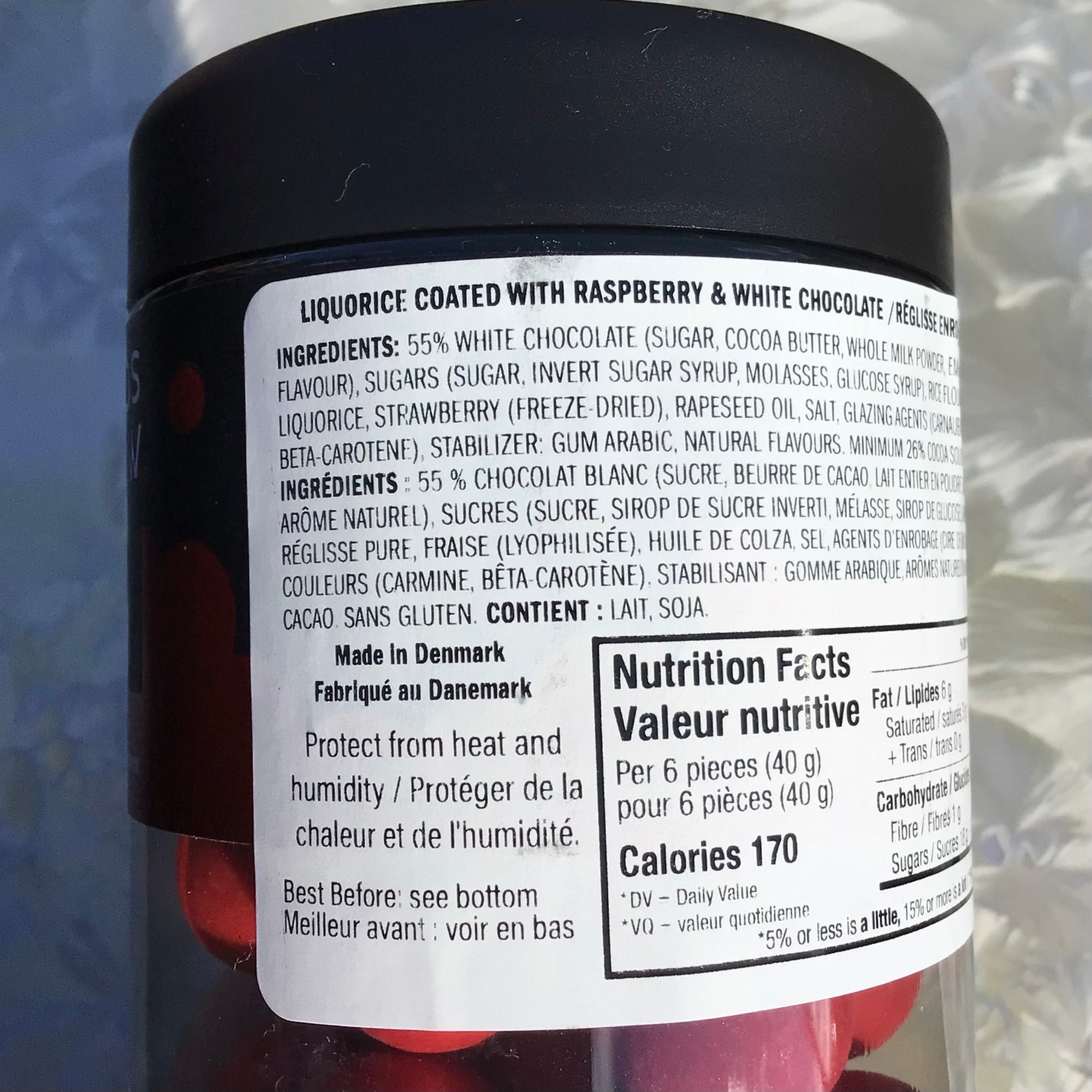 Made in Denmark. This chocolate covered liquorice with raspberry flavour!
