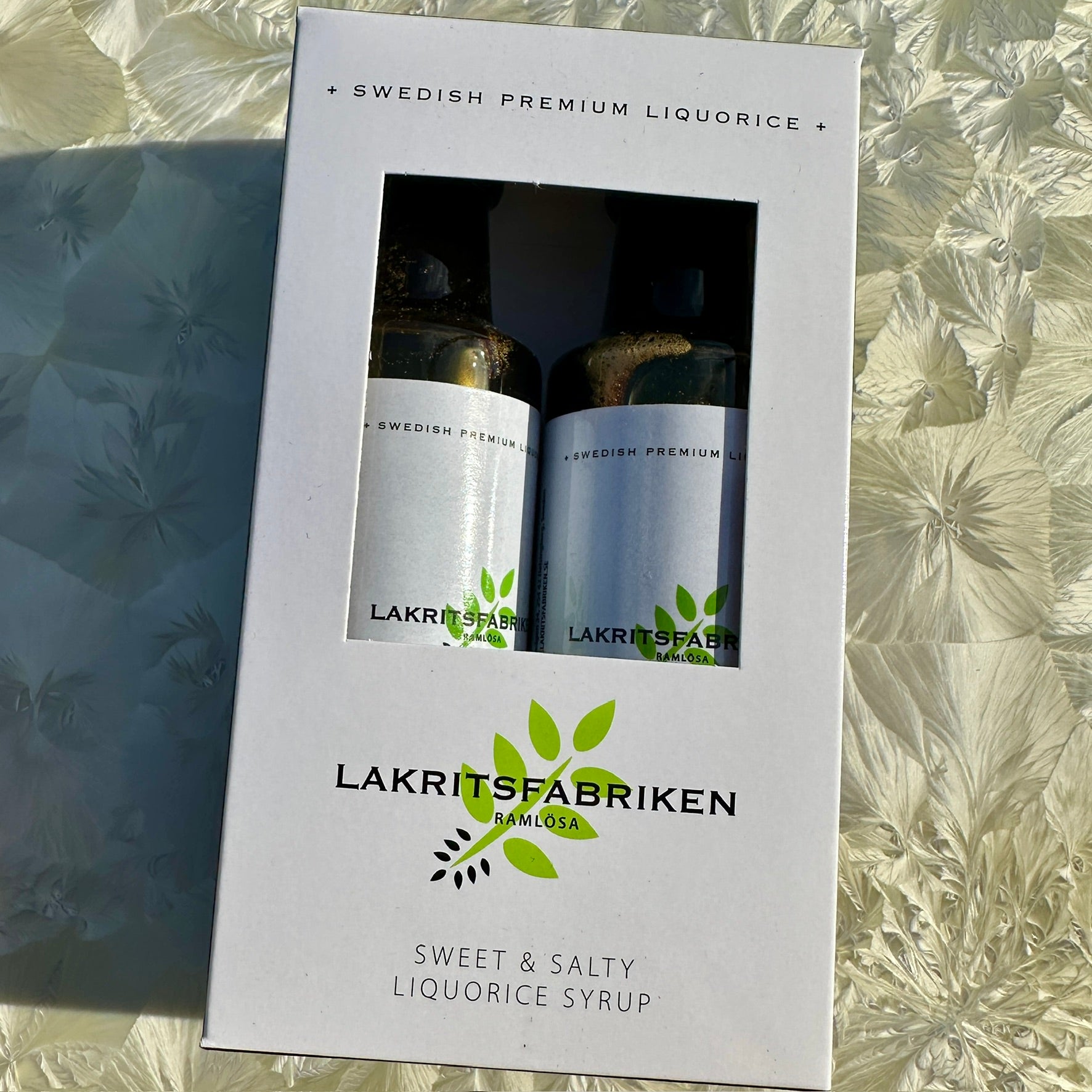 This giftbox contains one bottle of sweet liquorice syrup and one bottle of salty liquorice syrup.