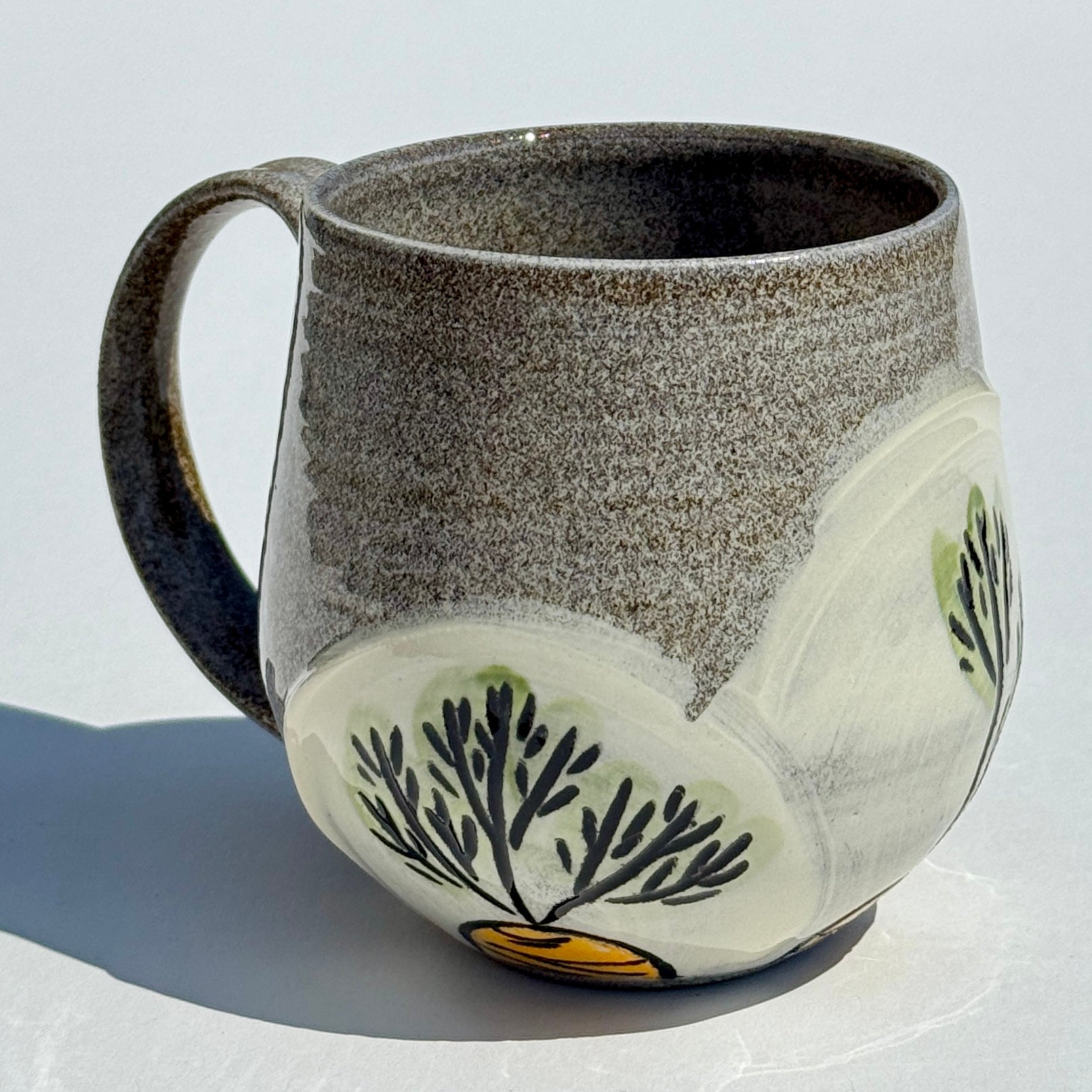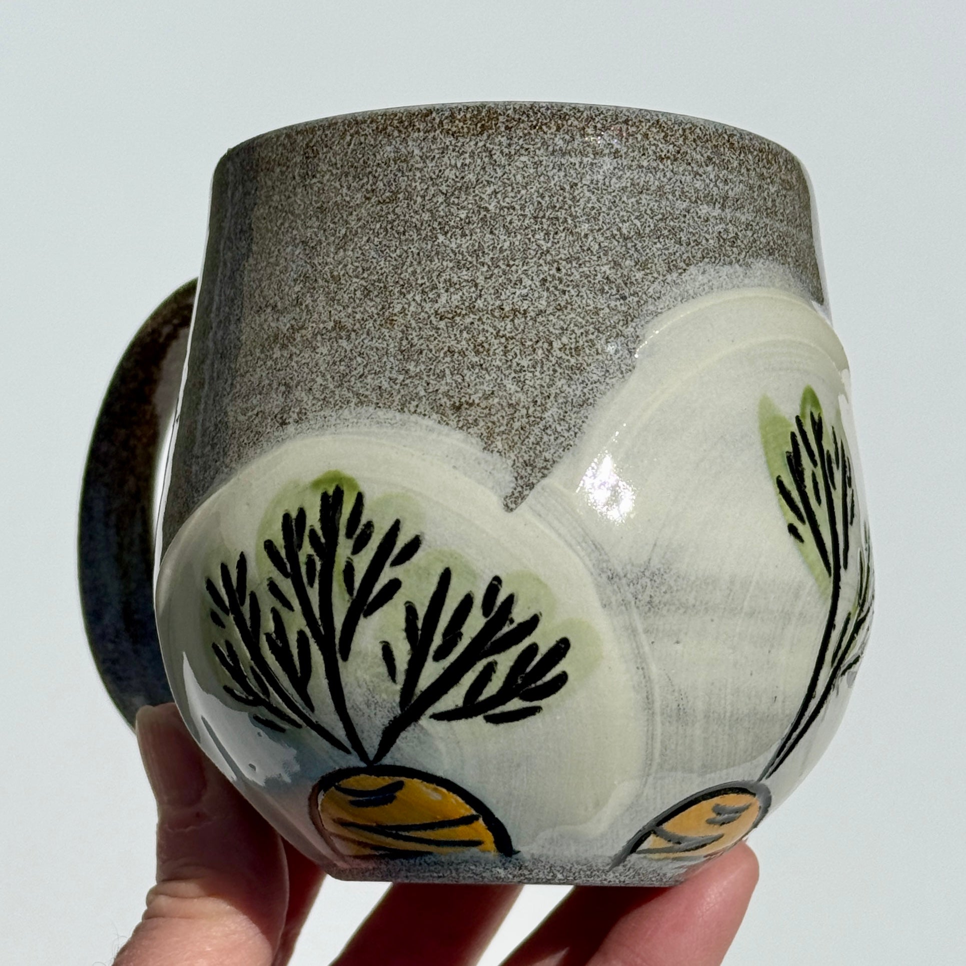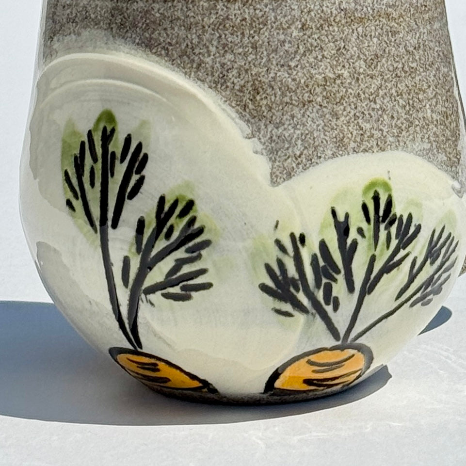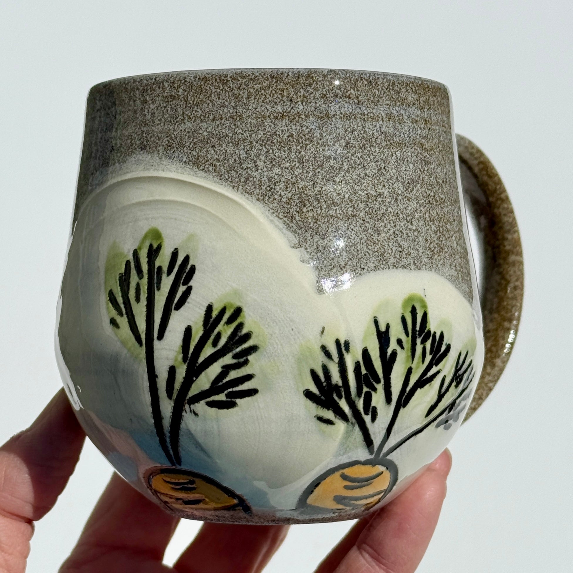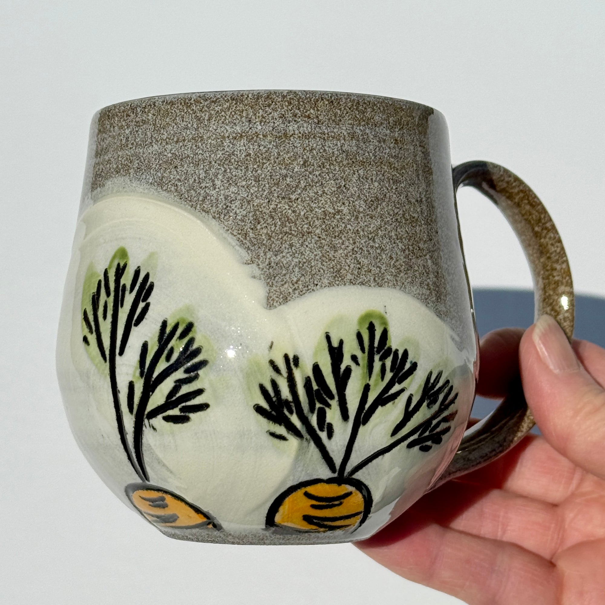 This round mug made with granite coloured clay features root vegetables over white slip.
