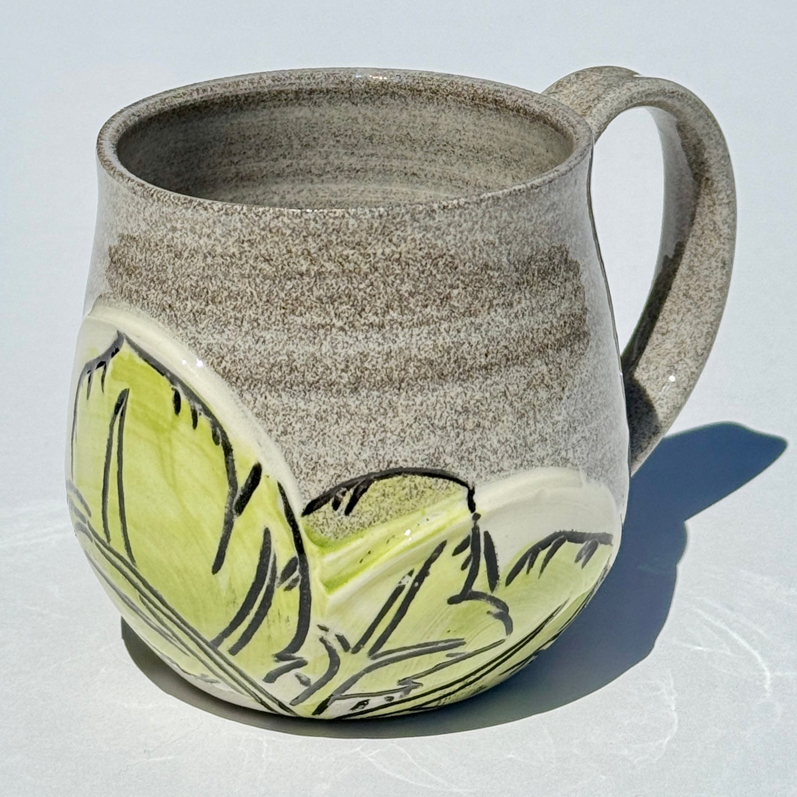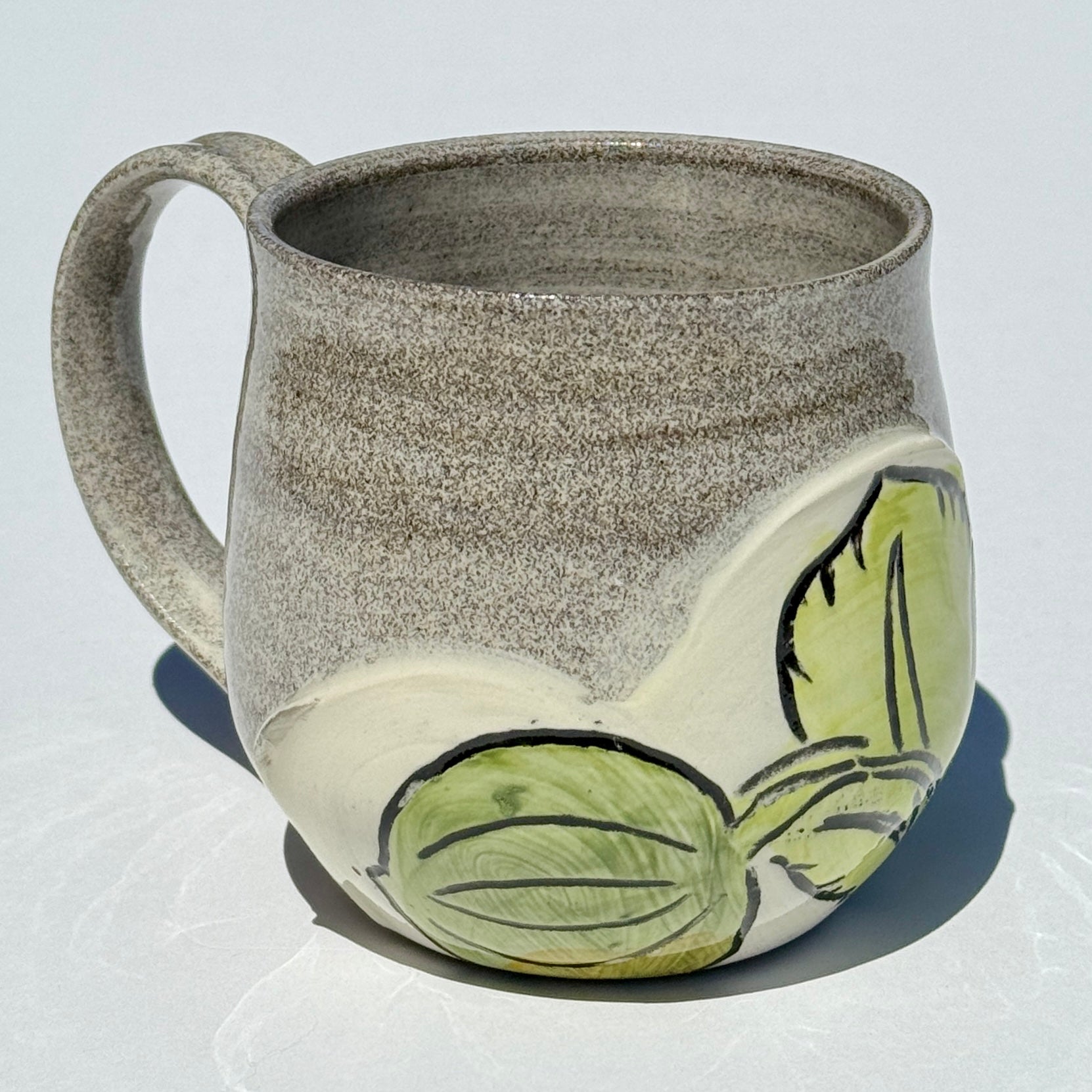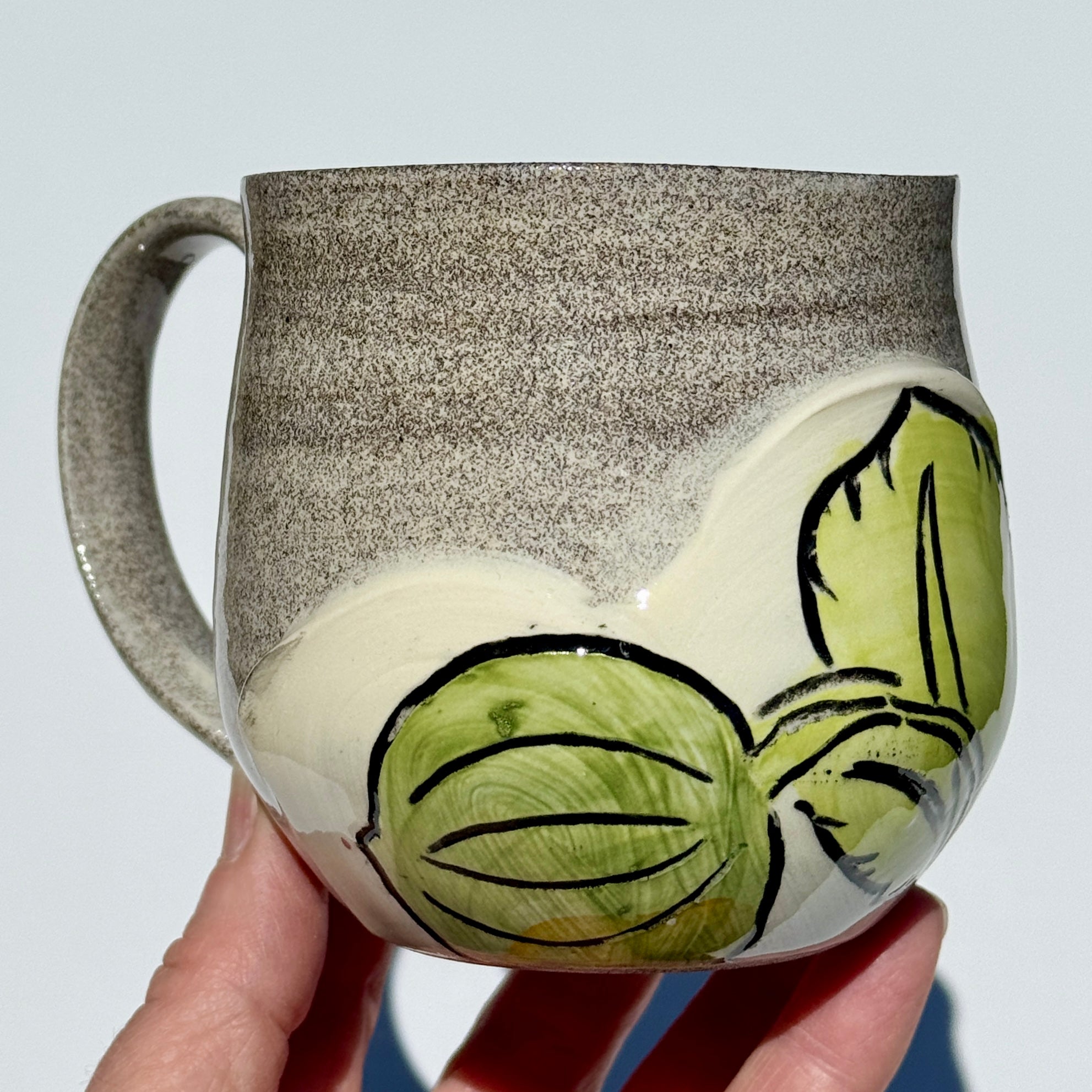 This round mug made with granite coloured clay features a squash plant over white slip.