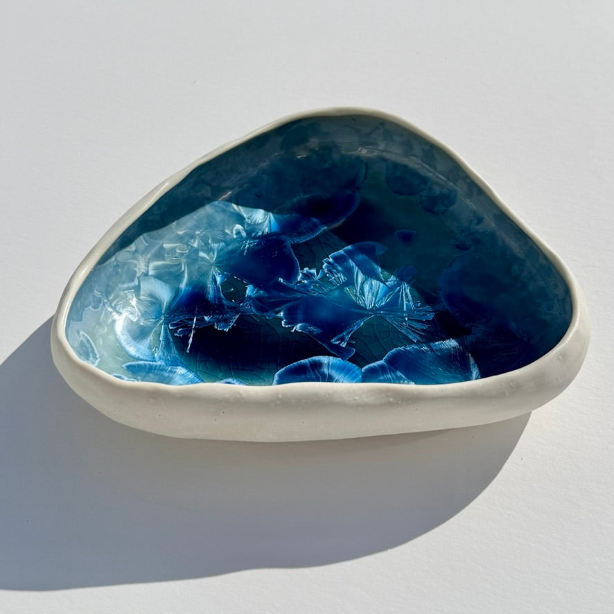 Pinch Pots are one of the simplest pottery forms.  Alexis combines one of the simplest forms with one of the most complex glazes in creating this design. Porcelain clay is "pinched" into a bowl shape and then laid to rest on a beach rock while it dries.  The crystalline glaze pools in the bottom of the bowl to look like a puddle of water and ice.