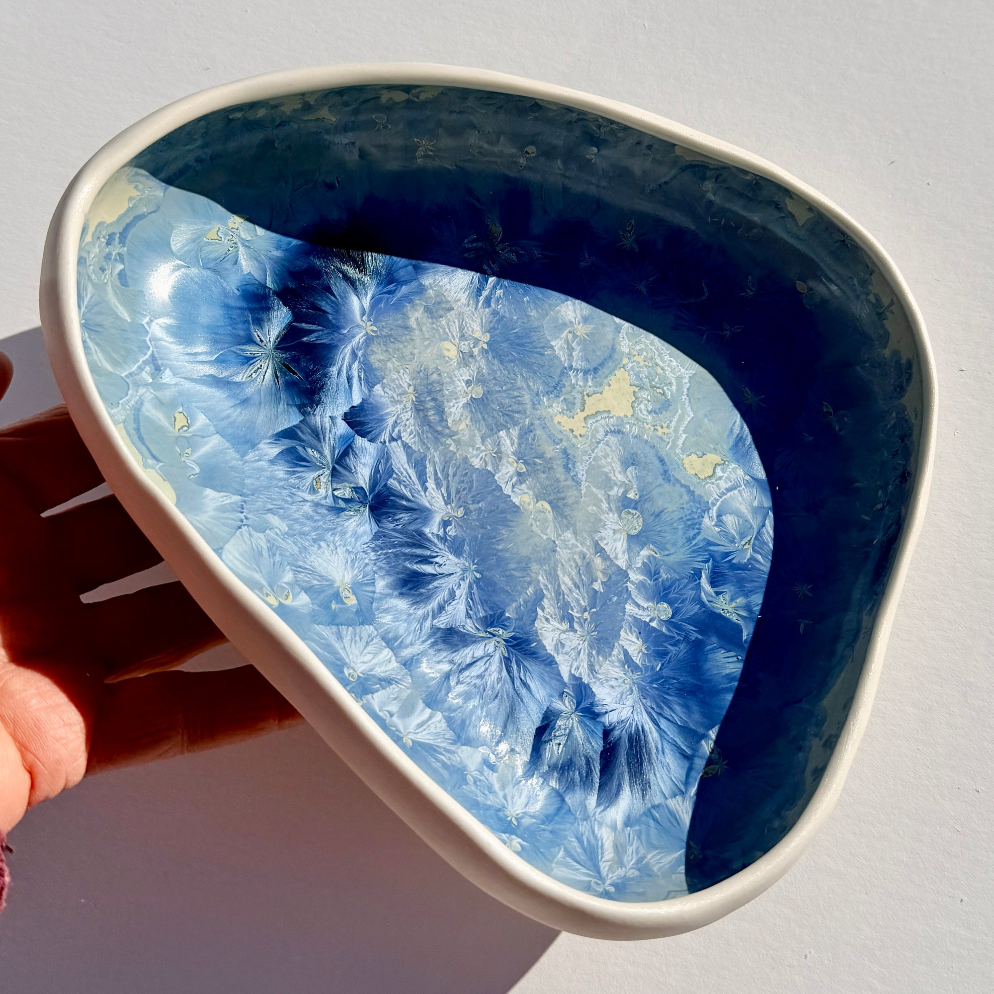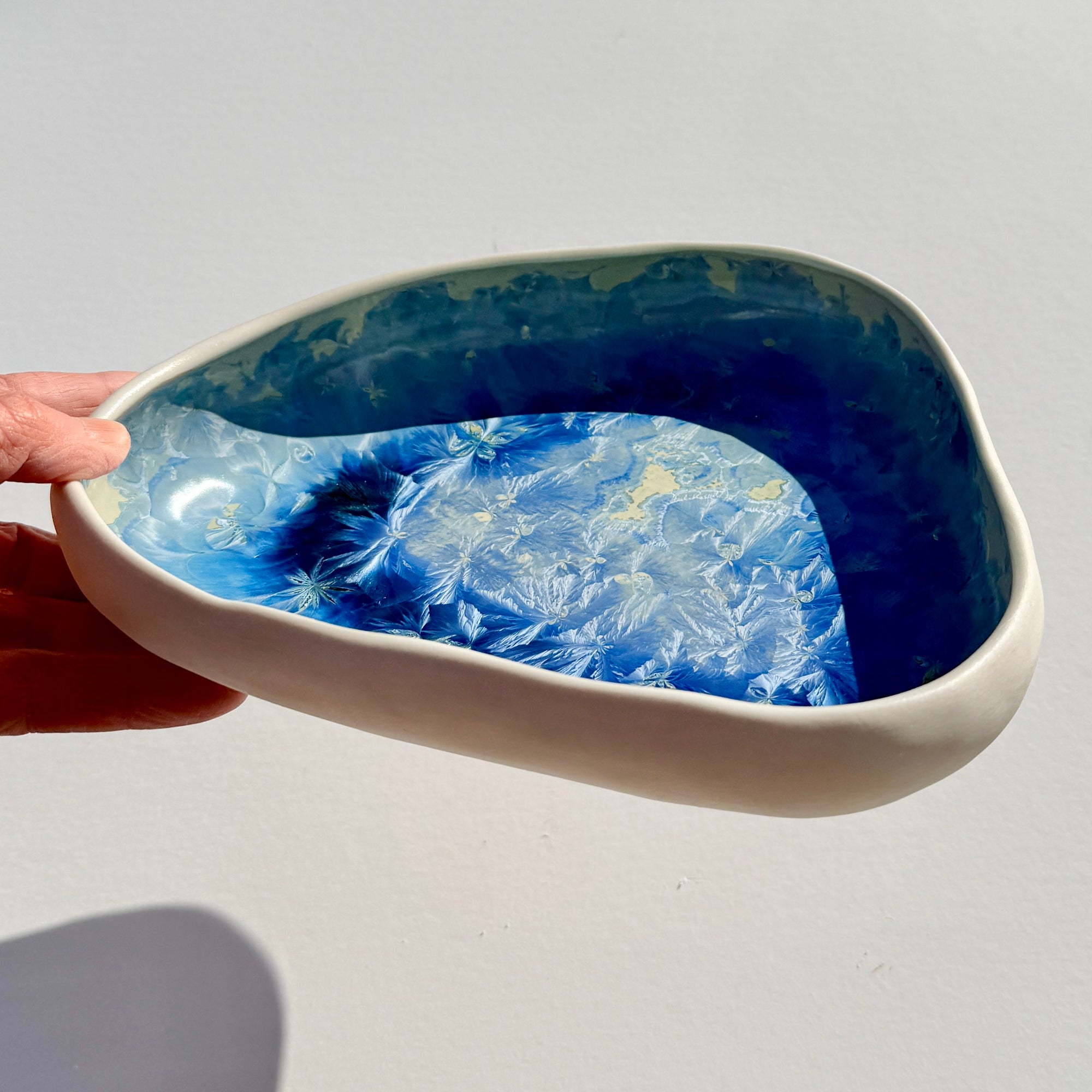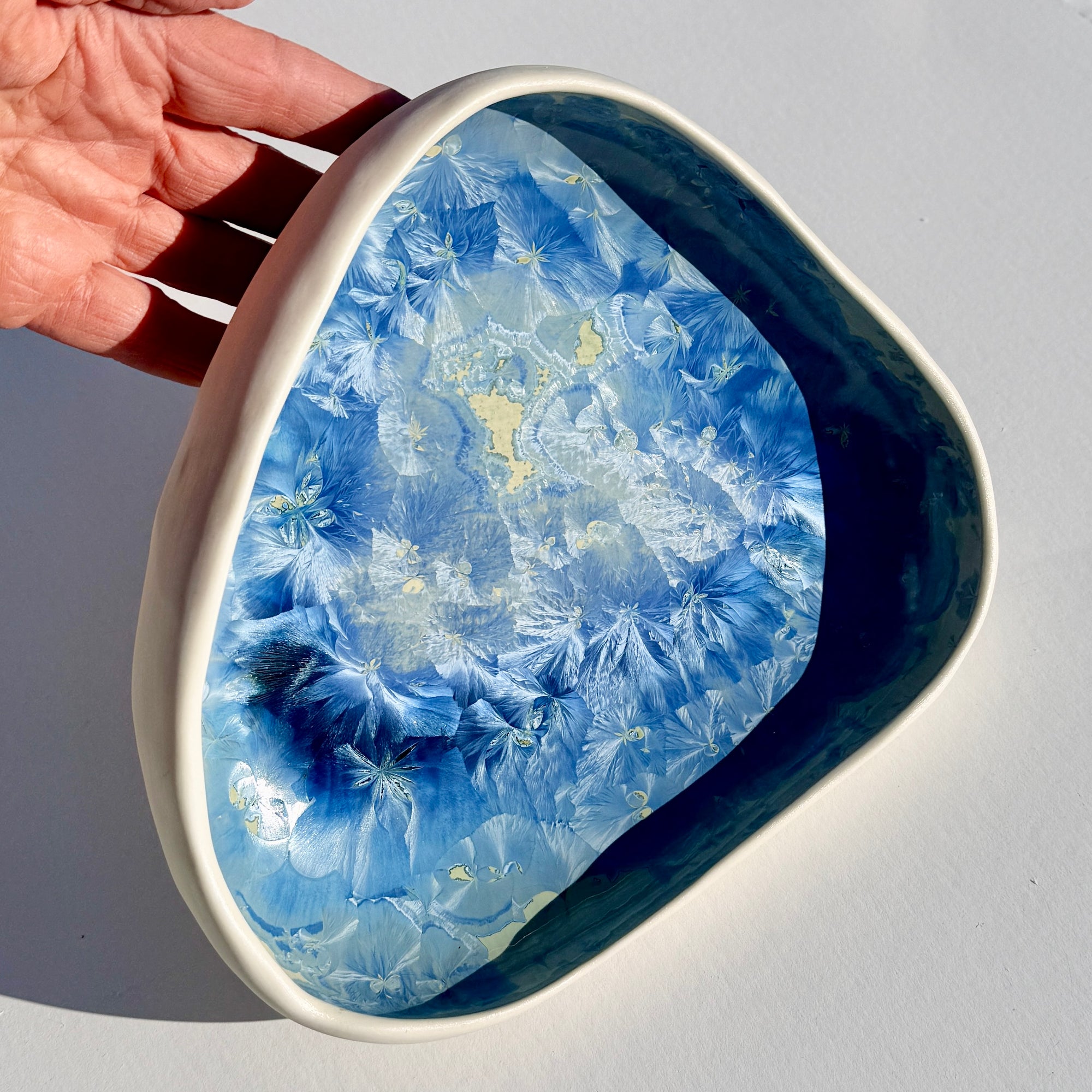 Pinch Pots are one of the simplest pottery forms.  Alexis combines one of the simplest forms with one of the most complex glazes in creating this design. Porcelain clay is "pinched" into a bowl shape and then laid to rest on a beach rock while it dries.  The crystalline glaze pools in the bottom of the bowl to look like a puddle of water and ice.