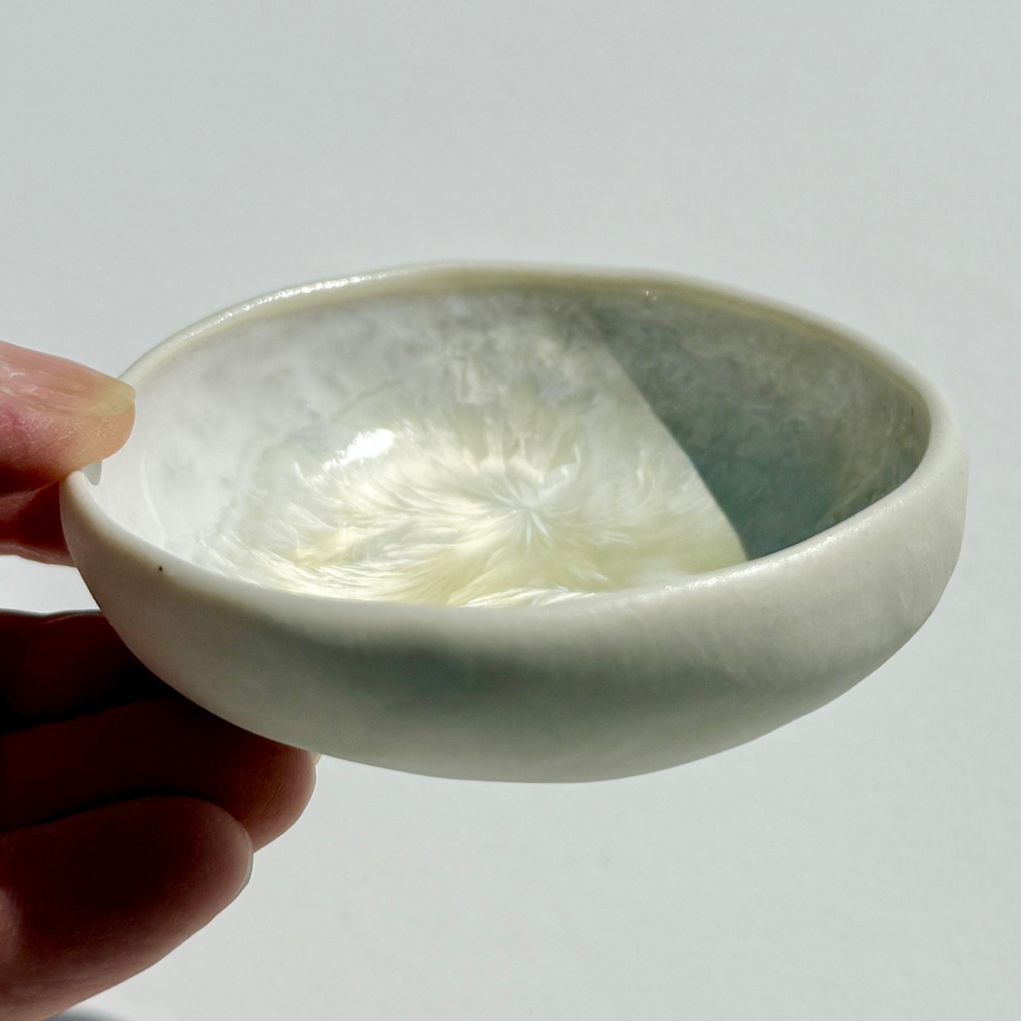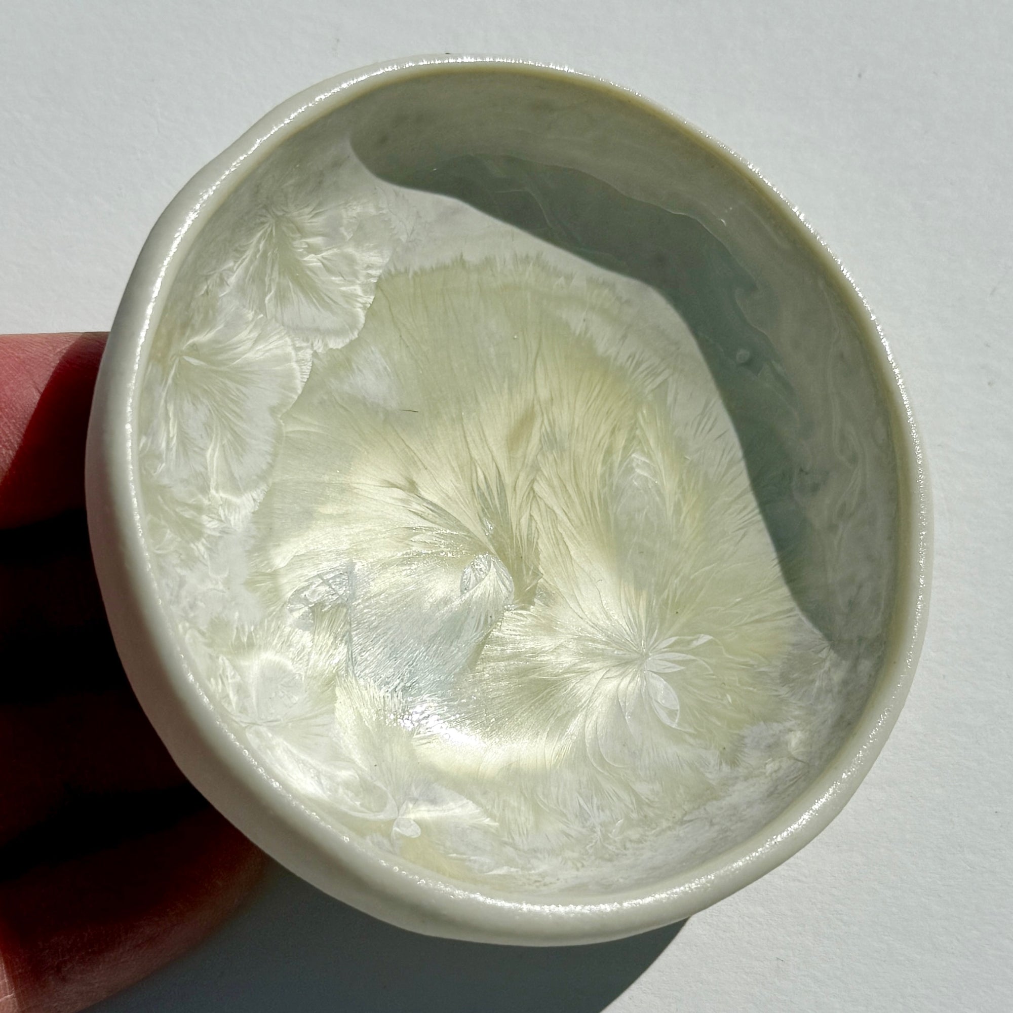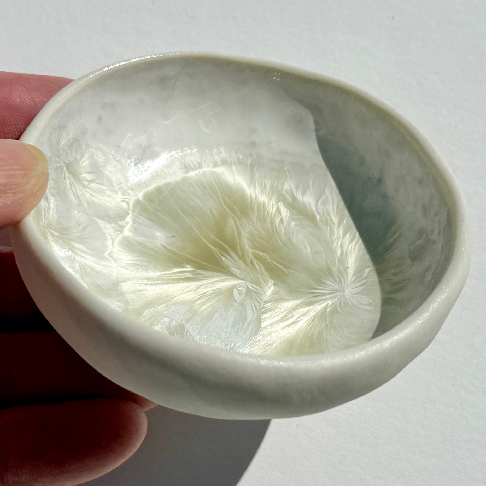 Pinch Pots are one of the simplest pottery forms. Alexis combines one of the simplest forms with one of the most complex glazes in creating this design. Porcelain clay is "pinched" into a bowl shape and then laid to rest on a beach rock while it dries. The crystalline glaze pools in the bottom of the bowl to look like a puddle of water and ice.