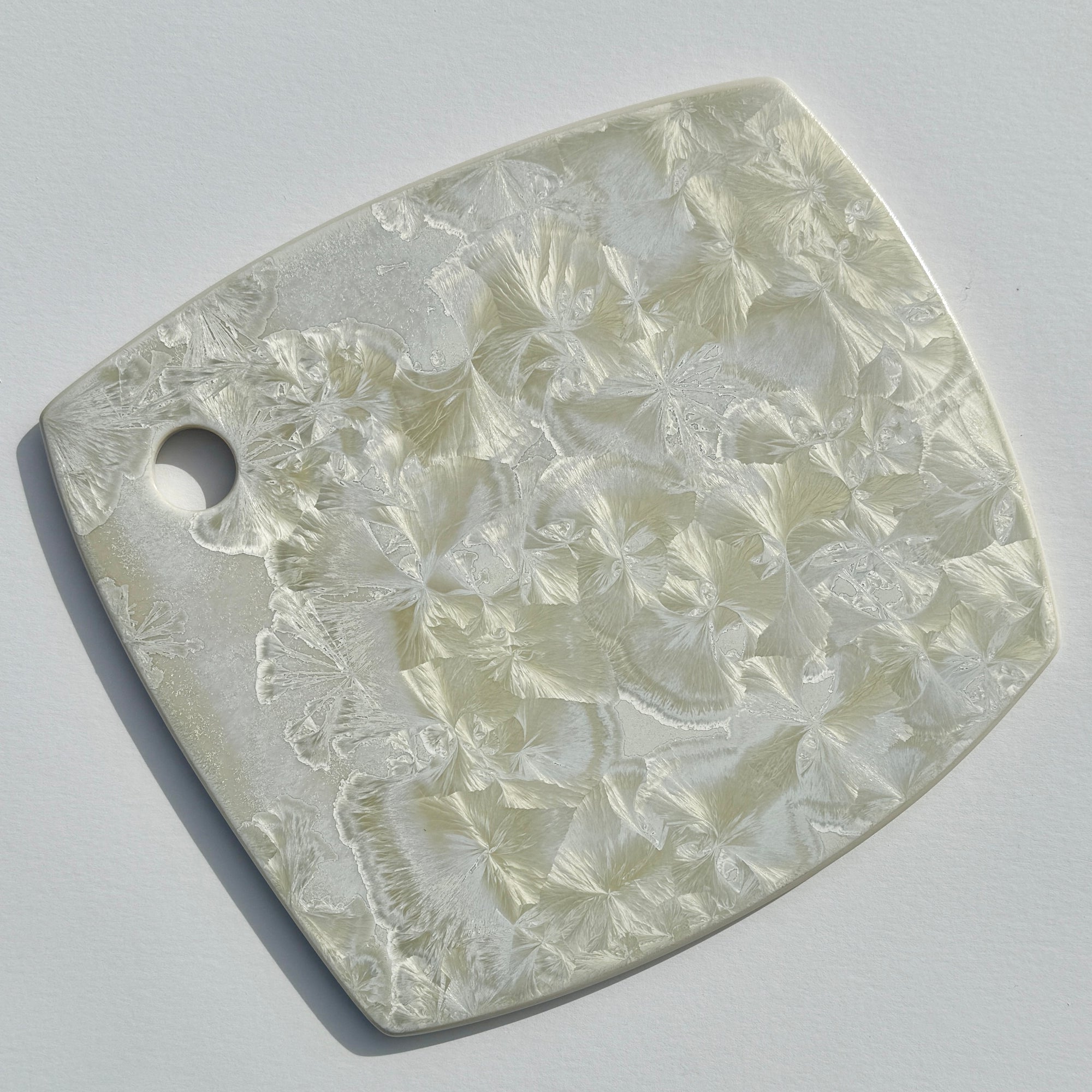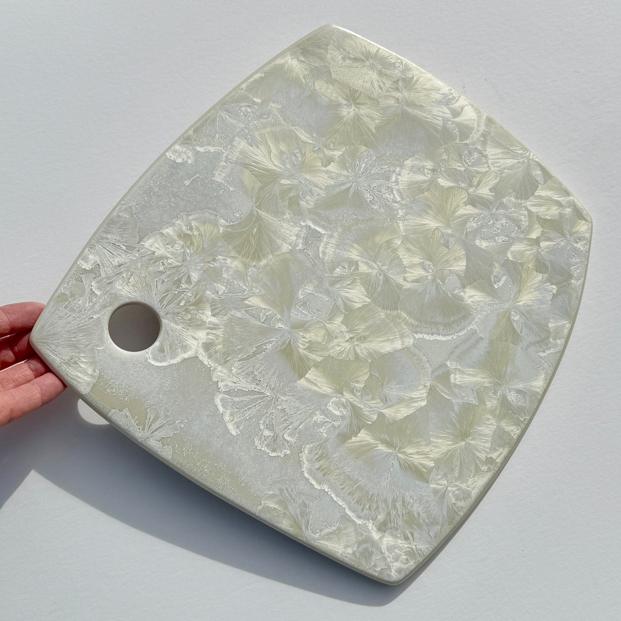 This large white crystalline glazed charcuterie platter measures approximately 30 by 28 centimetres.