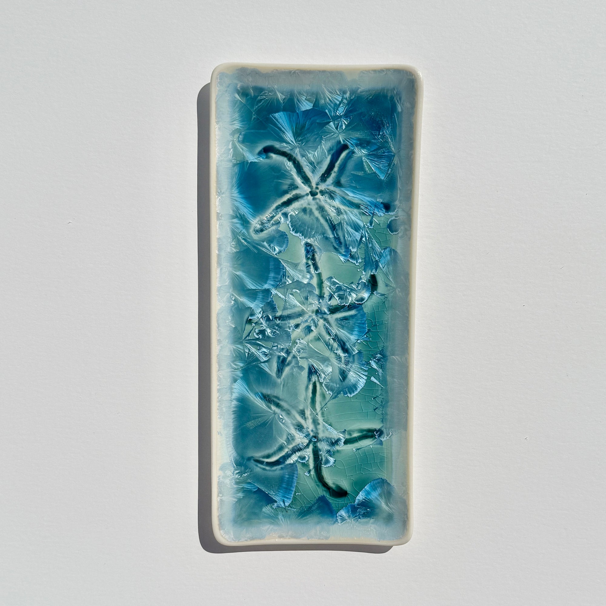 Turquoise crystalline rectangular platter with starfish impressed in the porcelain clay.