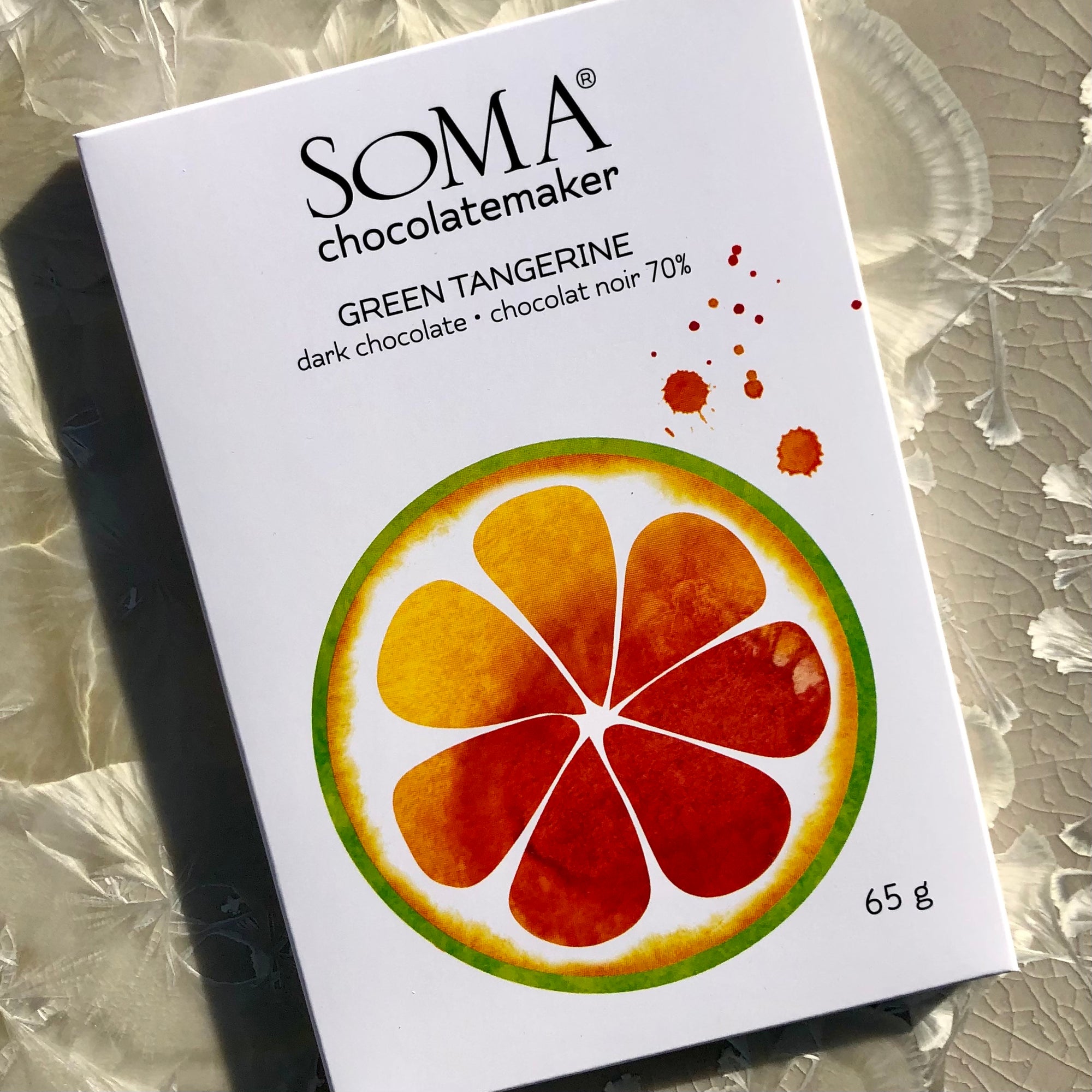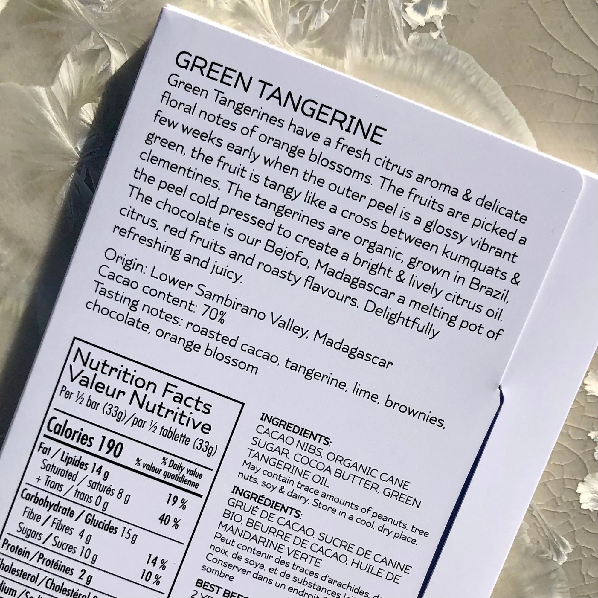 Green tangerines originating from South East Asia have a beautiful floral citrus aroma tasting like a cross between a kumquat and a clementine. The chocolate is made with cacao from Madagascar. The two together make a bar that is delightfully refreshing and juicy in flavour.