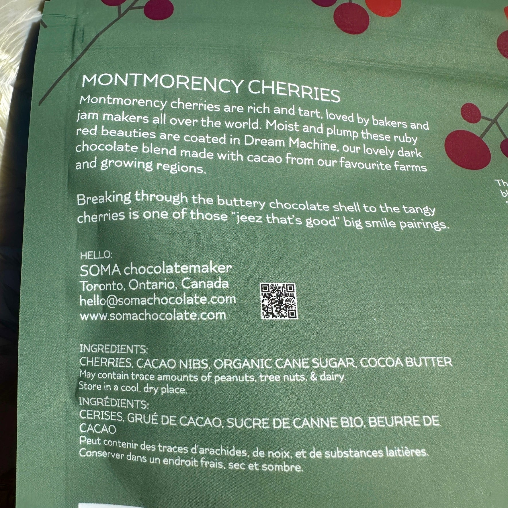 Montmorency cherries are rich and tart loved by bakers and jam makers all over the world. Moist and plump these ruby red beauties are coated in Dream Machine, our lovely dark chocolate blend made with cacao from our favourite farms and growing regions.