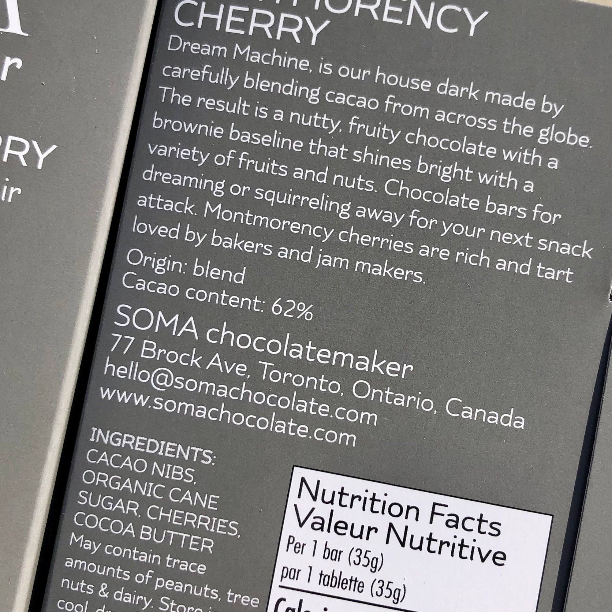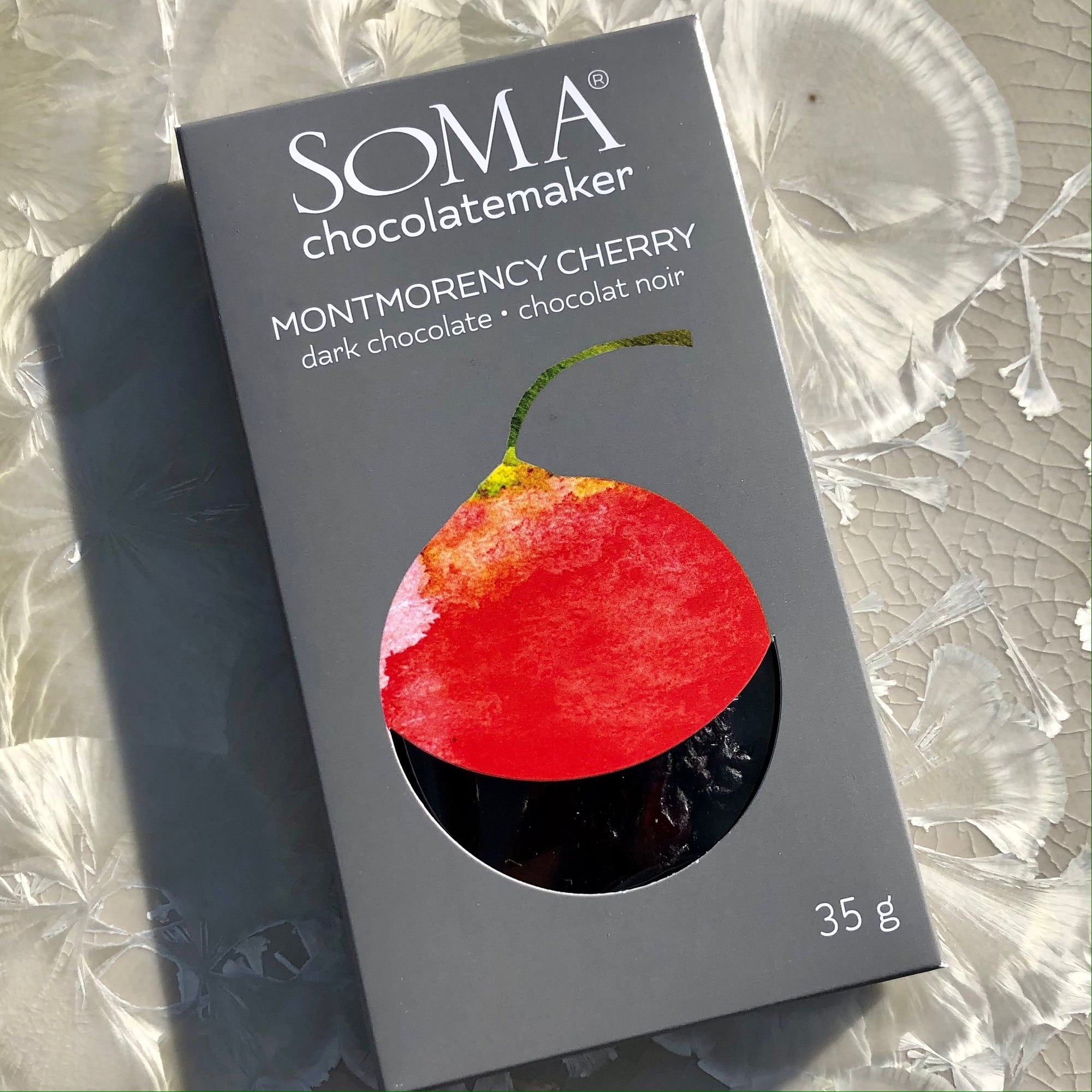 Montmorency Cherries are beautifully tart and puckery, sun-dried until chewy and intense. We lay these beauties by hand onto a base of great dark chocolate.