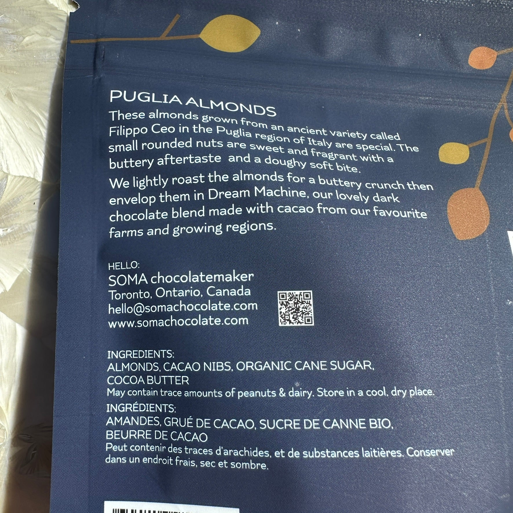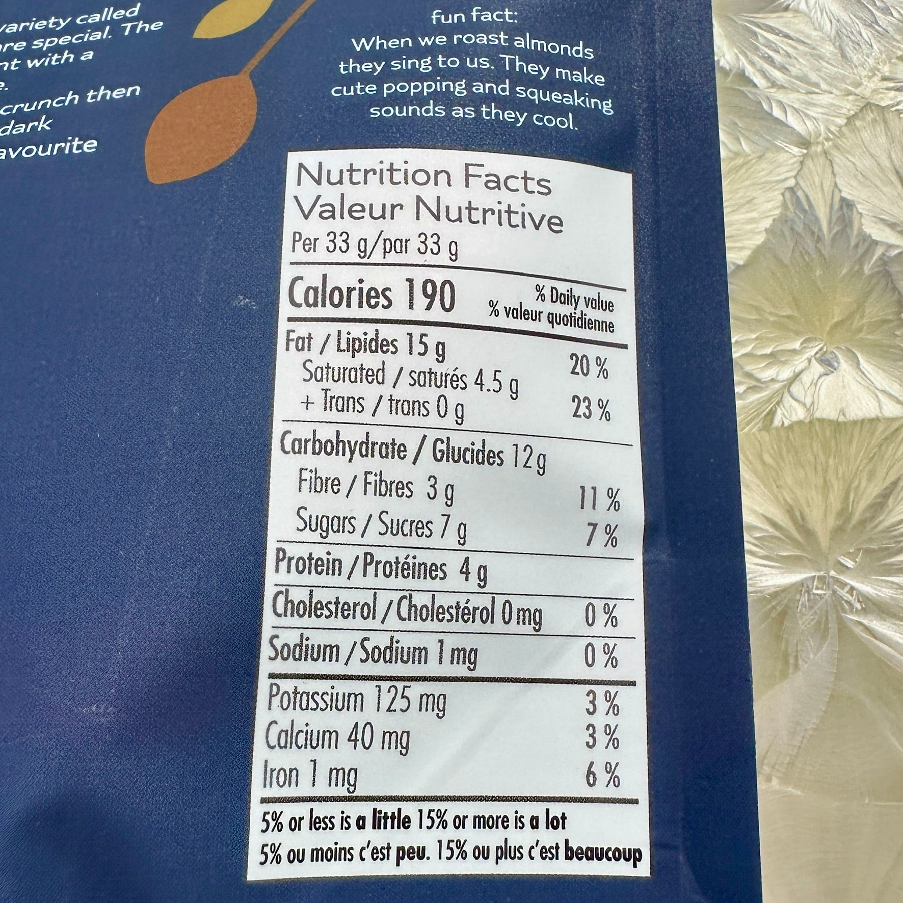 We light roast the almonds for a buttery crunch then envelop them in Dream Machine, our lovely dark chocolate blend made with cacao from our favourite farms and growing regions.