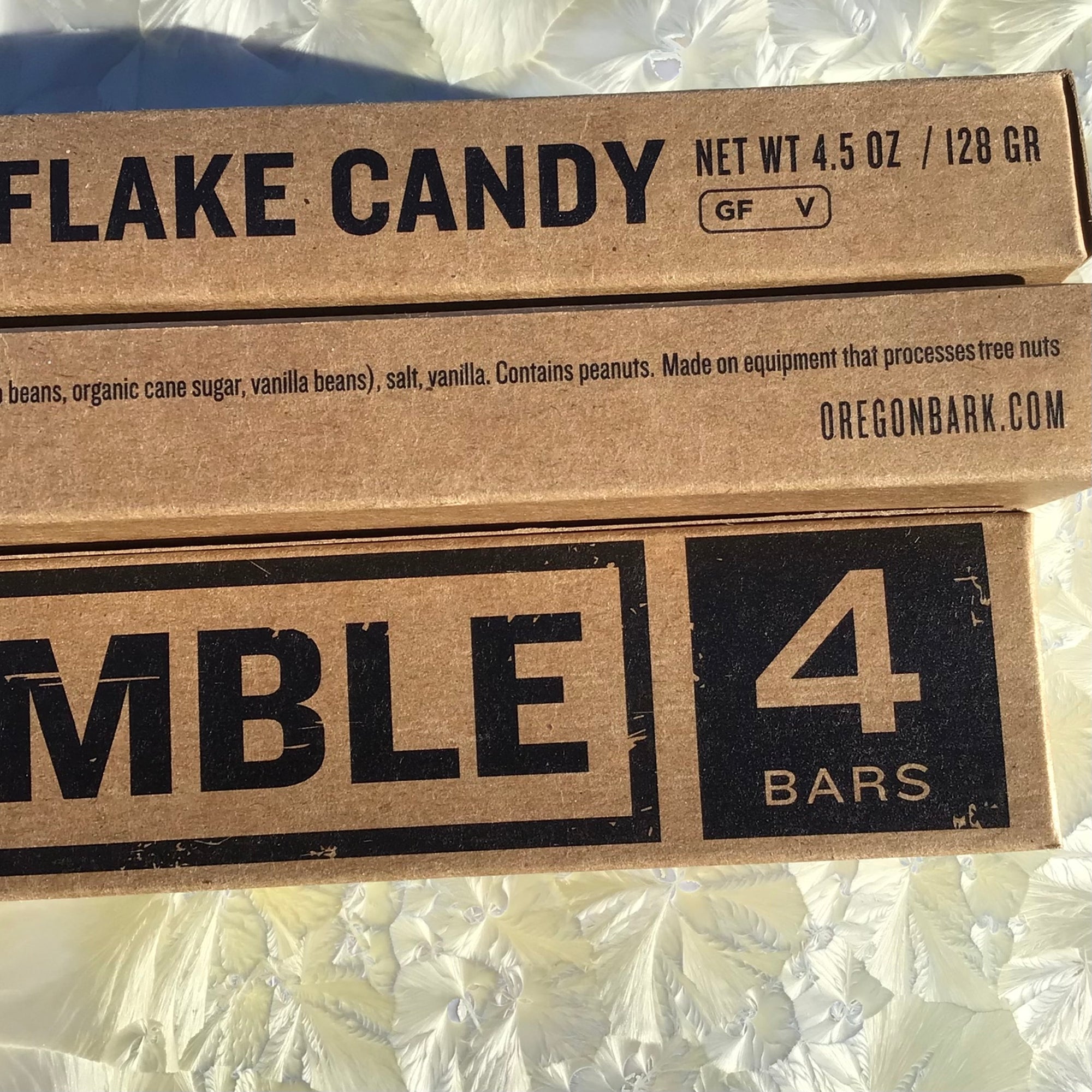 Peanut butter flake candy in a dark chocolate shell. Box contains two nutty bars and two smooth bars!
