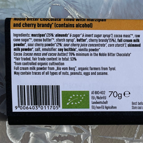 A balanced dark chocolate filled with cherry brandy. In the first layer the brandy melts together with marzipan and in the second layer with a light butter ganache.